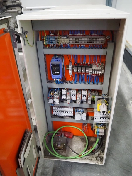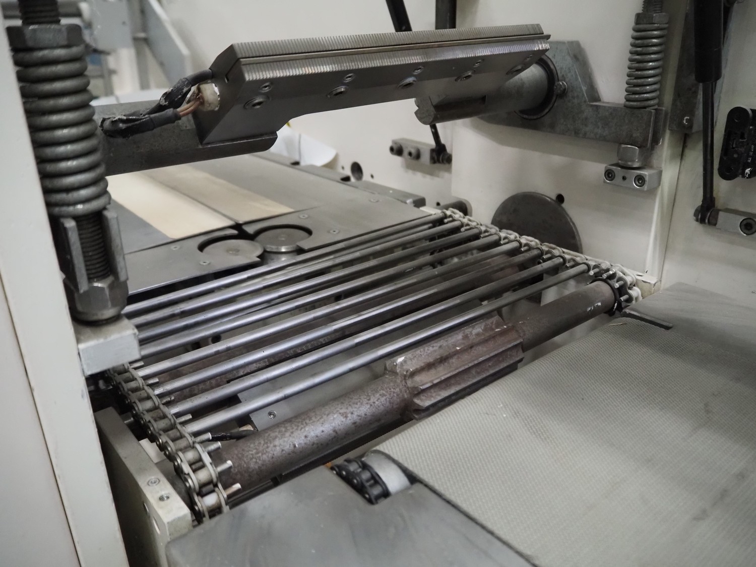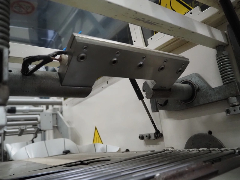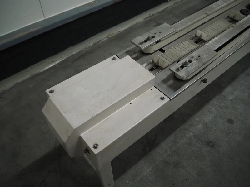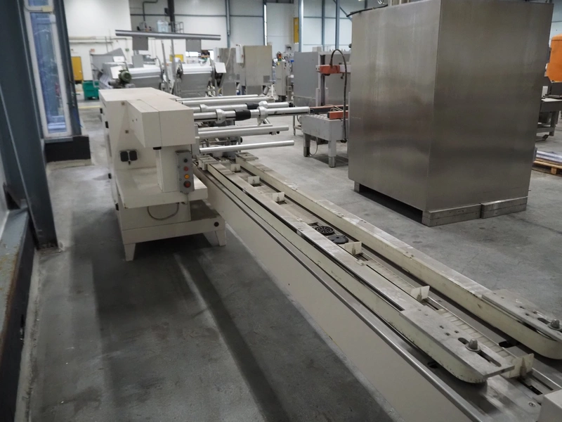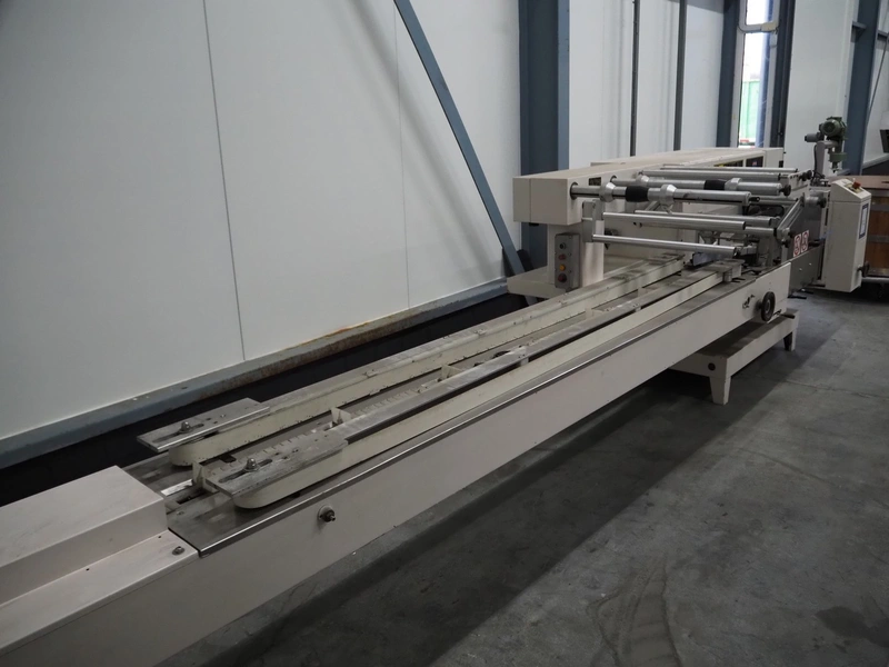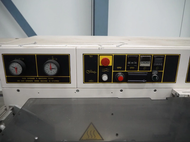 Ilapak Italia S.p.a. flowpacker, type: UNO, serial number: 061 96, year of construction: 4/1996, 380 V, 50 Hz, 5000 W, plastic infeed belt with dividers, belt width: 100 mm, divider height: 55 mm, distance between dividers: 430 mm, seal width: 250 mm, plastic outfeed belt, belt width: 240 mm, total dimensions: 5900 mm x 1300 mm x 1310 mm.