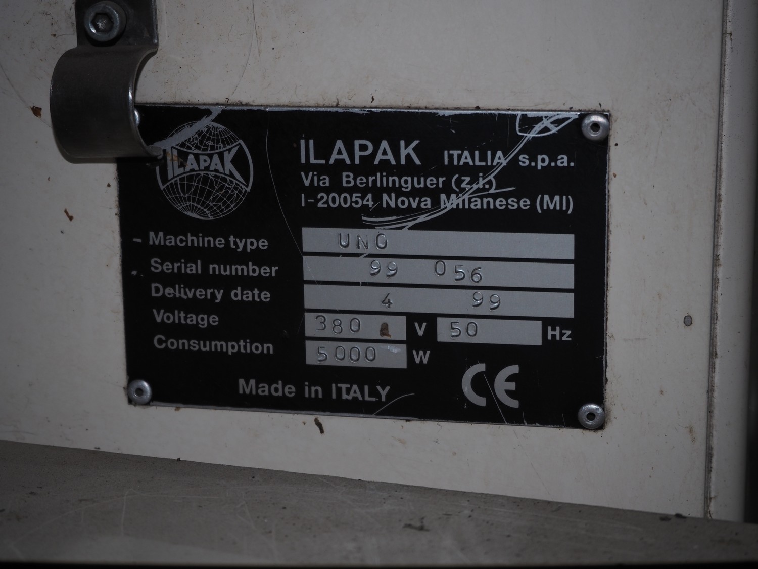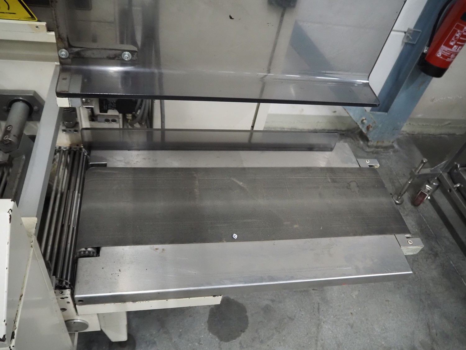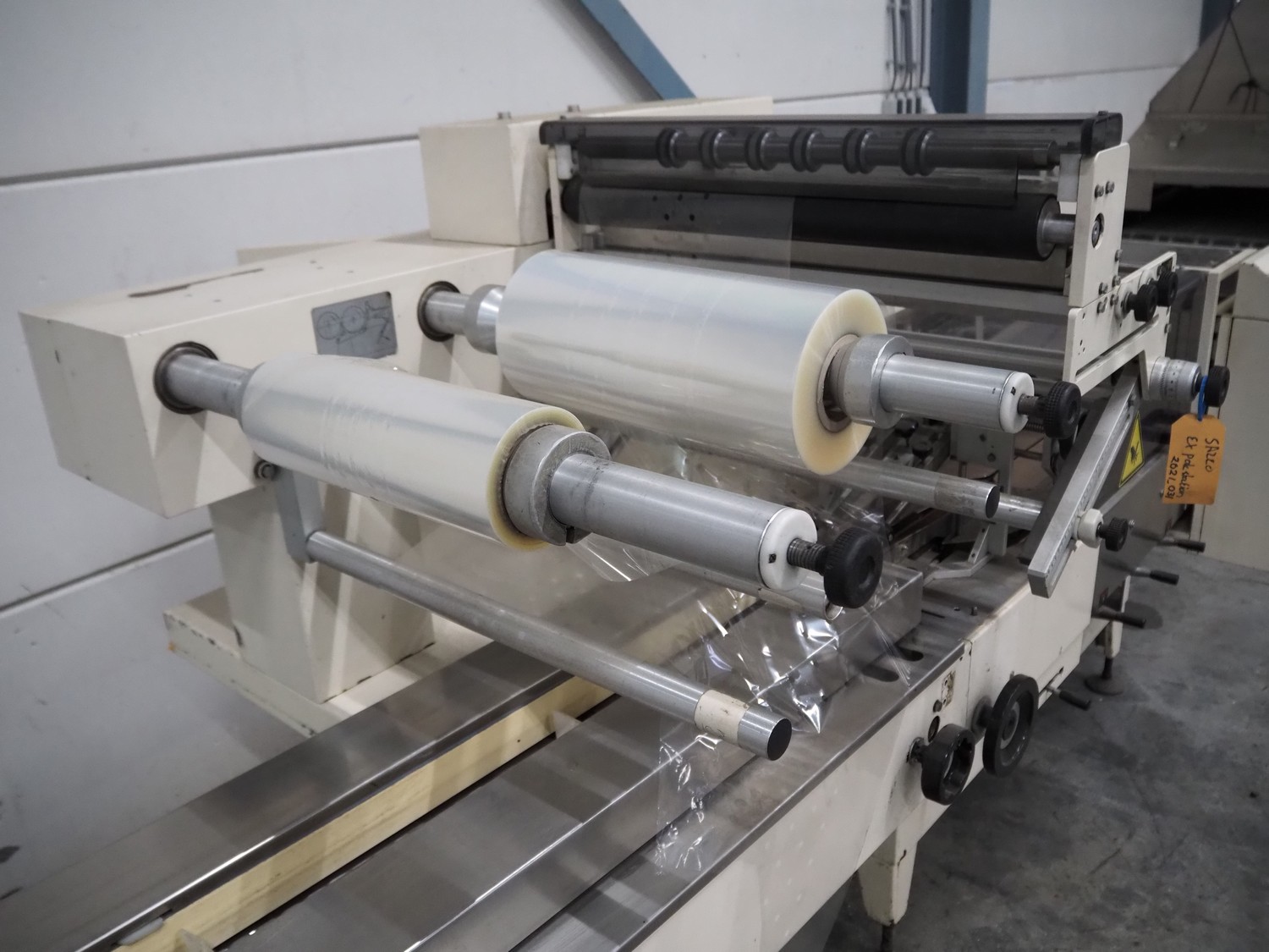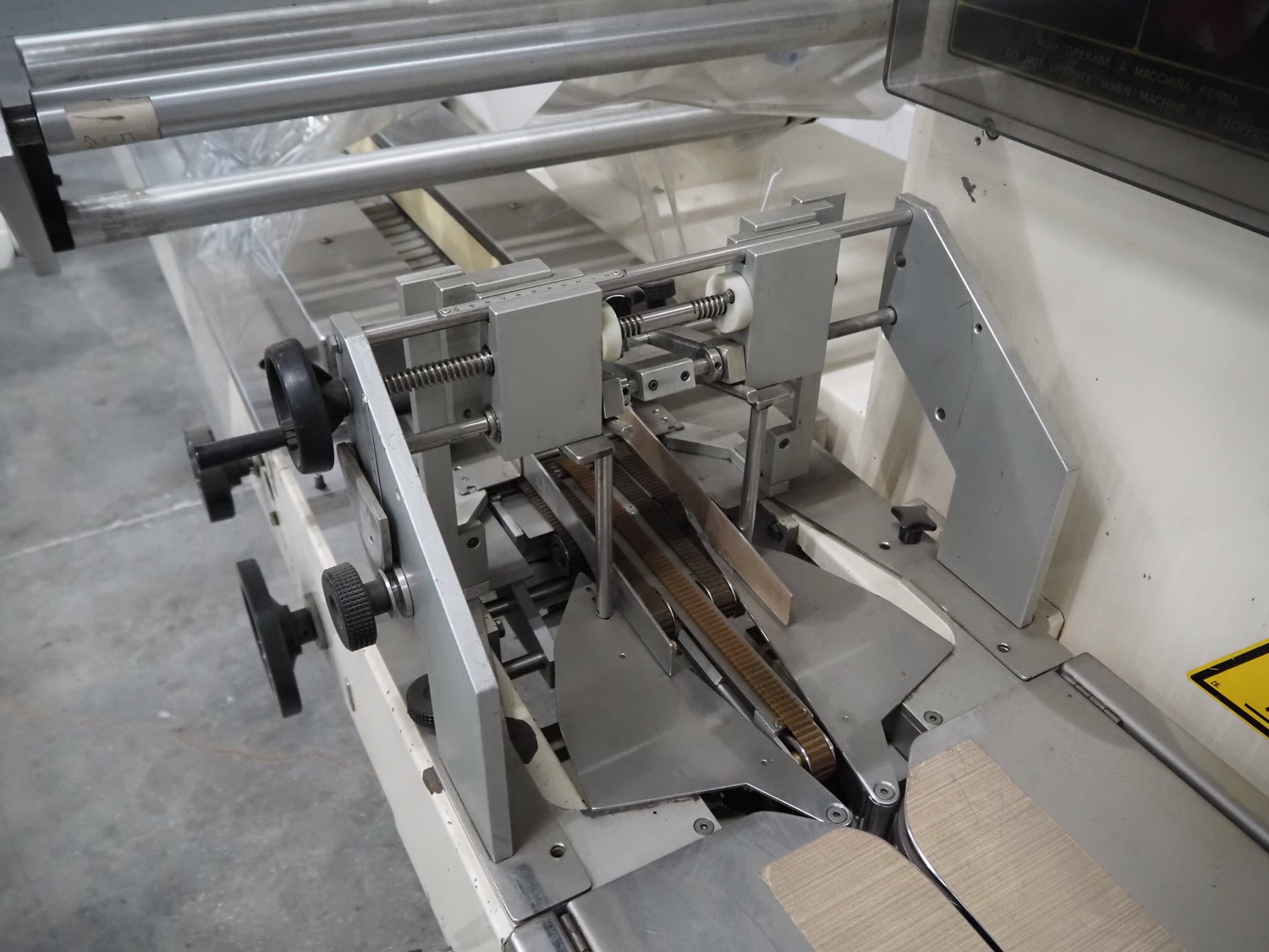 Ilapak Italia S.p.a. flowpacker, type: Superflow, serial number: 99 056, year of construction: 4/1999, 400 V, 3 Ph, 50 Hz, 10 A, 5000 W, seal width: 250 mm, plastic belt, belt width: 100 mm, film width: 400 mm and 350 mm, total dimensions: 6800 mm x 1300 mm x 1600 mm.