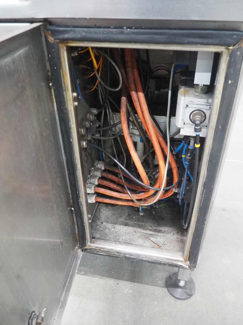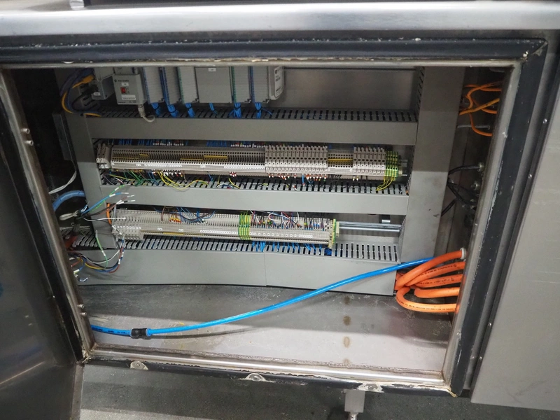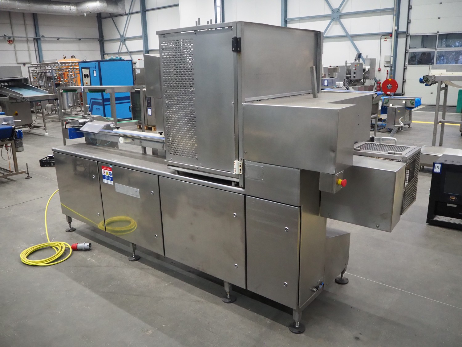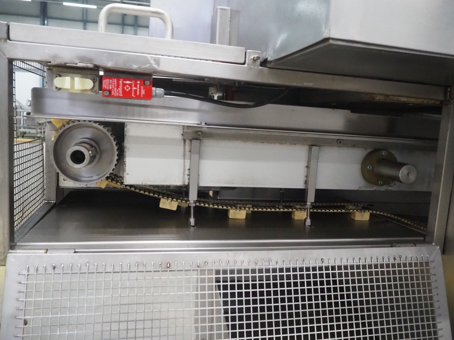 Gainsborough Craftsmen packaging machine for sausages with tray denester, machine number: 1495, year of construction: oct 2005, 415 V, weight: 1500 kg, plastic belt, belt width: 50 mm, tray dimensions: 140 mm x 190 mm, total dimensions: 3350 mm x 1050 mm x 1950 mm. Incomplete.