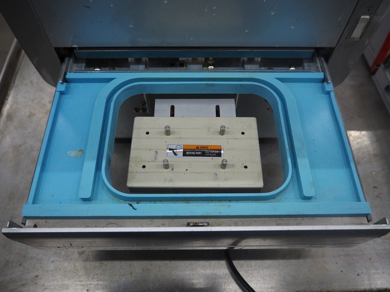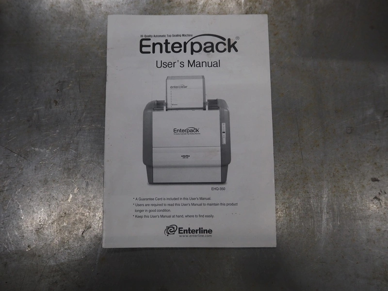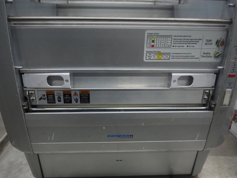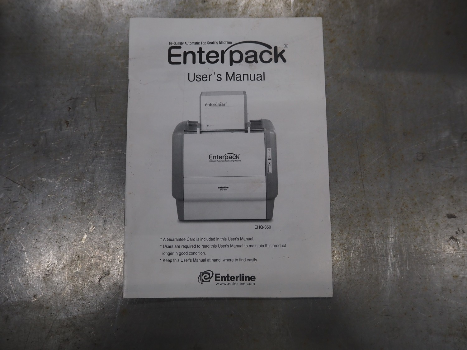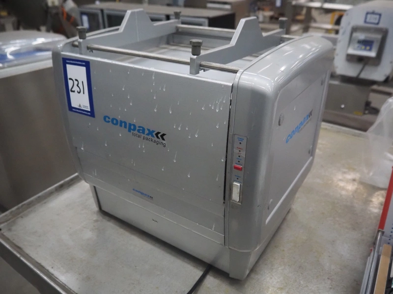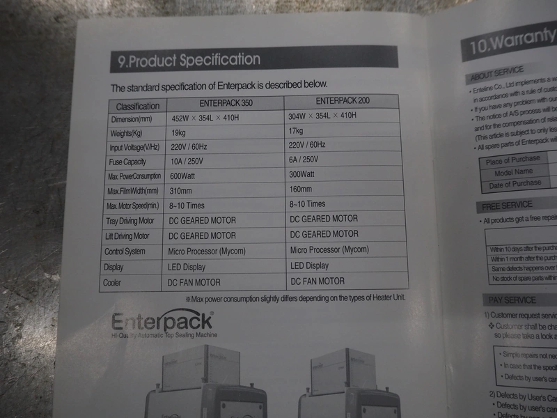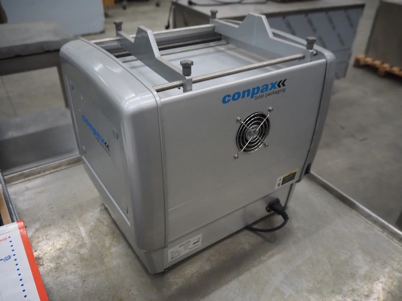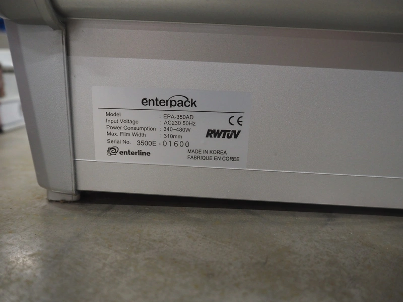 Enterpack/Conpax packaging machine, model: EPA-350AD, serial number: 3500E-01600, 230 V, 50 Hz, 340-480 Watt, diameter dye: 135 mm, maximum film width: 310 mm, dimensions: 452 mm x 354 mm x 410 mm.