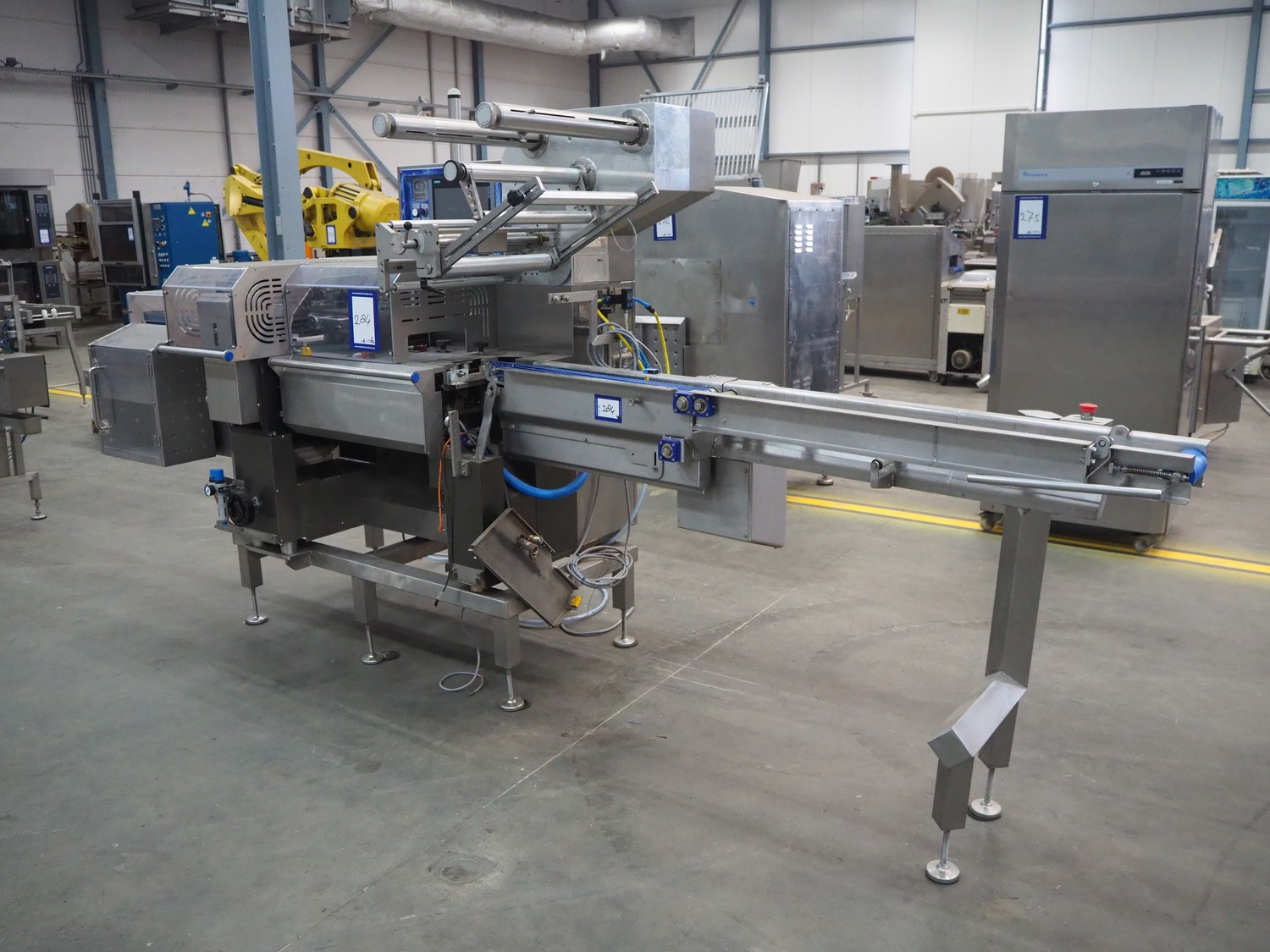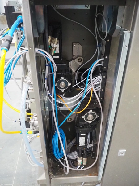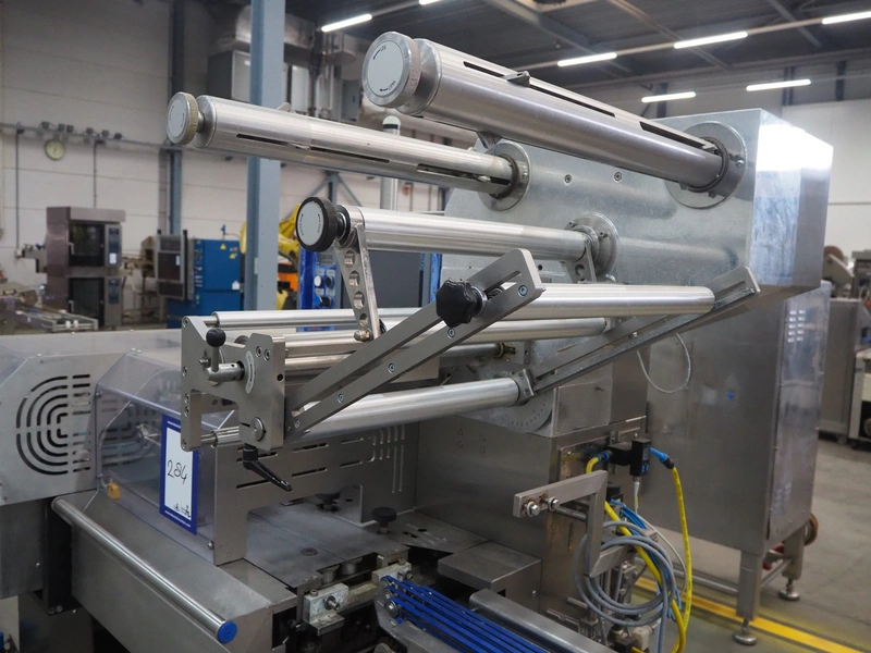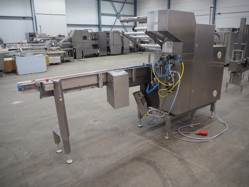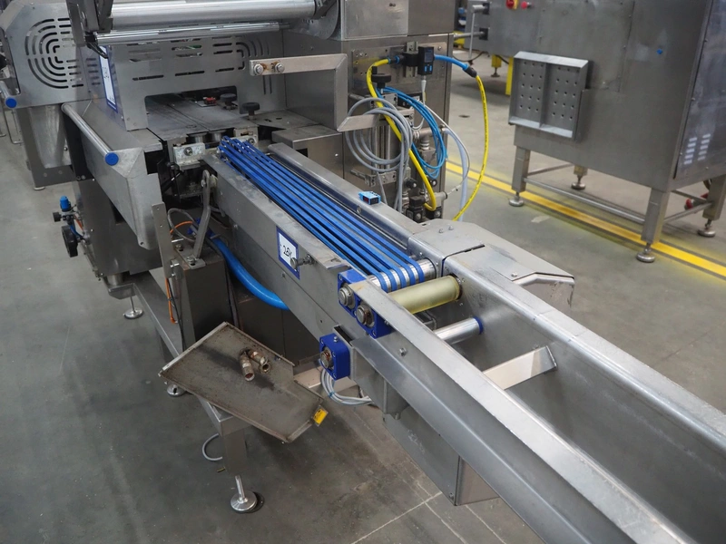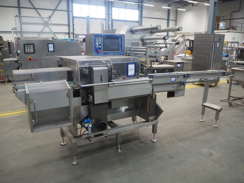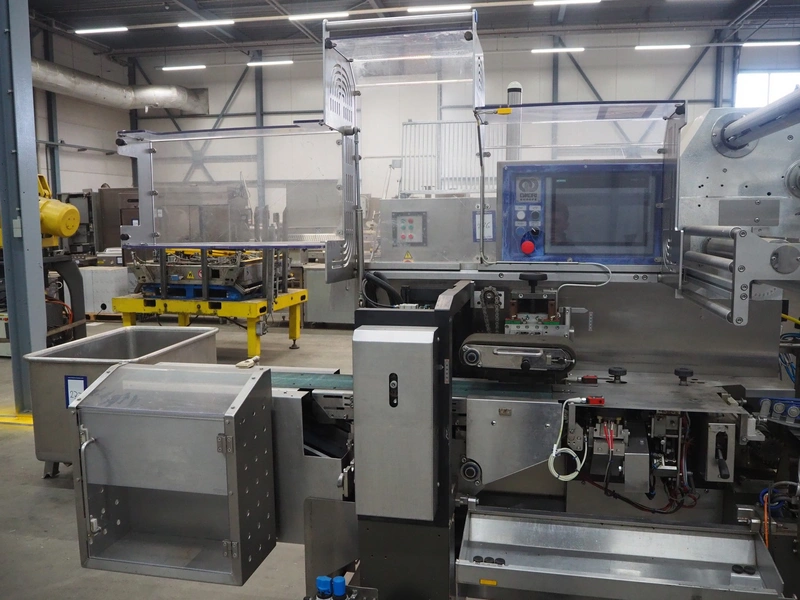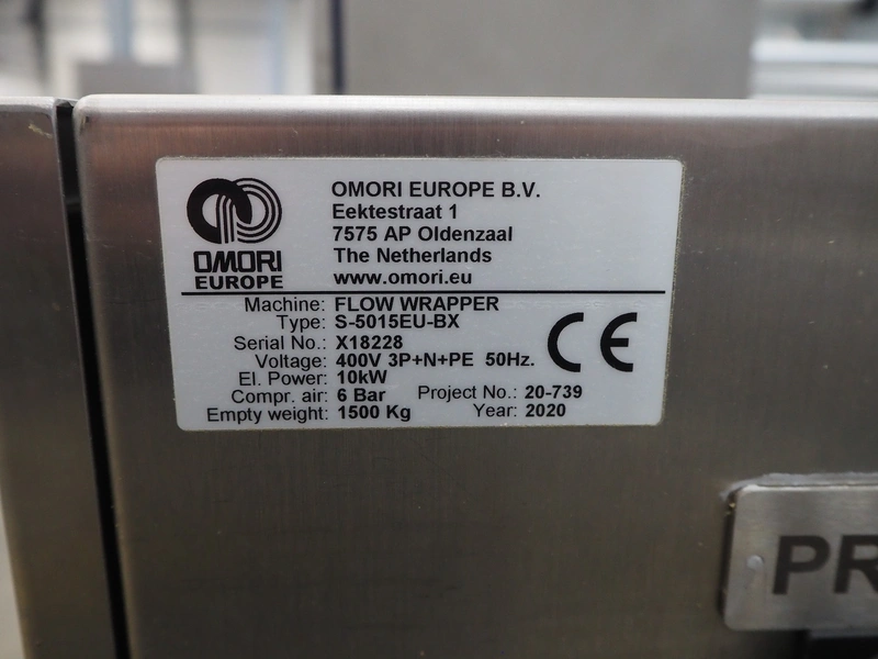 Omori Europe B.V. flowpacker, type: S-5015EU-BX, serial number: X18228, year of construction: 2020, 400 V, 3 Ph, 50 Hz, 10 kW, weight: 1500 kg, seal length: 250 mm, plastic outfeed belt, belt width: 180 mm, total dimensions: 3900 mm x 1100 mm x 1850 mm.