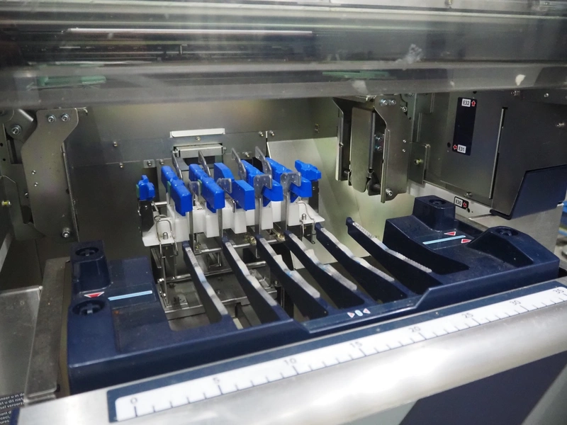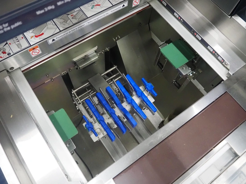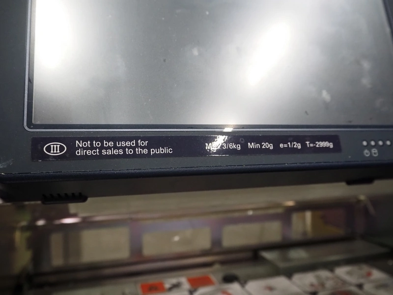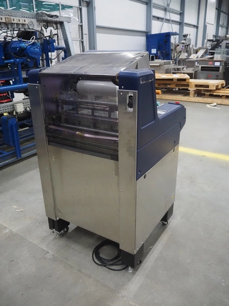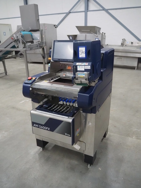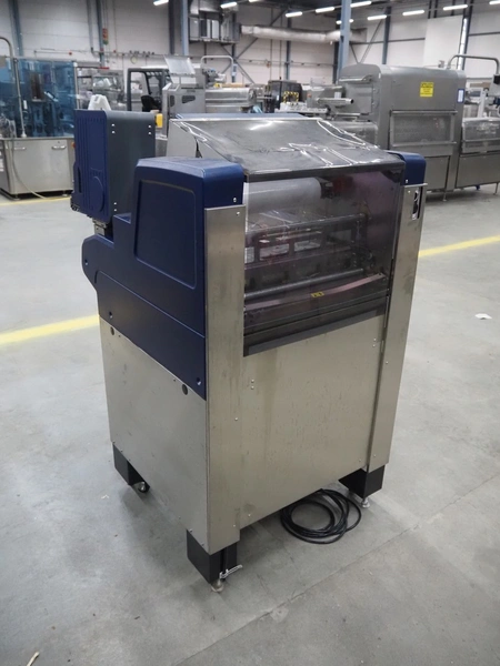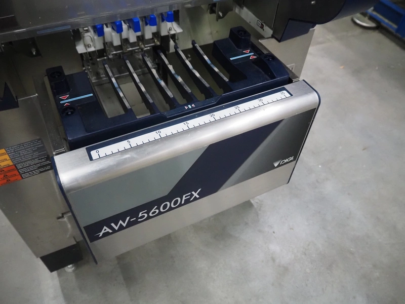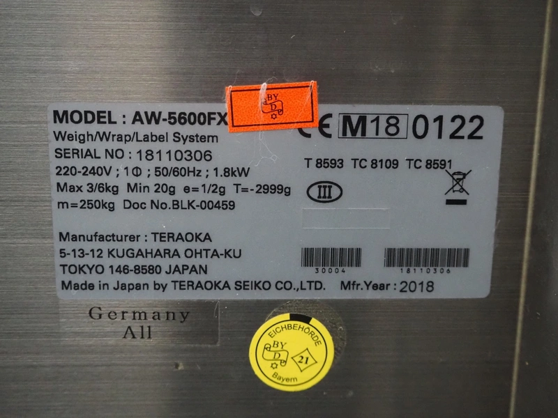 Teraoka Seiko co., LTD. mobile weigh-, wrap-, and label machine, model: AW-5600FX, serial number: 18110306, year of construction: 2018, 220/240 V, 1 Ph, 50/60 Hz, 1.8 kW, maximum: 3/6 kg, minimum: 20g, e=1/2 kg, T=-2999 g, m=250 kg, clearance: 380 mm x 280 mm, film width: 380 mm, total dimensions: 970 mm x 800 mm x 1440 mm.