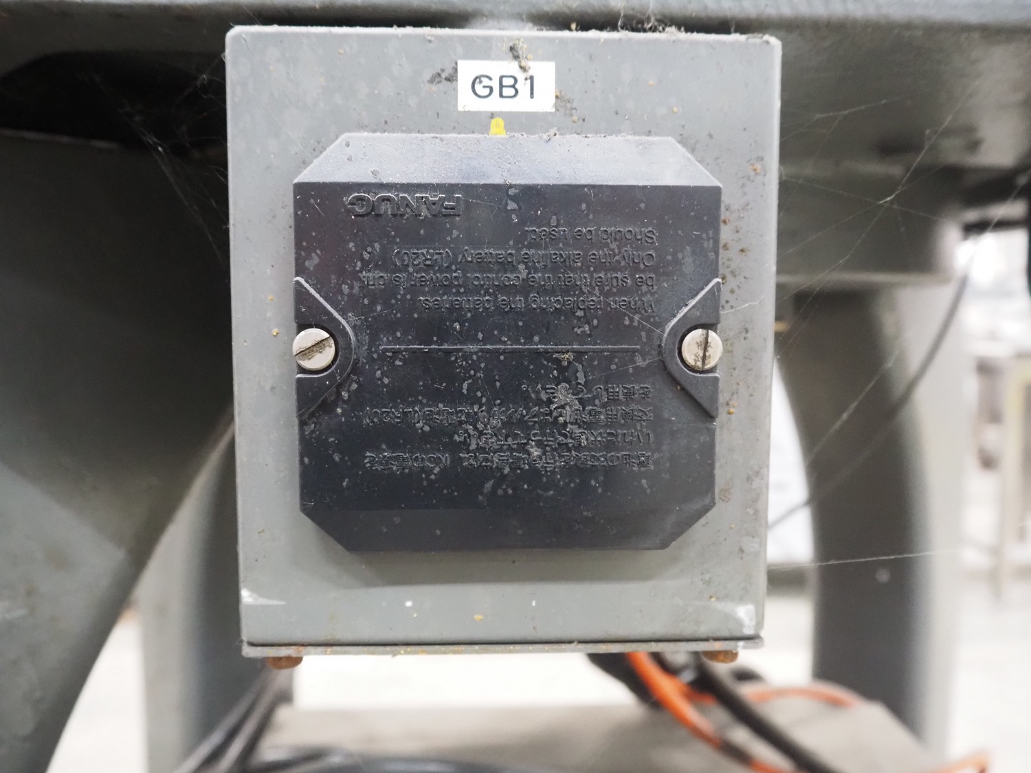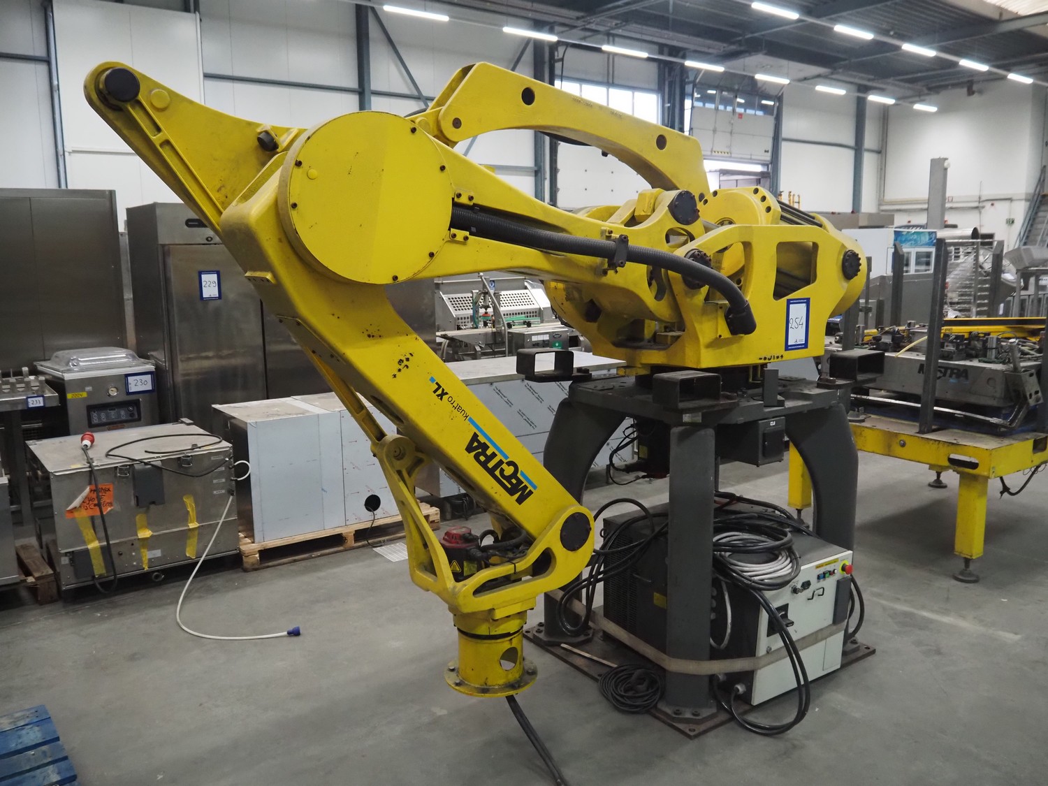 Fanuc palletizing robot with part for palletising system, pallet size: 1200 mm x 1000 mm x 145 mm, system: R-J3IC, type robot: A05B-2513-B010, dimensions robot: 2950 mm x 1200 mm x 2290 mm, dimensions platform: 1700 mm x 1550 mm x 1700 mm. Including pallet with parts.
