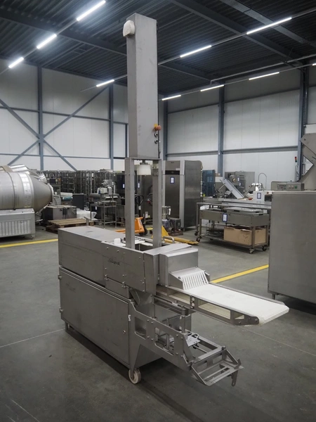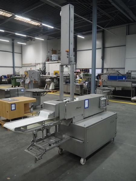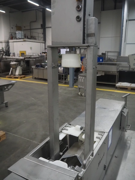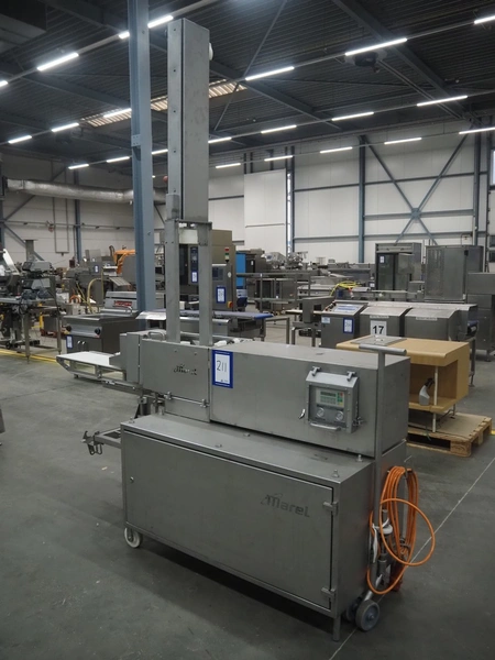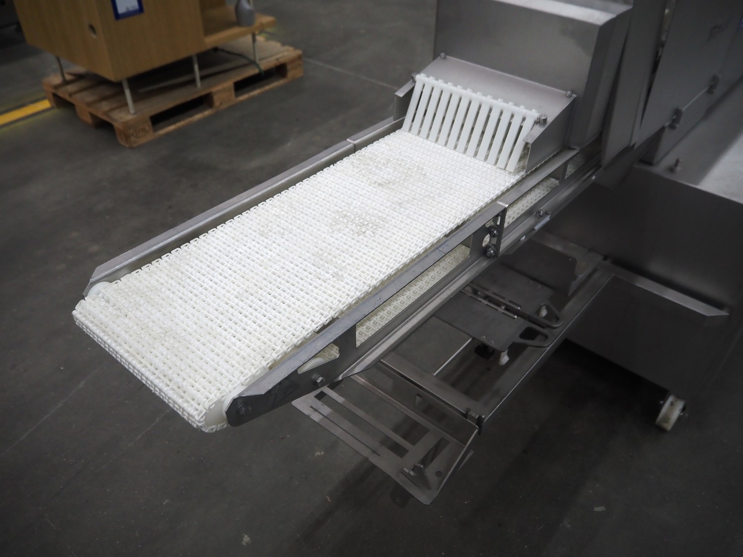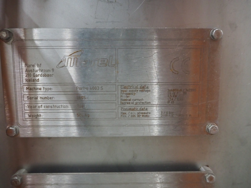 Marel mobile portioning machine, type: Portio 4003S, serial number: 080S-0071, year of construction: 2006, 400 V, 3 Ph, 50/60 Hz, 1.2/2.2 A, weight: 500 kg, plastic mesh belt, belt width: 250 mm, total dimensions: 2700 mm x 800 mm x 3000 mm.