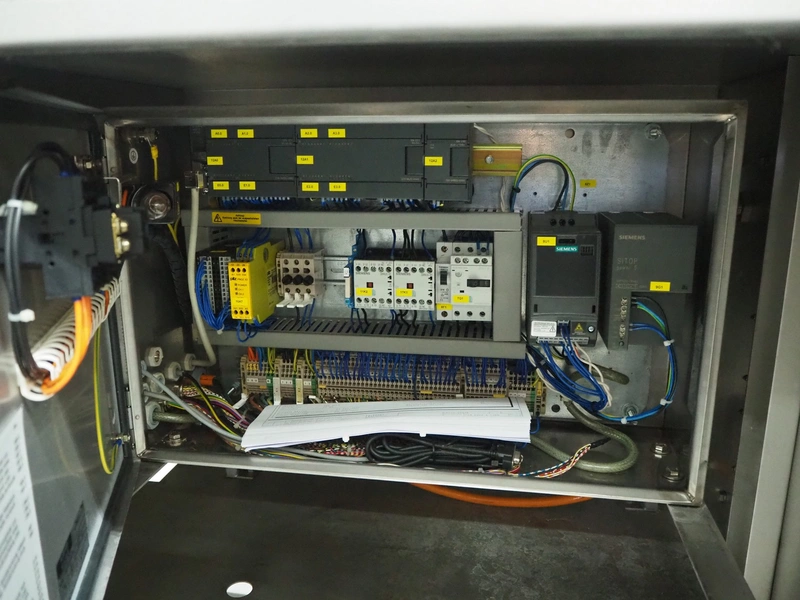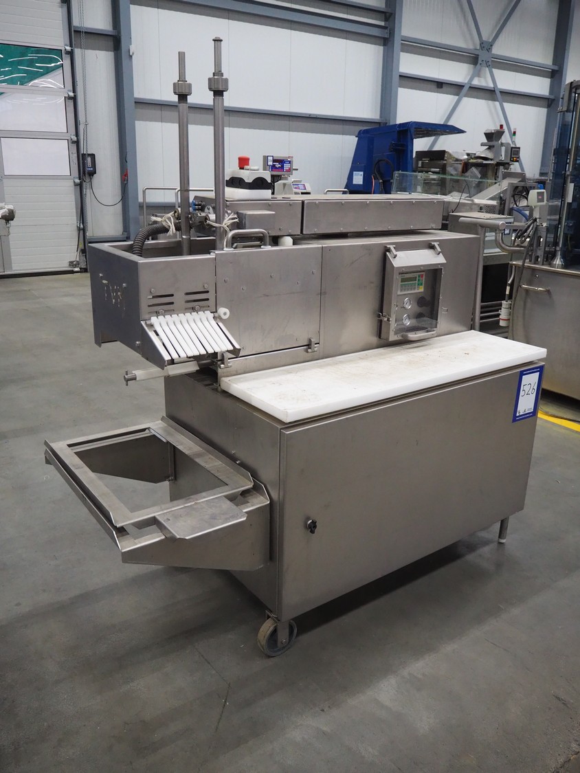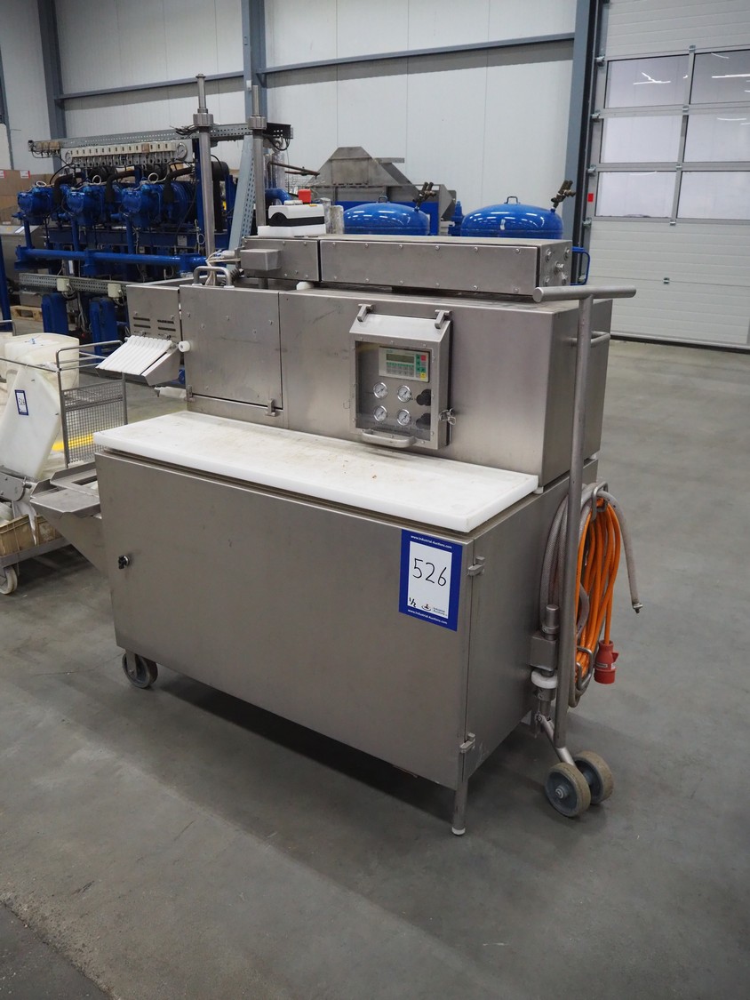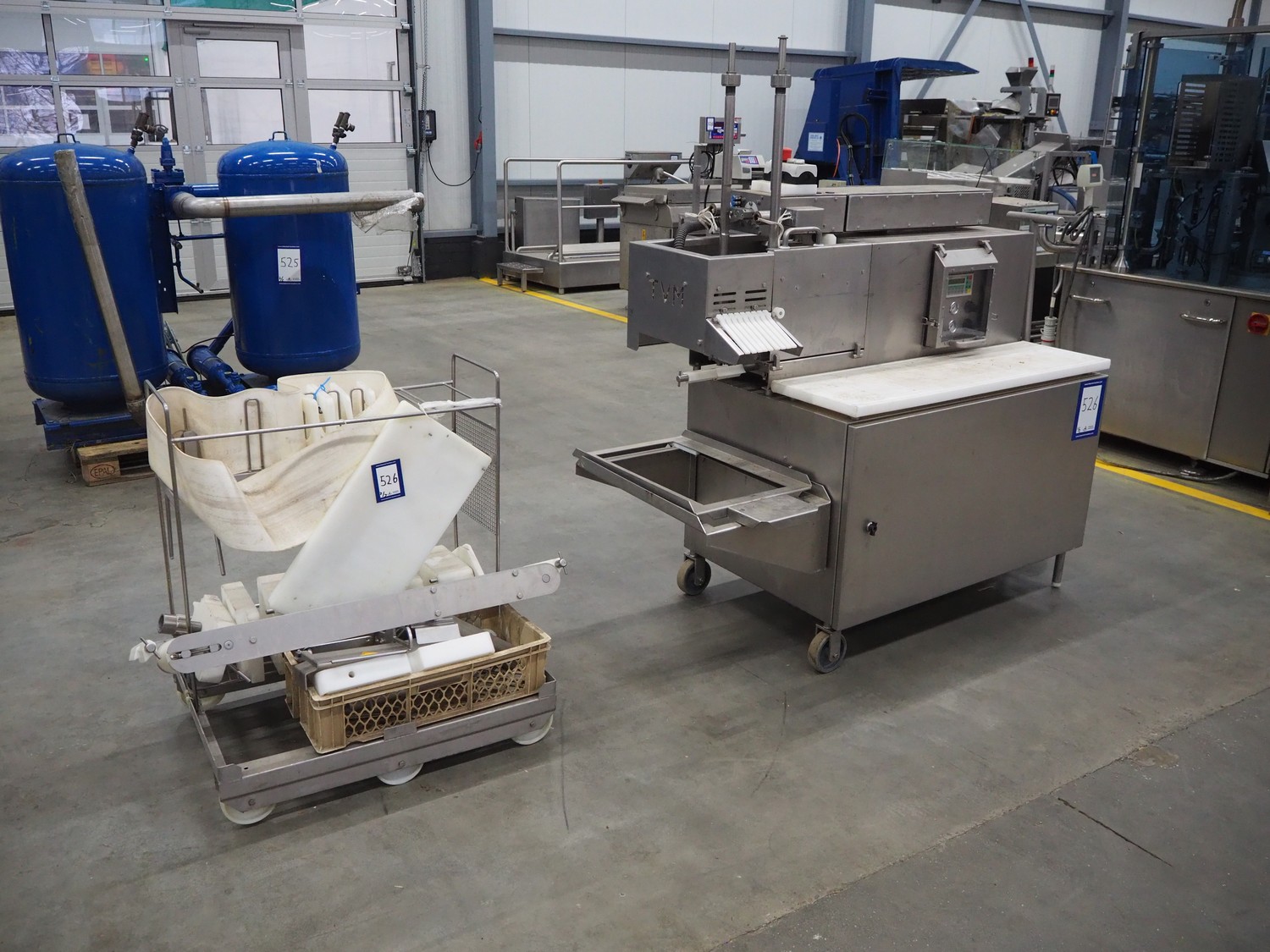 TVM GmbH & Co KG mobile portioning machine, type: Portio 4000, serial number: 05-00.26725215, year of construction: 2000, machine weight: 380 kg, plastic belt, belt width: 200 mm, total dimensions: 1800 mm x 800 mm x 1750 mm. Including trolley with parts.
