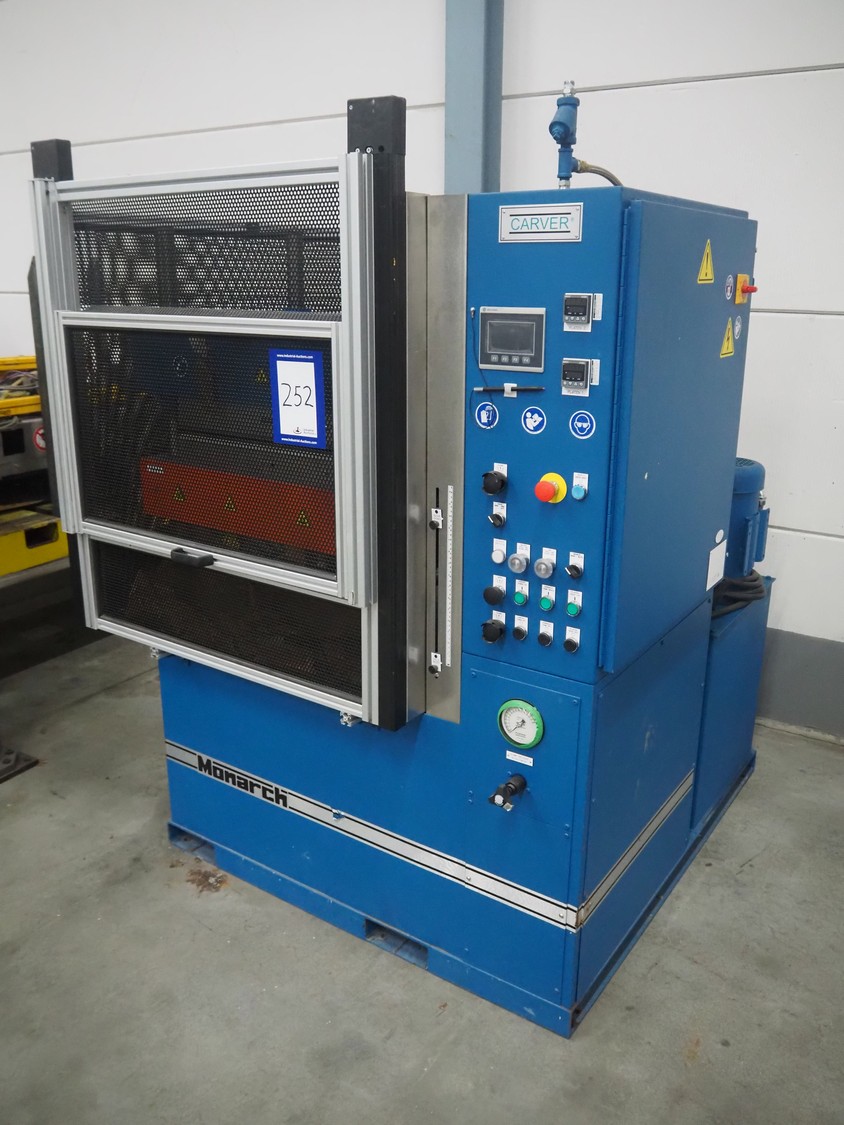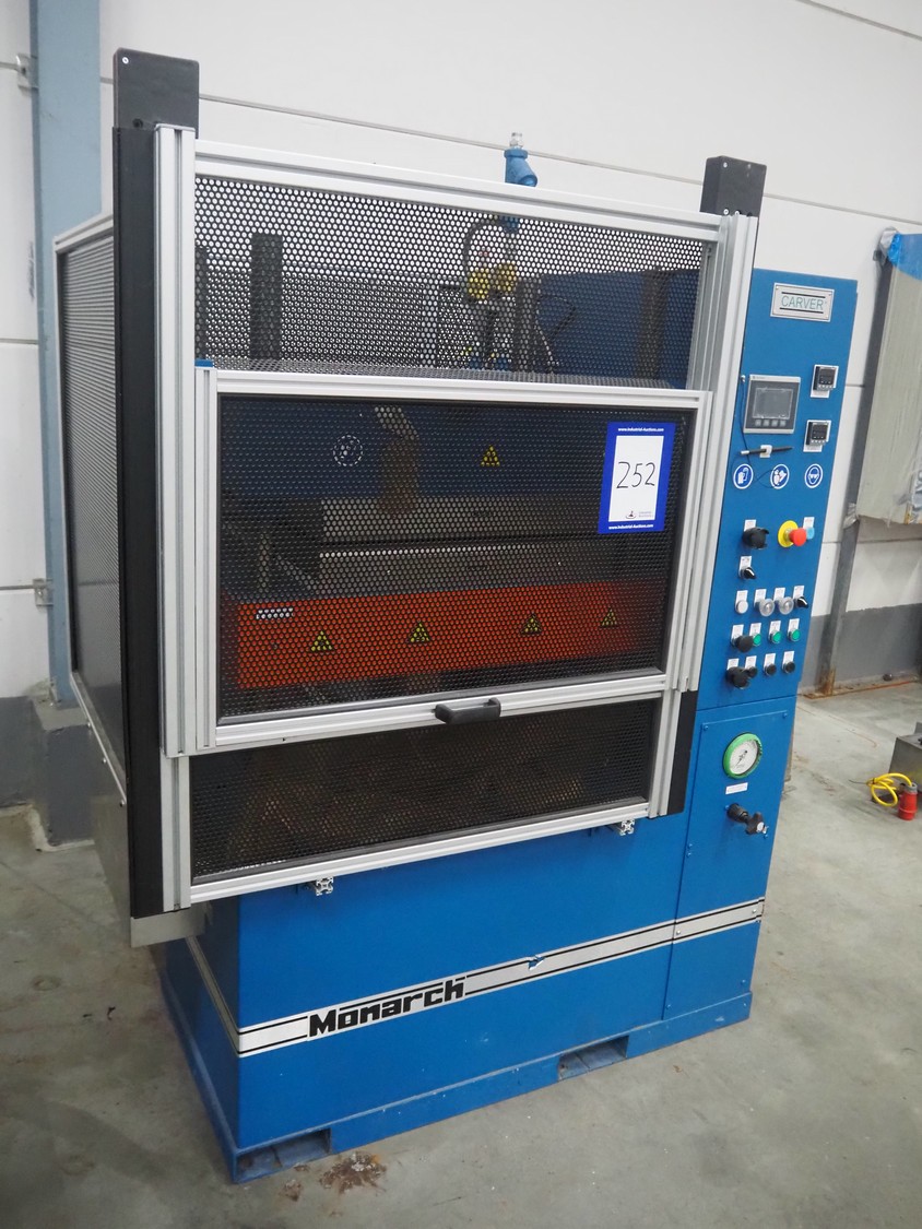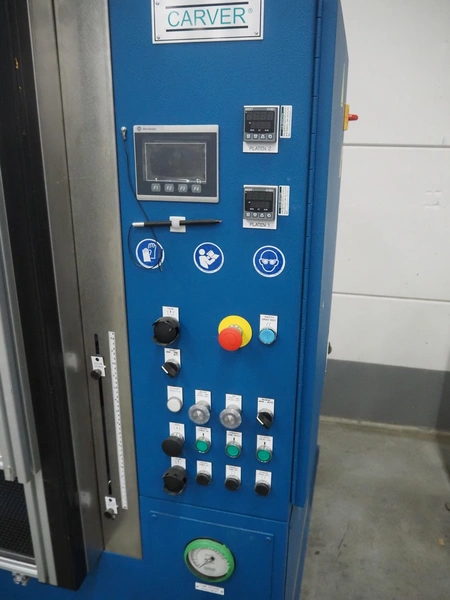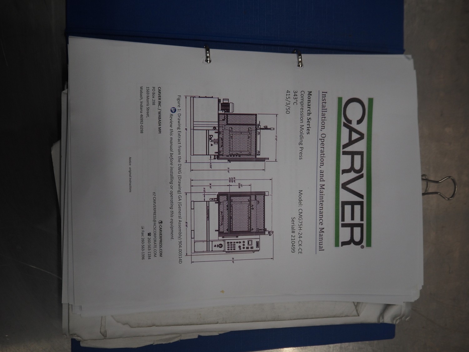 Carver compression moulding press, model: CMG75H-24-CX-CE, serial number: 210499, year of construction: 02-2022, 415 V, 3 Ph, 50 Hz, 15000 Watt per plate, weight: 3039 kg, dimensions: 1550 mm x 1550 mm x 2000 mm.