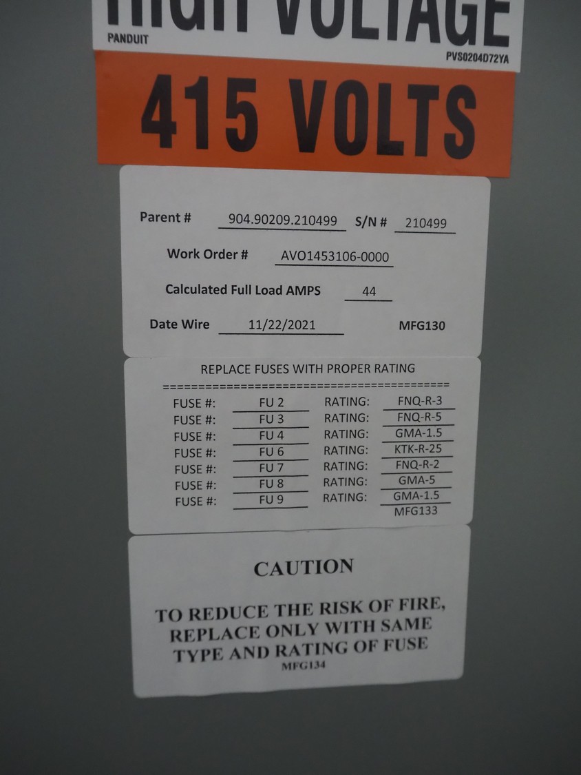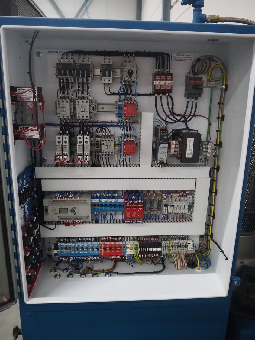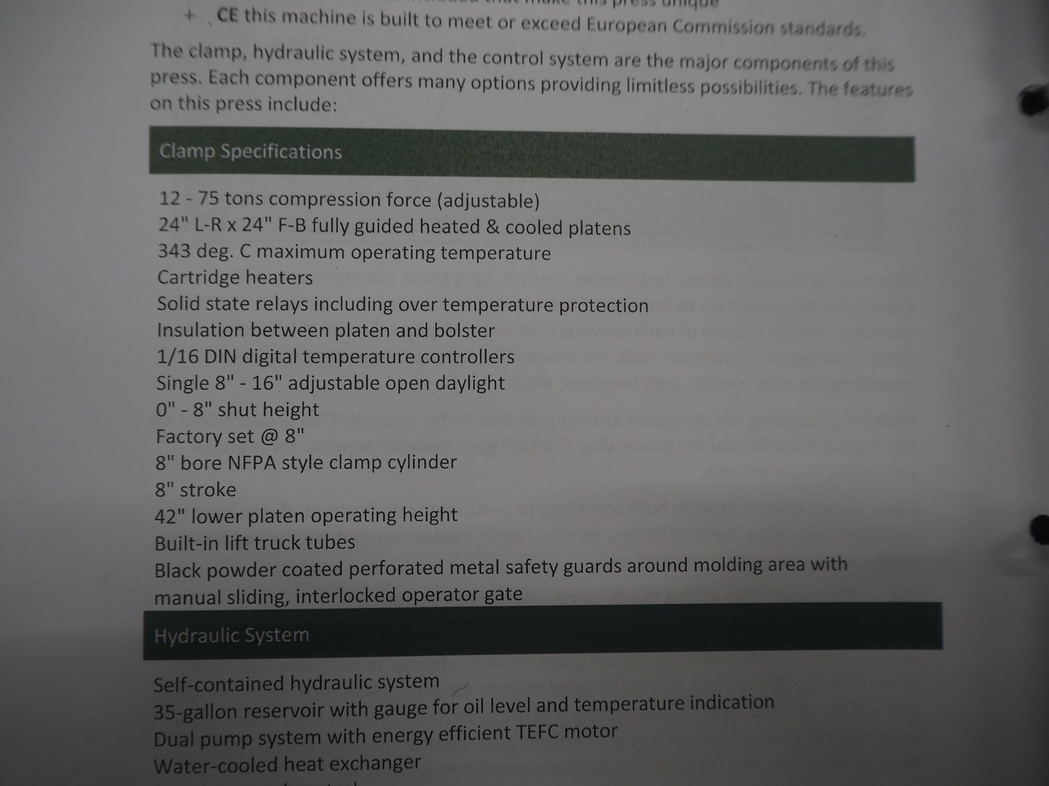 Carver compression moulding press, model: CMG75H-24-CX-CE, serial number: 210499, year of construction: 02-2022, 415 V, 3 Ph, 50 Hz, 15000 Watt per plate, weight: 3039 kg, dimensions: 1550 mm x 1550 mm x 2000 mm.