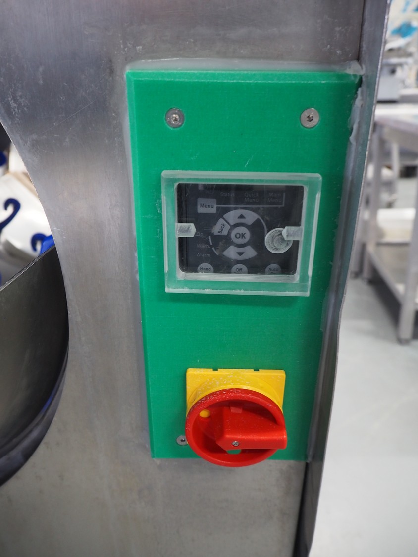 Heinrich GmbH mobile sausage cutter, machine number: 99004, year of construction: 1999, 220 V, 50 Hz, diameter drum: 510 mm, total dimensions: 1660 mm x 870 mm x 1400 mm.
