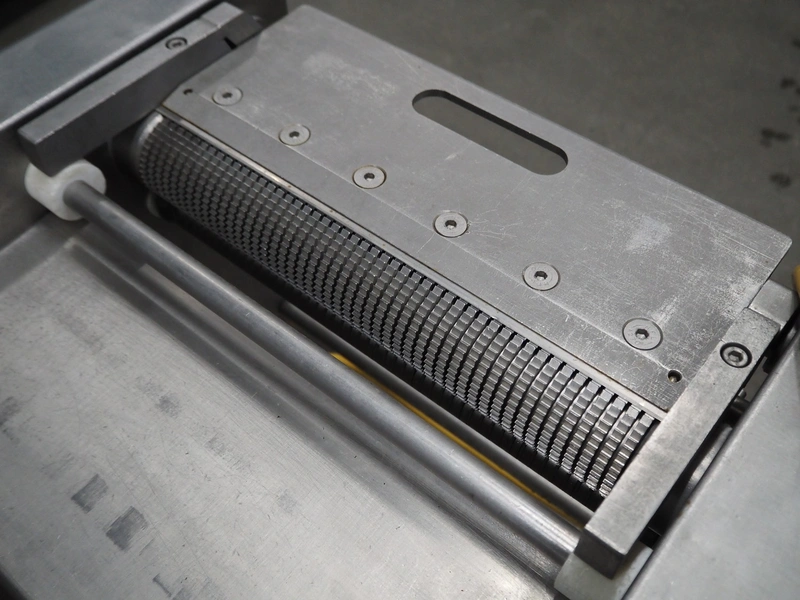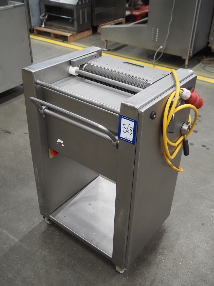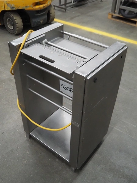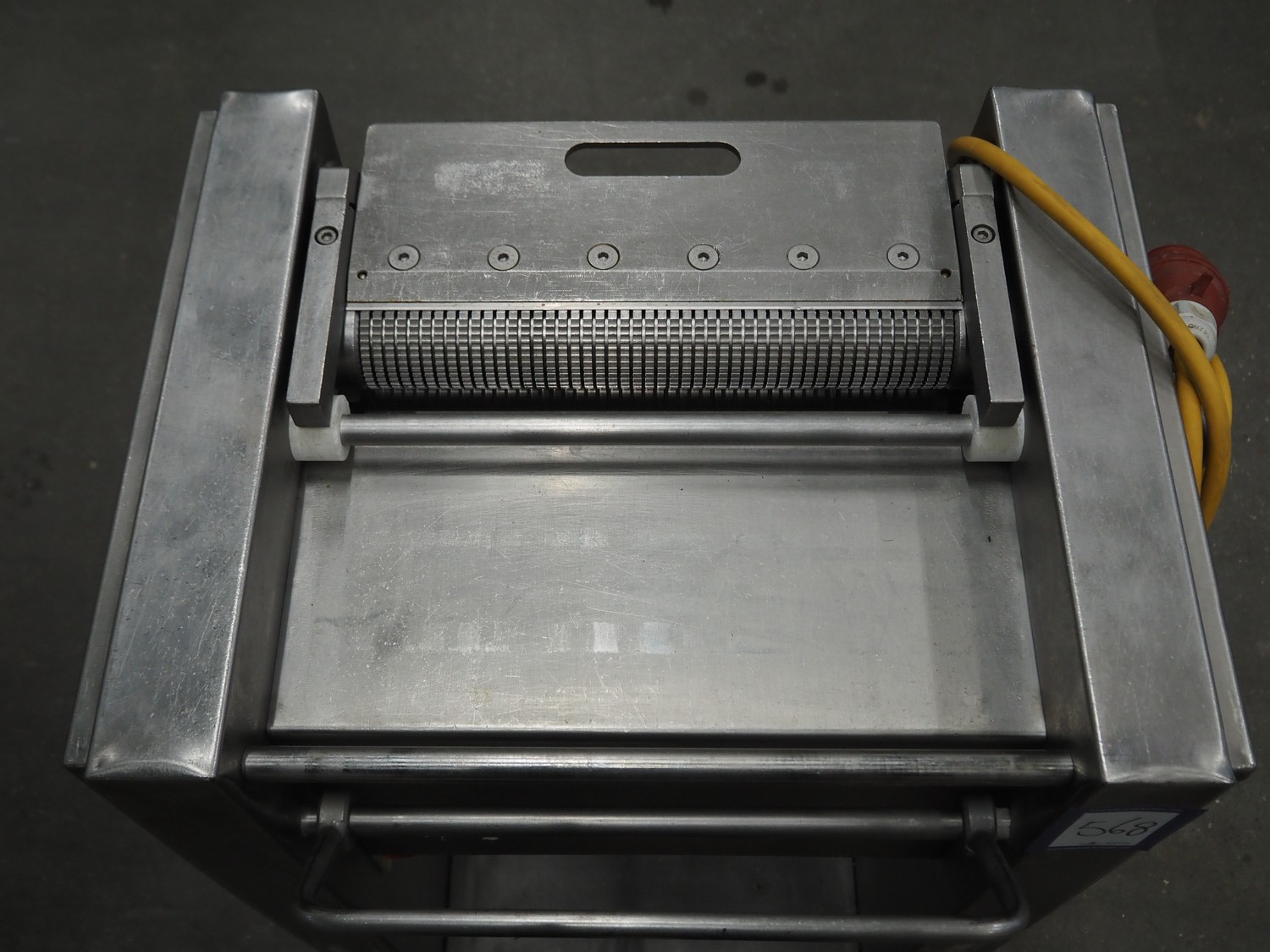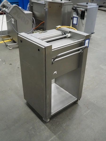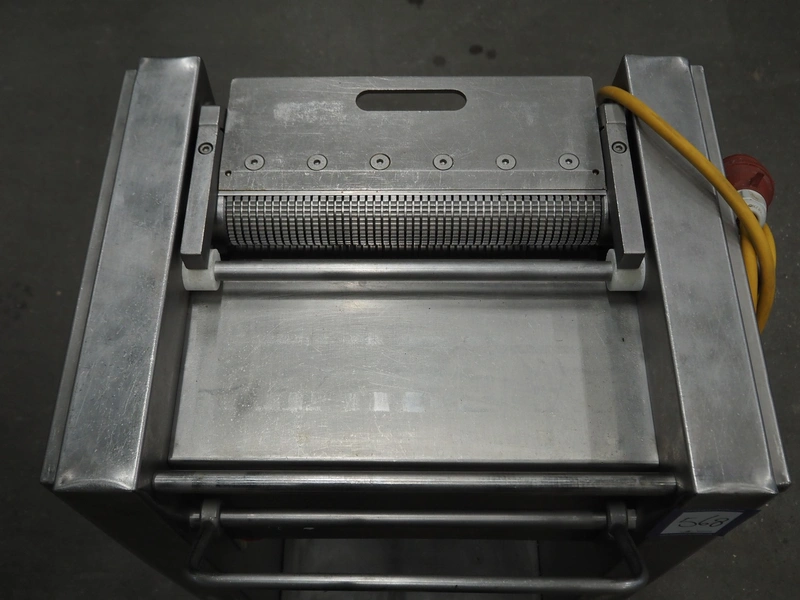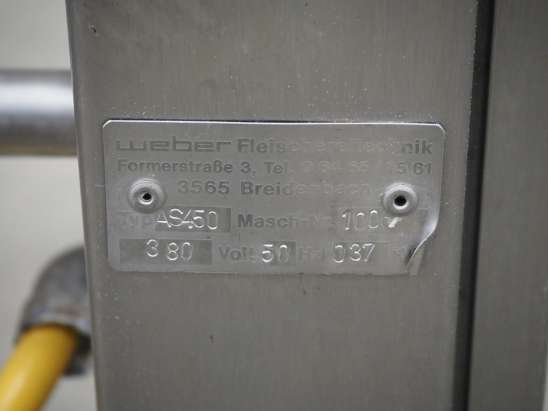 Weber mobile skinning machine, type: AS450, machine number: 1006, 380 V, 50 Hz, 0.37 kW, working width: 400 mm, total dimensions: 650 mm x 500 mm x 980 mm.