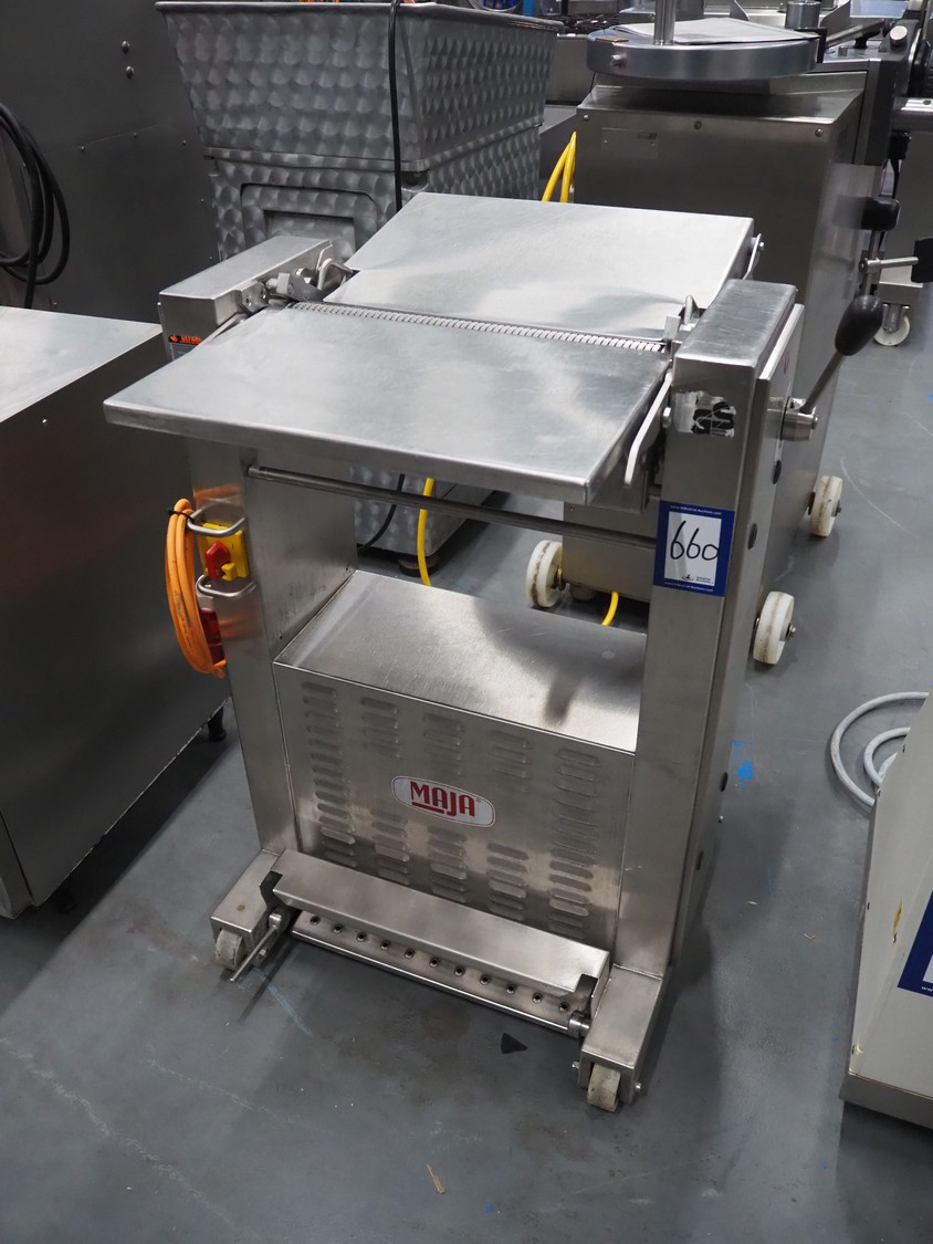 Maja mobile skinning machine, type: ESM 435, number: 41319, year of construction: 1999, 400 V, 3 Ph, 50 Hz, 2 A, 0.75 kW, working width: 430 mm, total dimensions: 770 mm x 730 mm x 980 mm.
