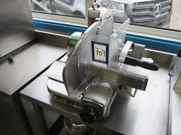 Slicer, dimensions: 590 mm x 450 mm x 450 mm. Including knife sharpener.0 bidsLot is closed -