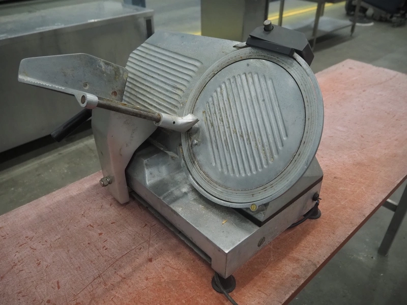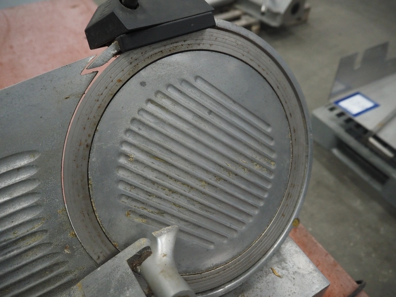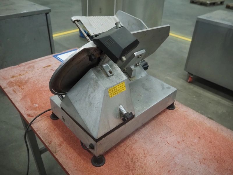 Slicer, dimensions: 590 mm x 450 mm x 450 mm. Including knife sharpener.