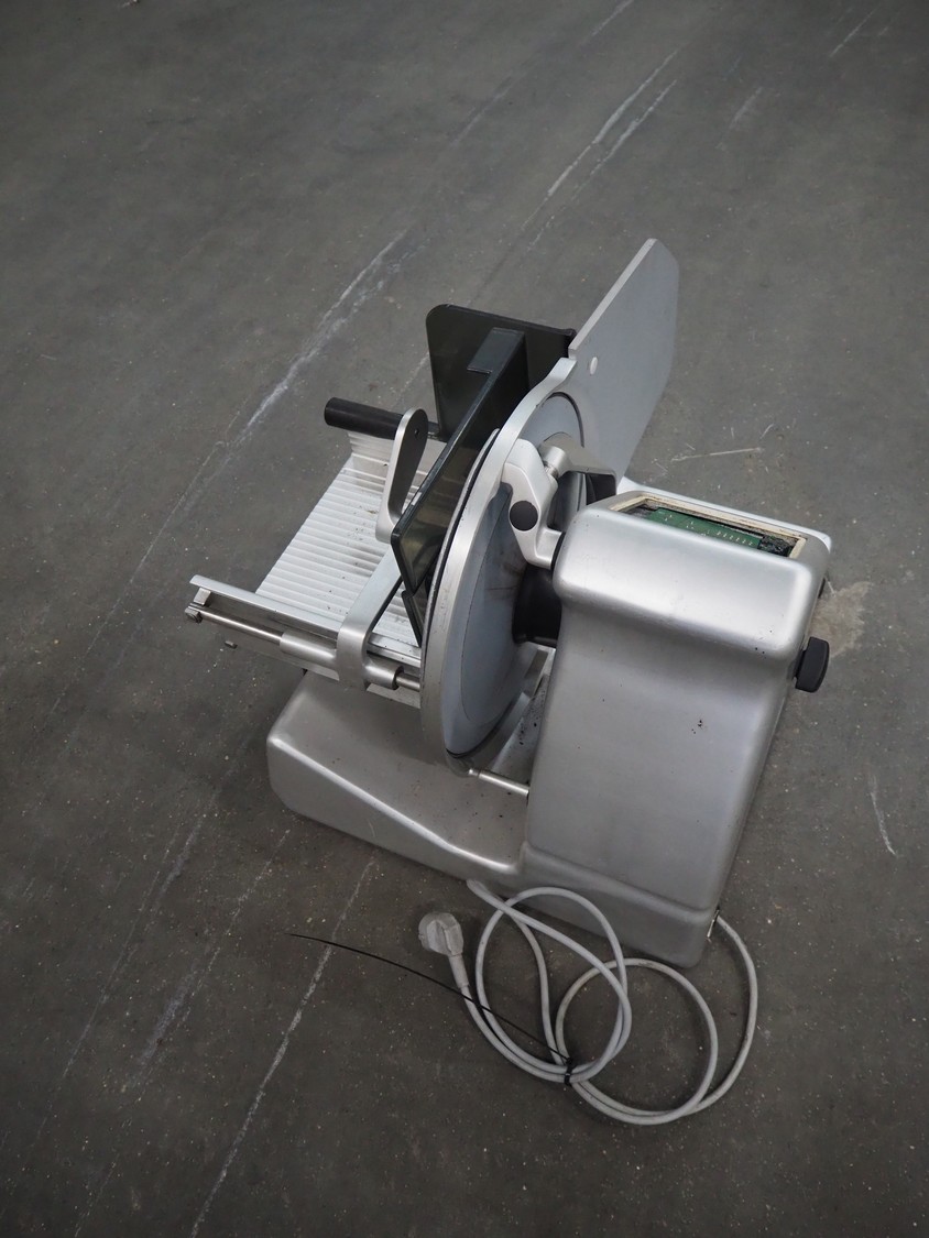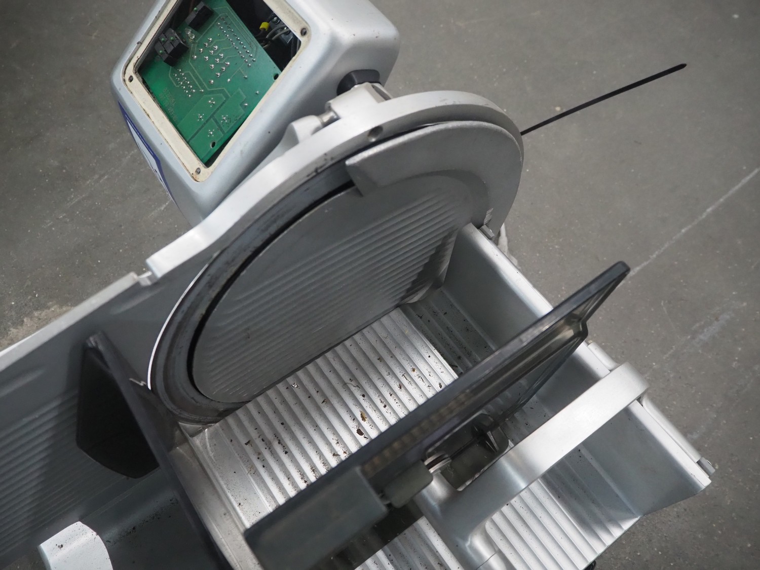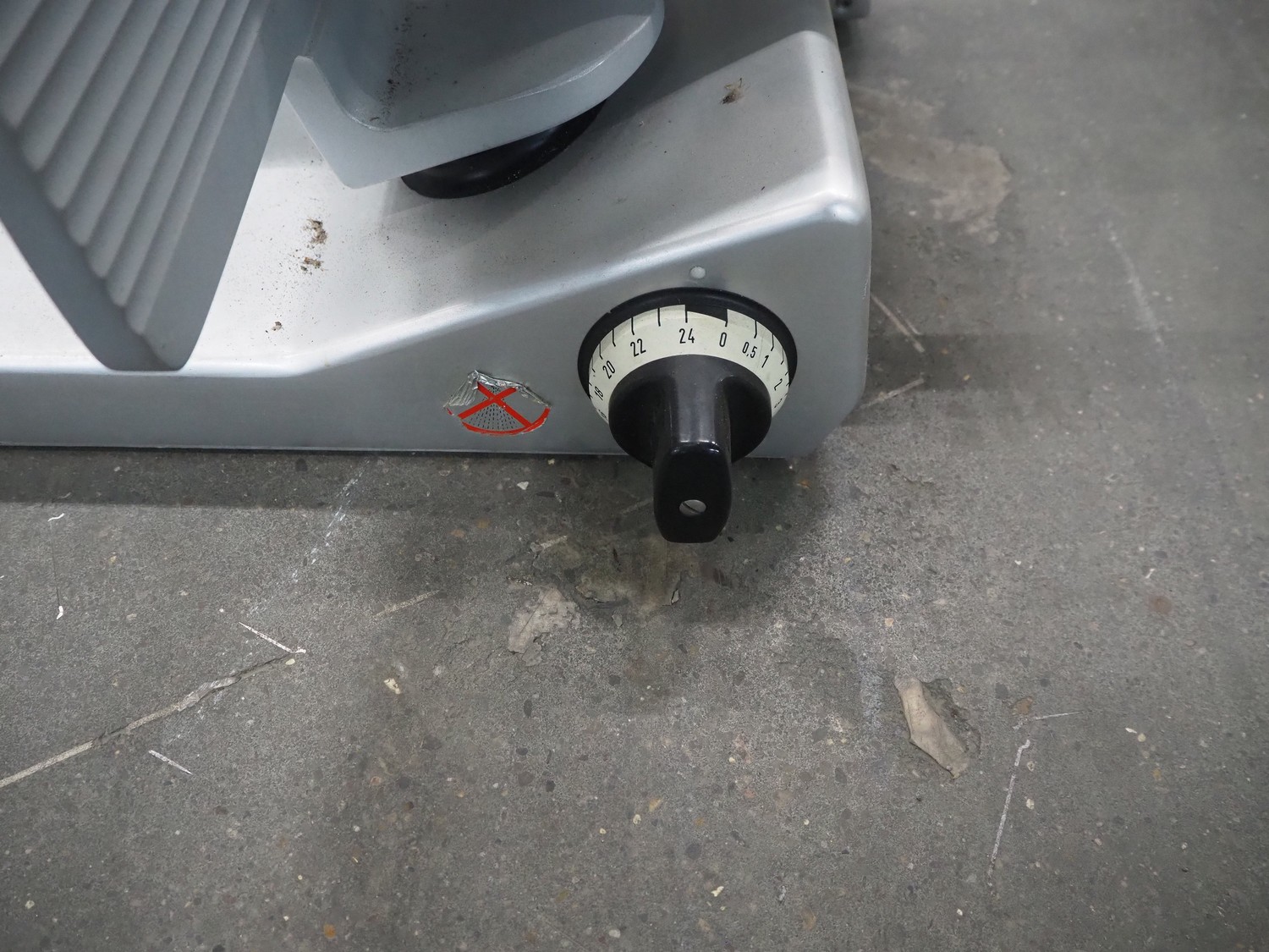 Bizerba slicer, type: VS 12, number: 1770463, year of construction: 2000, 230 V, 1 Ph, 50 Hz, 1.8 A, dimensions: 580 mm x 700 mm x 425 mm. Incomplete.