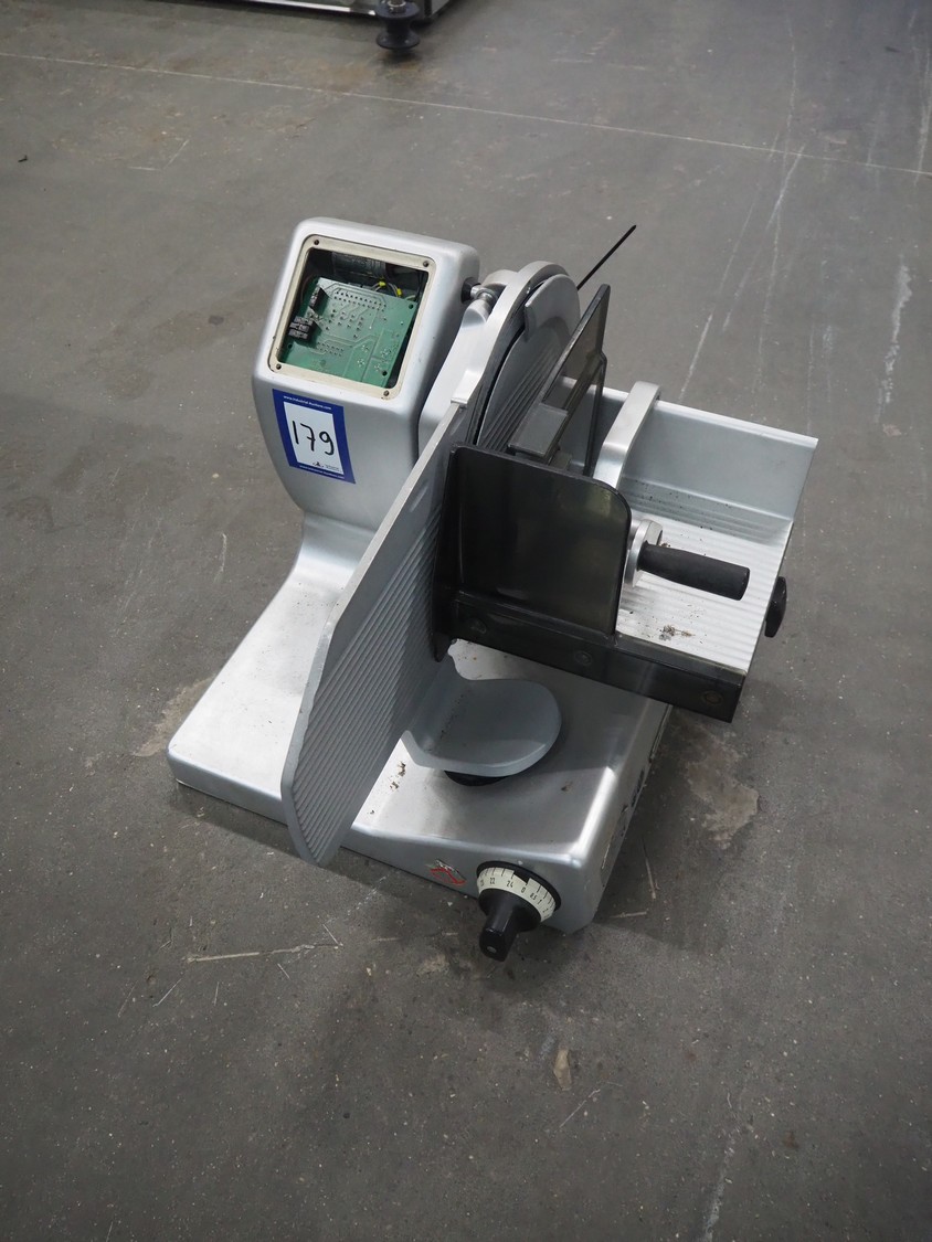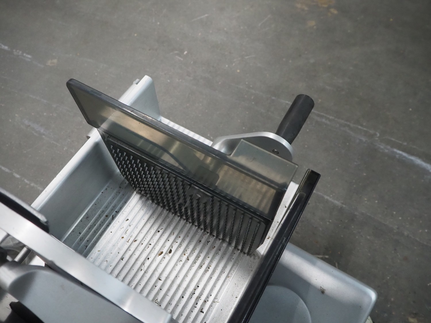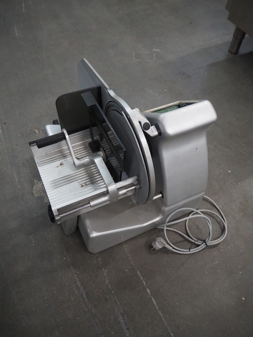 Bizerba slicer, type: VS 12, number: 1770463, year of construction: 2000, 230 V, 1 Ph, 50 Hz, 1.8 A, dimensions: 580 mm x 700 mm x 425 mm. Incomplete.