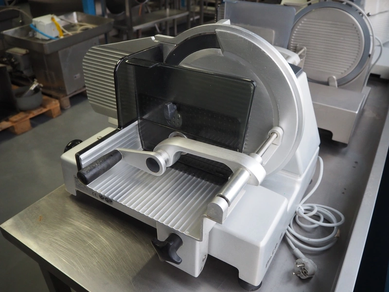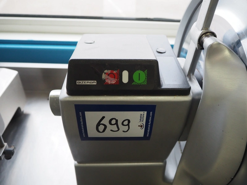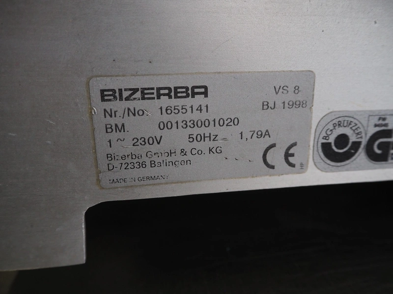 Bizerba slicer, type: VS 8, number: 1655141, year of construction: 1998, 230 V, 1 Ph, 50 Hz, 1.79 A, dimensions: 655 mm x 530 mm x 430 mm.