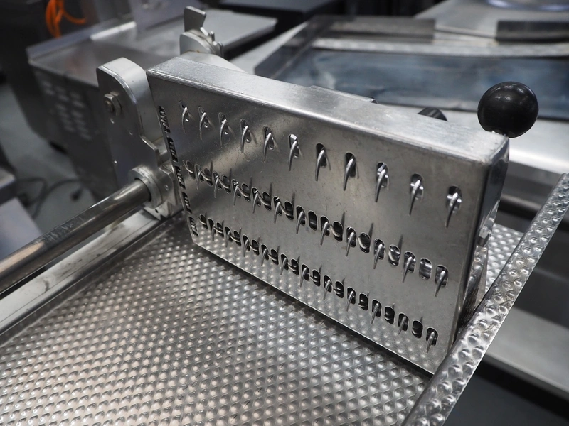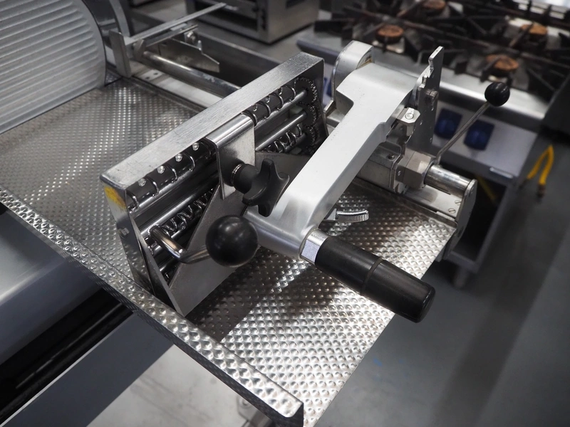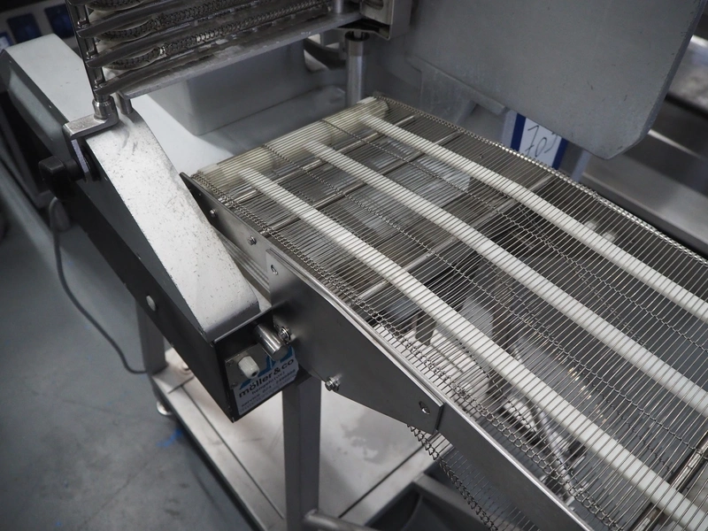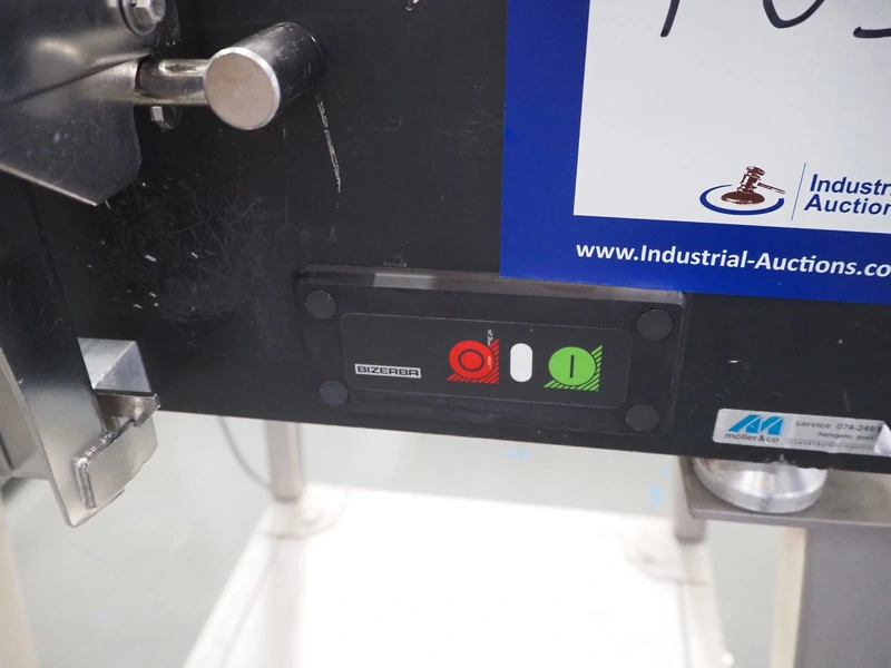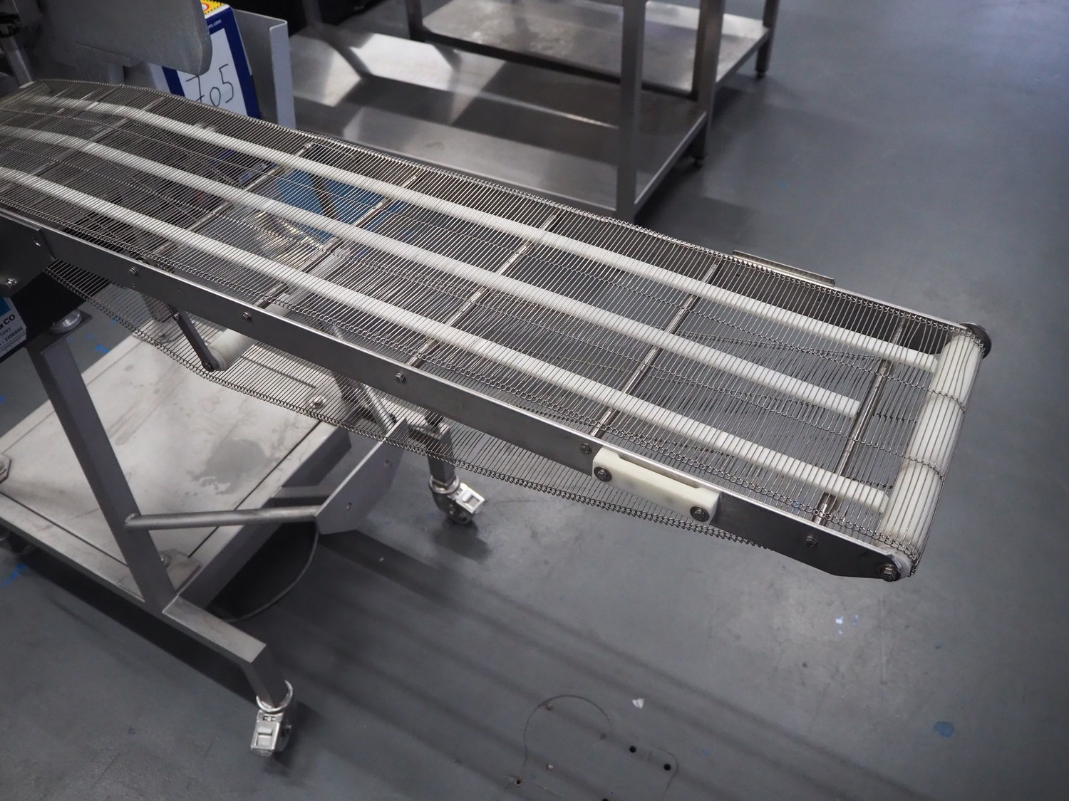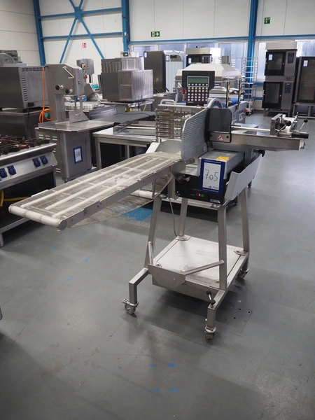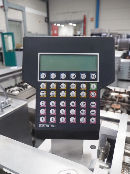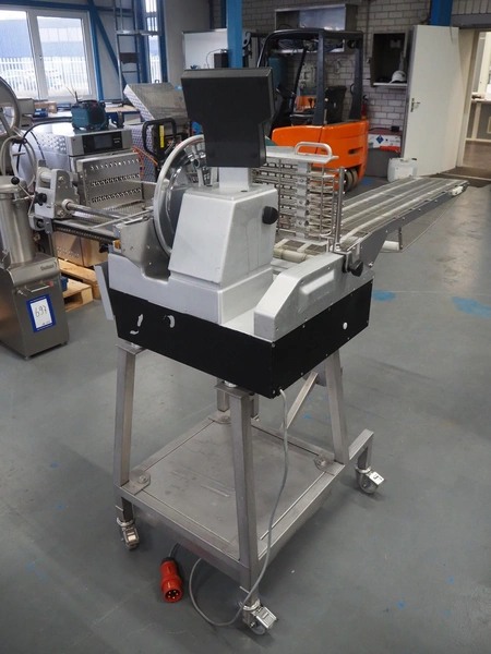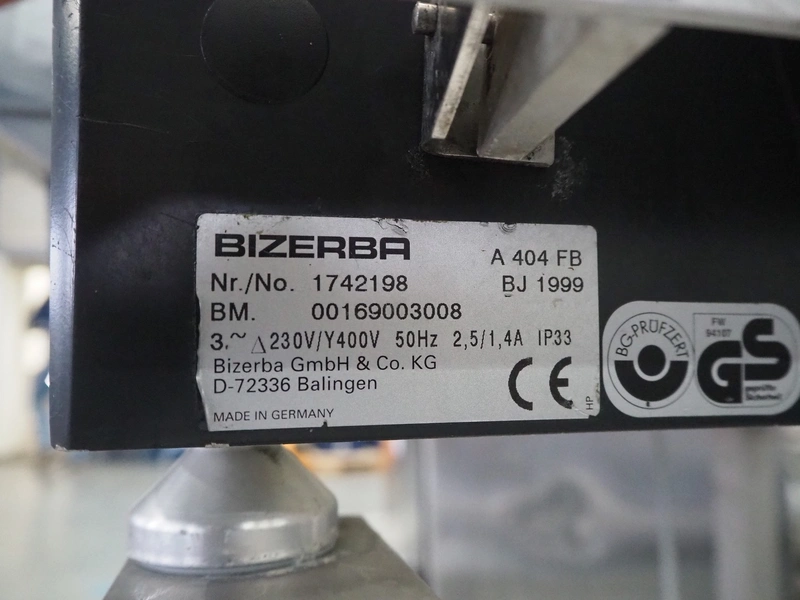 Bizerba mobile automatic slicer, model: A 404 FB, number: 1742198, year of construction: 1999, 230/400 V, 3 Ph, 50 Hz, 2.5/1.4 A, s/s mesh outfeed belt, belt width: 250 mm, total dimensions: 1700 mm x 1000 mm x 1600 mm.