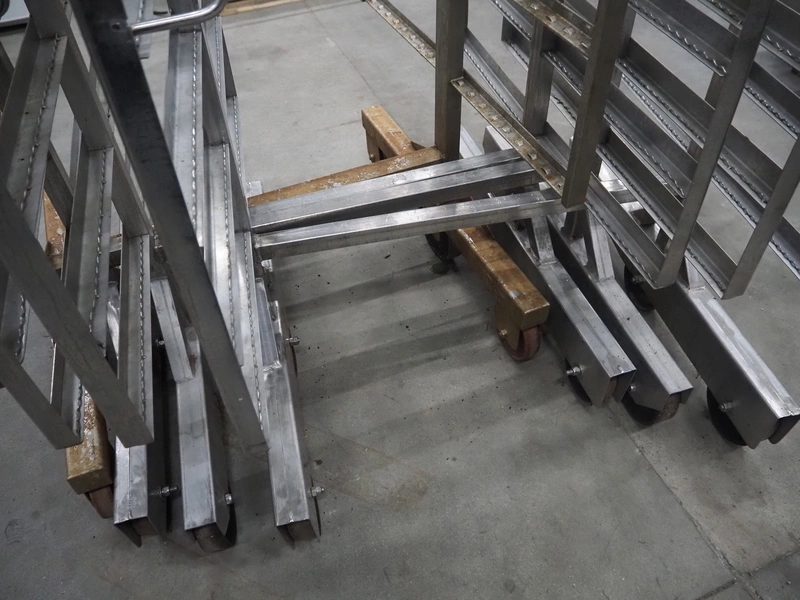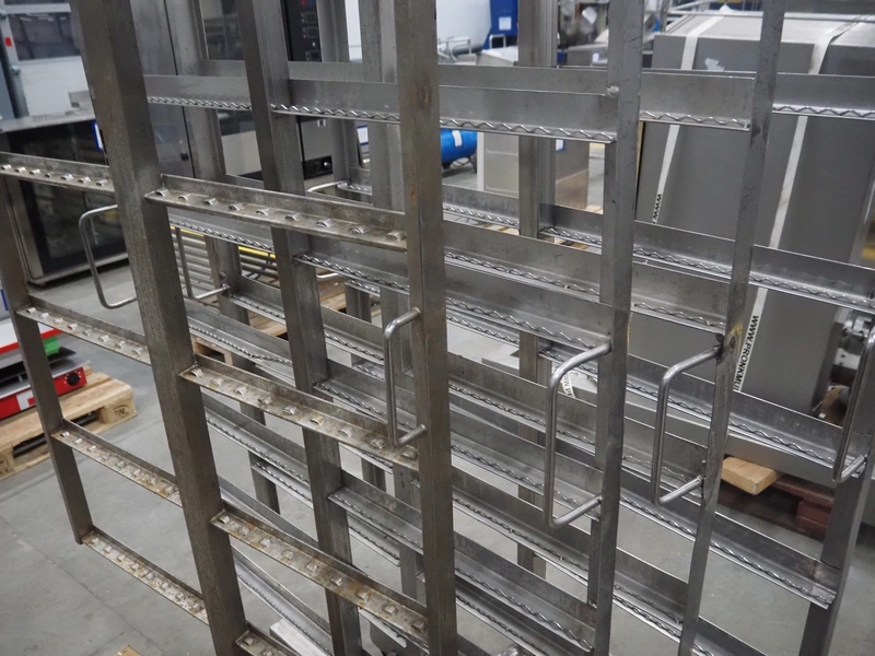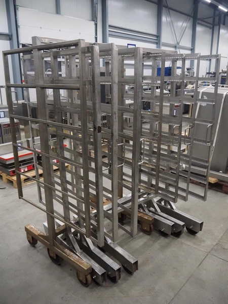 4 s/s smoke trolleys, 8 floors, dimensions each floor: 1010 mm x 1000 mm, total dimensions: (4x) 1020 mm x 1000 mm x 1960 mm.
