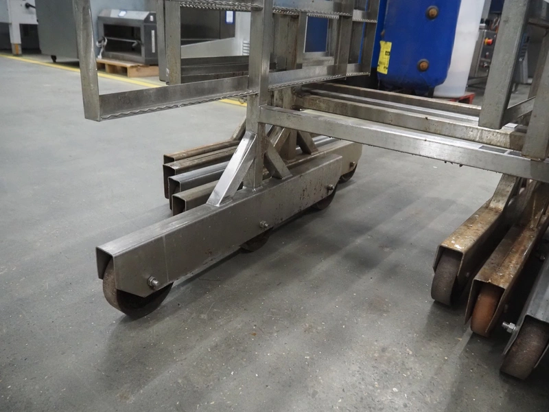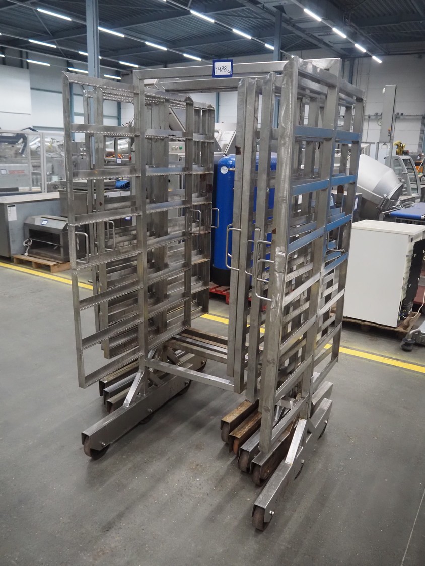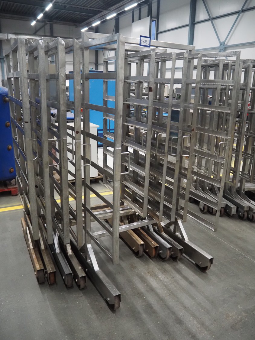 5 s/s smoke trolleys, 8 floors, dimensions each floor: 1010 mm x 1000 mm, total dimensions: (5x) 1020 mm x 1000 mm x 1960 mm.