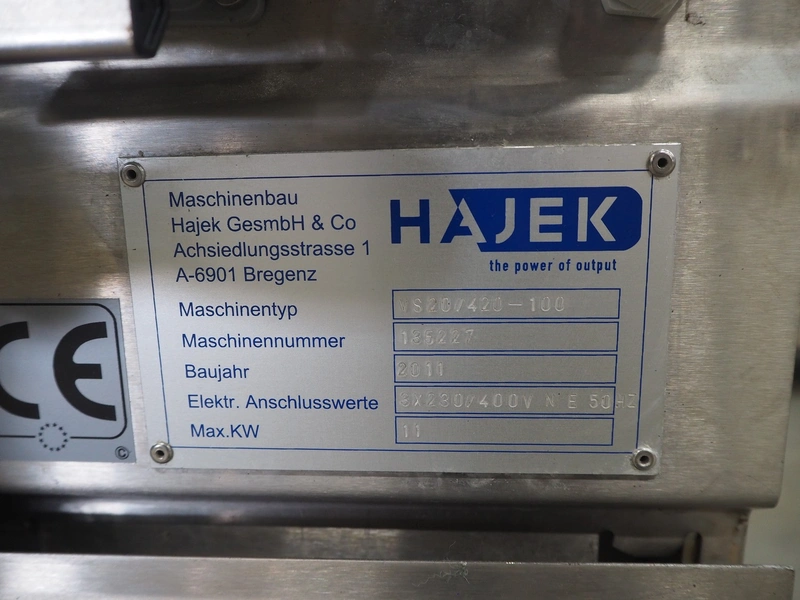 Hajek thermoformer, type: VS20/420-100, number: 135227, year of construction: 2011, 230/400 V, 3 Ph, 50 Hz, 11 kW, film width: 420 mm, dyes: 180 m x 180 mm, total dimensions: 2320 mm x 960 mm x 1770 mm.