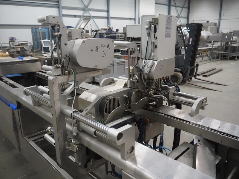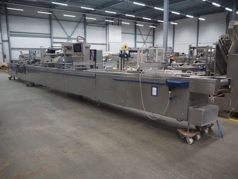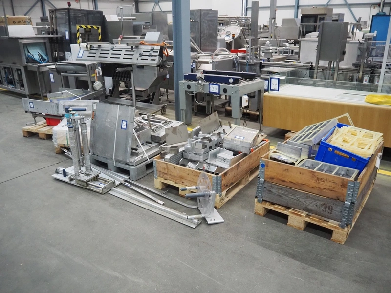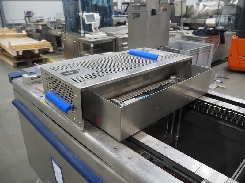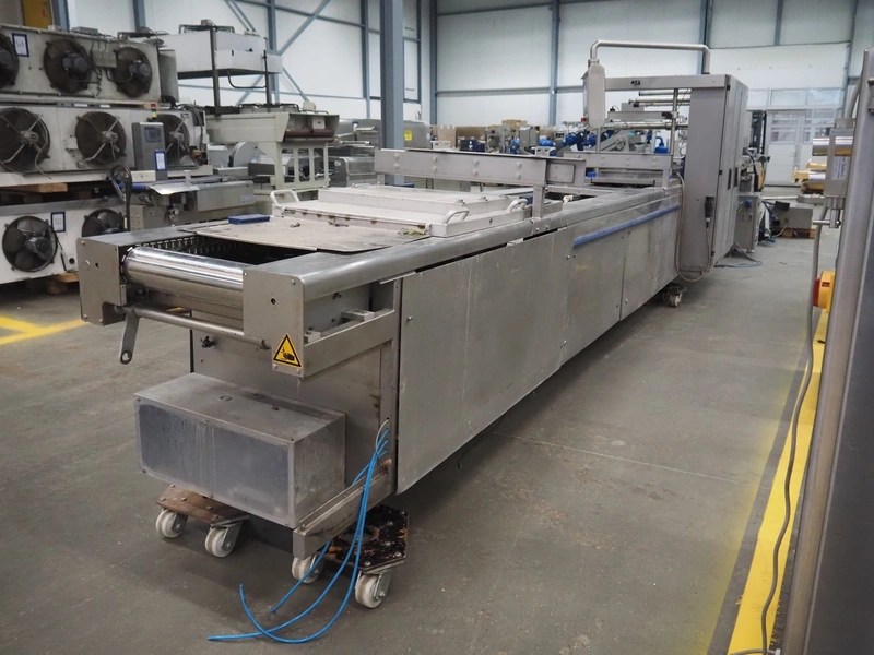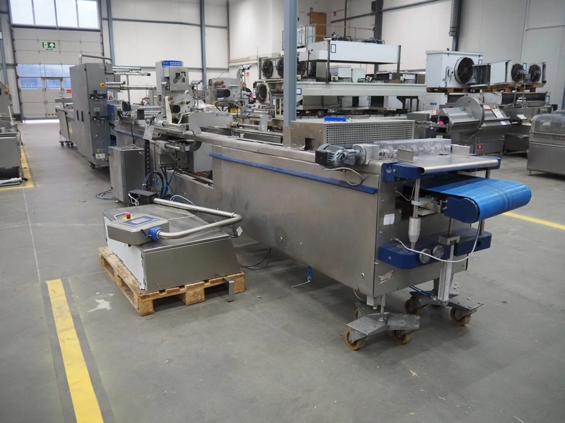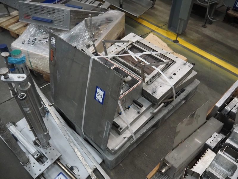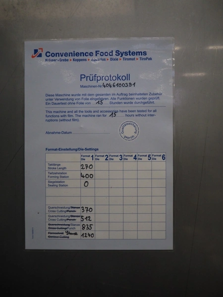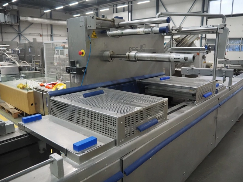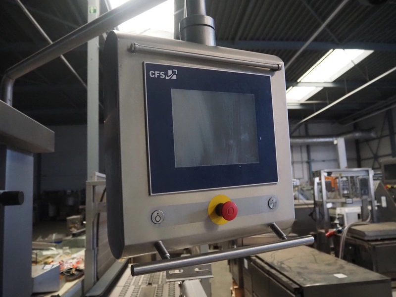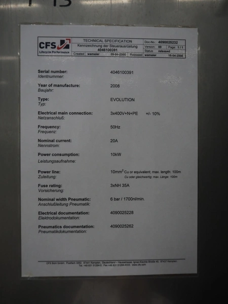 CFS thermoformer, type: EVOLUTION, serial number: 4046100391, year of construction: 2008, 400 V, 3 Ph, 50 Hz, 20 A, 10 kW, film width: 350 mm, dyes: (4x) 300 mm x 90 mm, index: 470 mm, belt width: 430 mm, label width: 85 mm, plastic belt, belt width: 420 mm, total dimensions: 13400 mm x 1300 mm x 2160 mm. Including 5 pallets with machine parts, amoung others: dyes: (8x) 200 mm x 65 mm, (3x) 255 mm x 130 mm. Transport rollies not included.