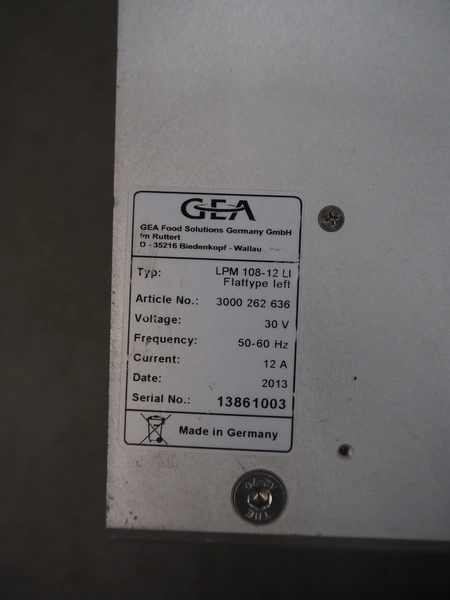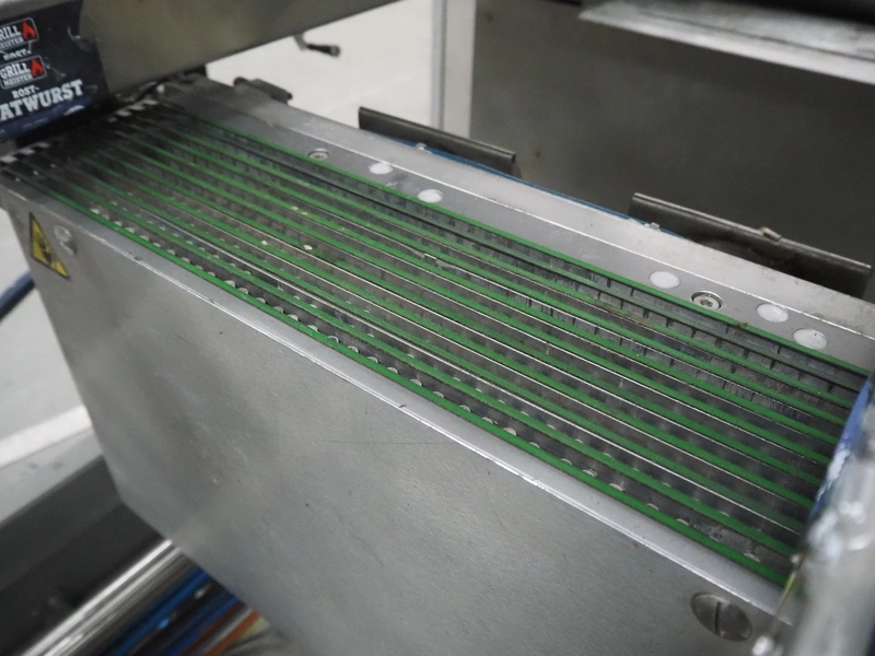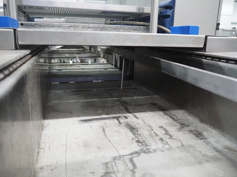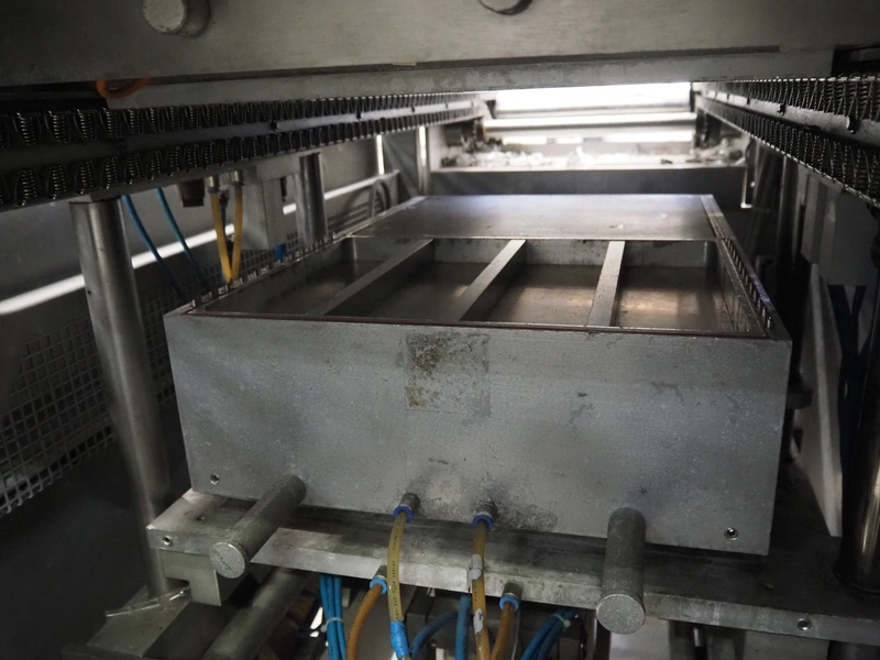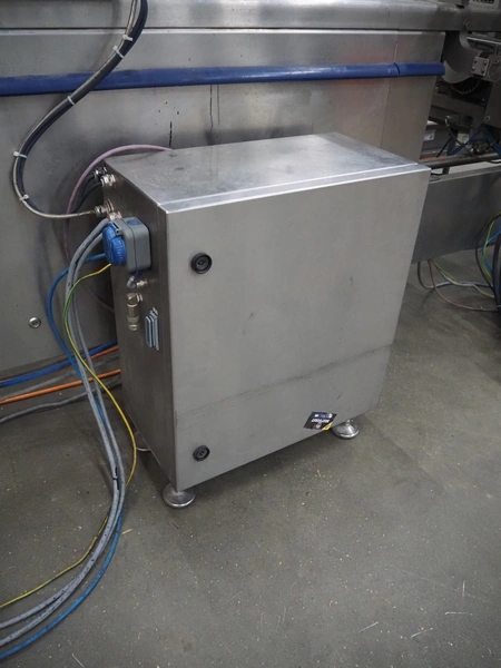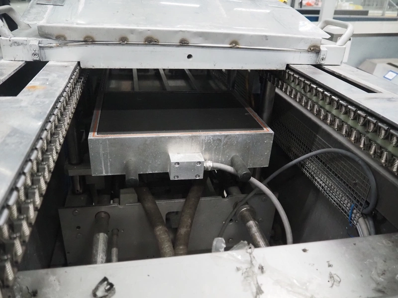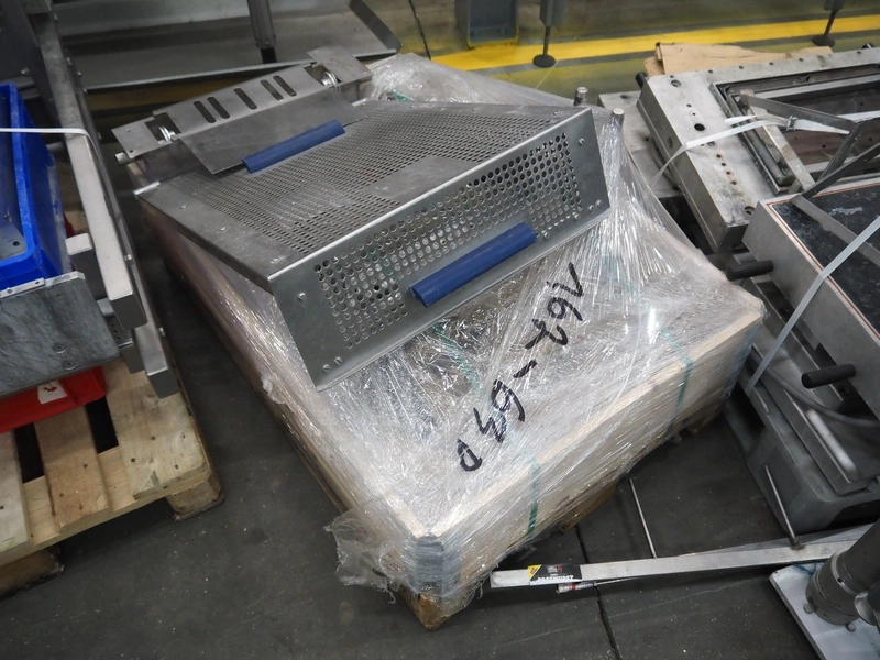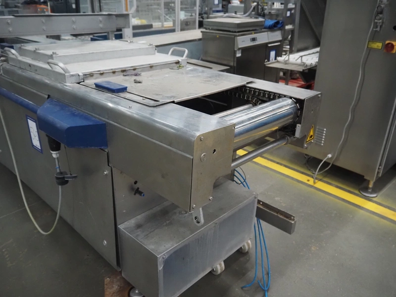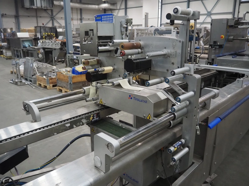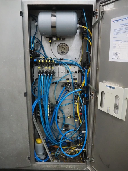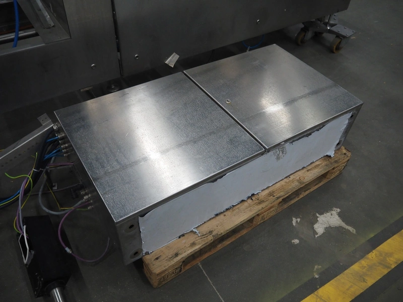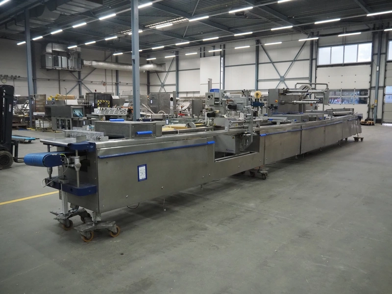 CFS thermoformer, type: EVOLUTION, serial number: 4046100391, year of construction: 2008, 400 V, 3 Ph, 50 Hz, 20 A, 10 kW, film width: 350 mm, dyes: (4x) 300 mm x 90 mm, index: 470 mm, belt width: 430 mm, label width: 85 mm, plastic belt, belt width: 420 mm, total dimensions: 13400 mm x 1300 mm x 2160 mm. Including 5 pallets with machine parts, amoung others: dyes: (8x) 200 mm x 65 mm, (3x) 255 mm x 130 mm. Transport rollies not included.