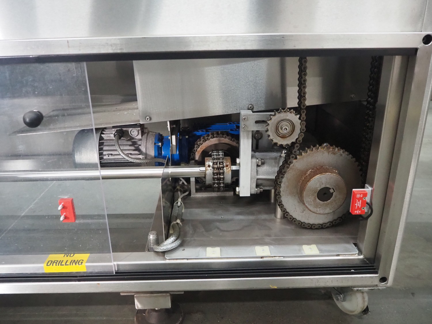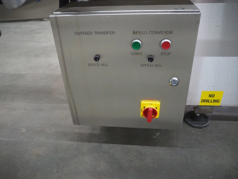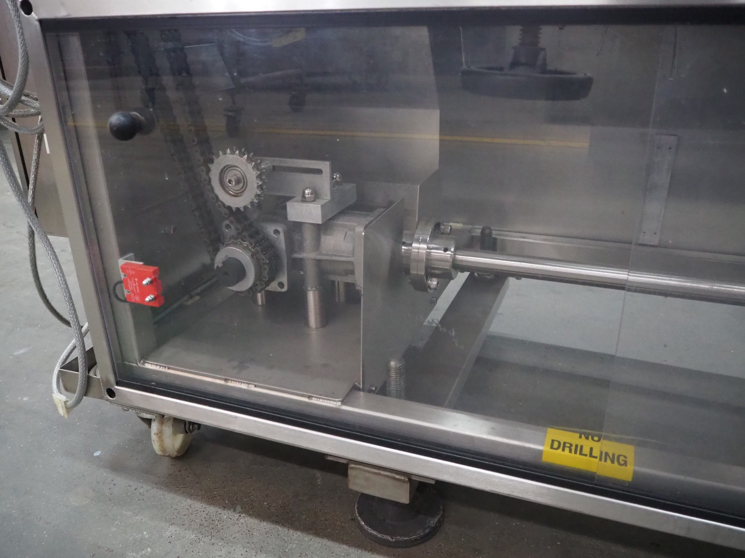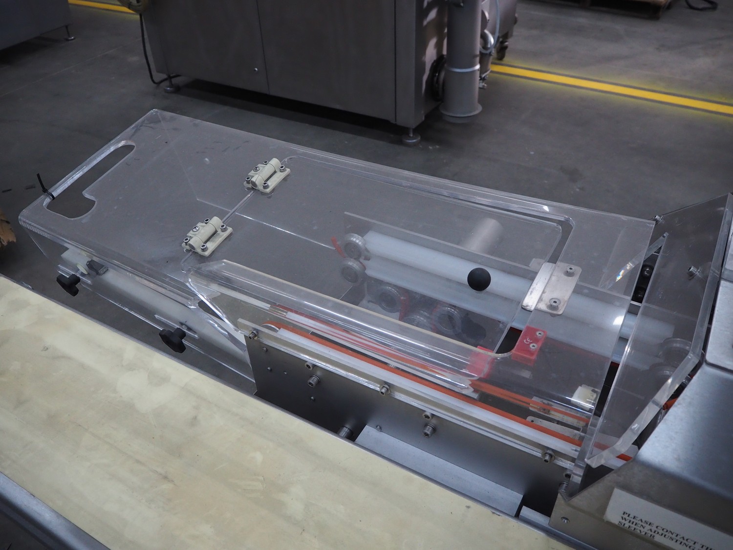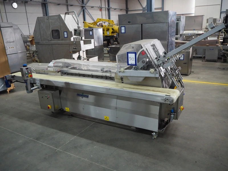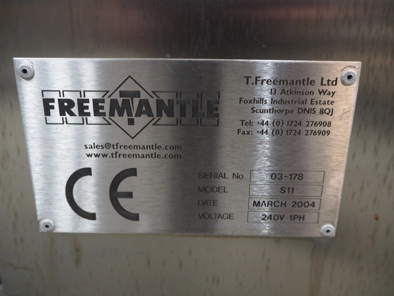 T. Freemantle Ltd. mobile semi automatic pre-glued sleever, model: S11, serial number: 03-178, year of construction: 03-2004, 240 V, 1 Ph, plastic belt, belt width: 250 mm, total dimensions: 4200 mm x 1200 mm x 1700 mm.