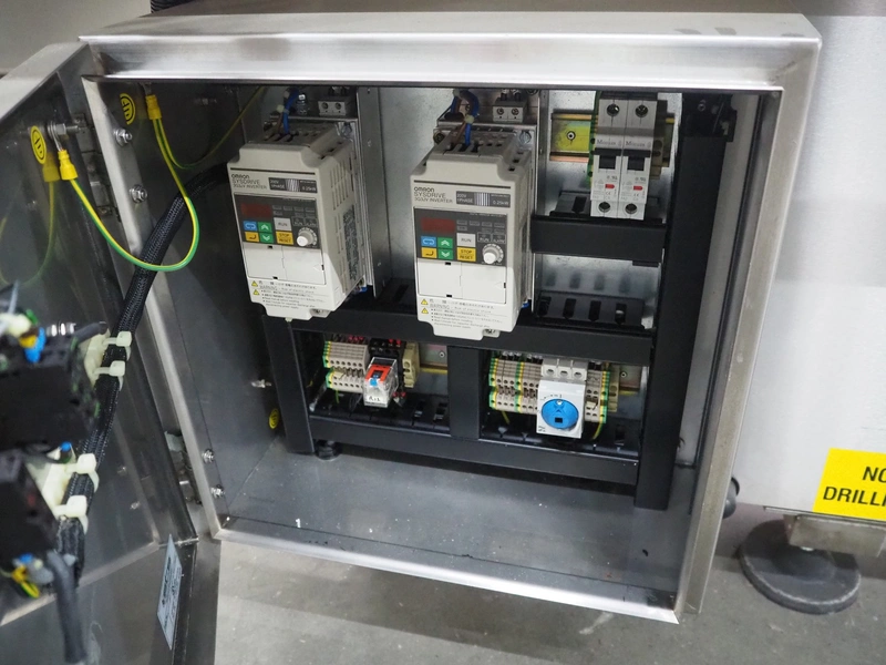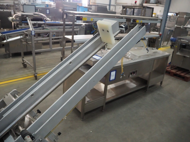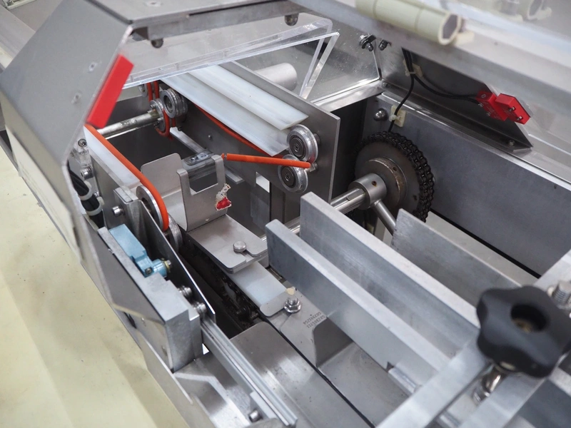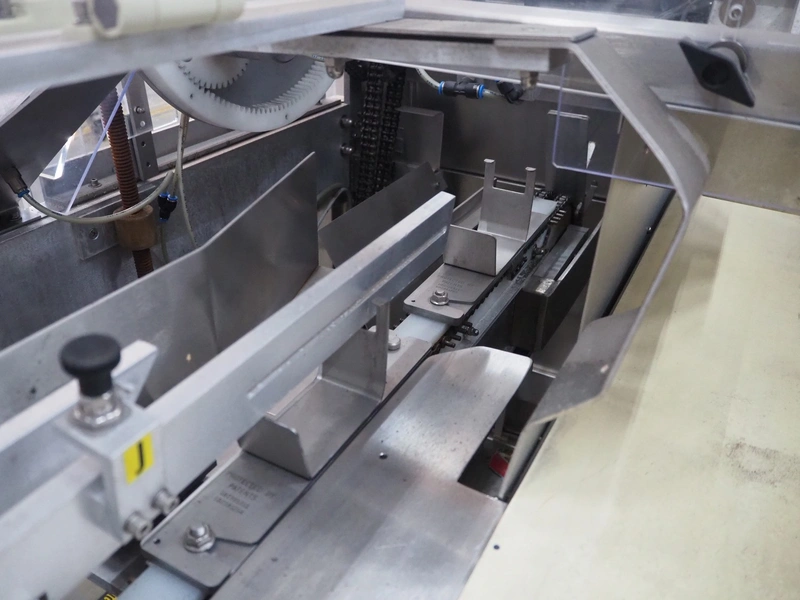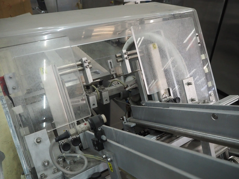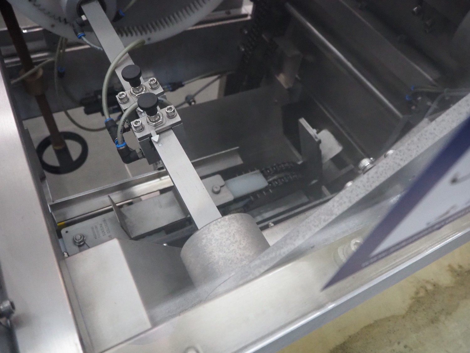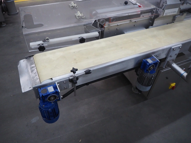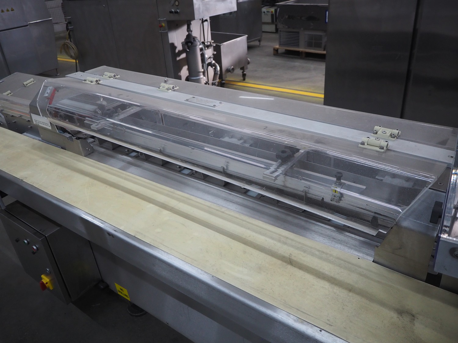 T. Freemantle Ltd. mobile semi automatic pre-glued sleever, model: S11, serial number: 03-178, year of construction: 03-2004, 240 V, 1 Ph, plastic belt, belt width: 250 mm, total dimensions: 4200 mm x 1200 mm x 1700 mm.