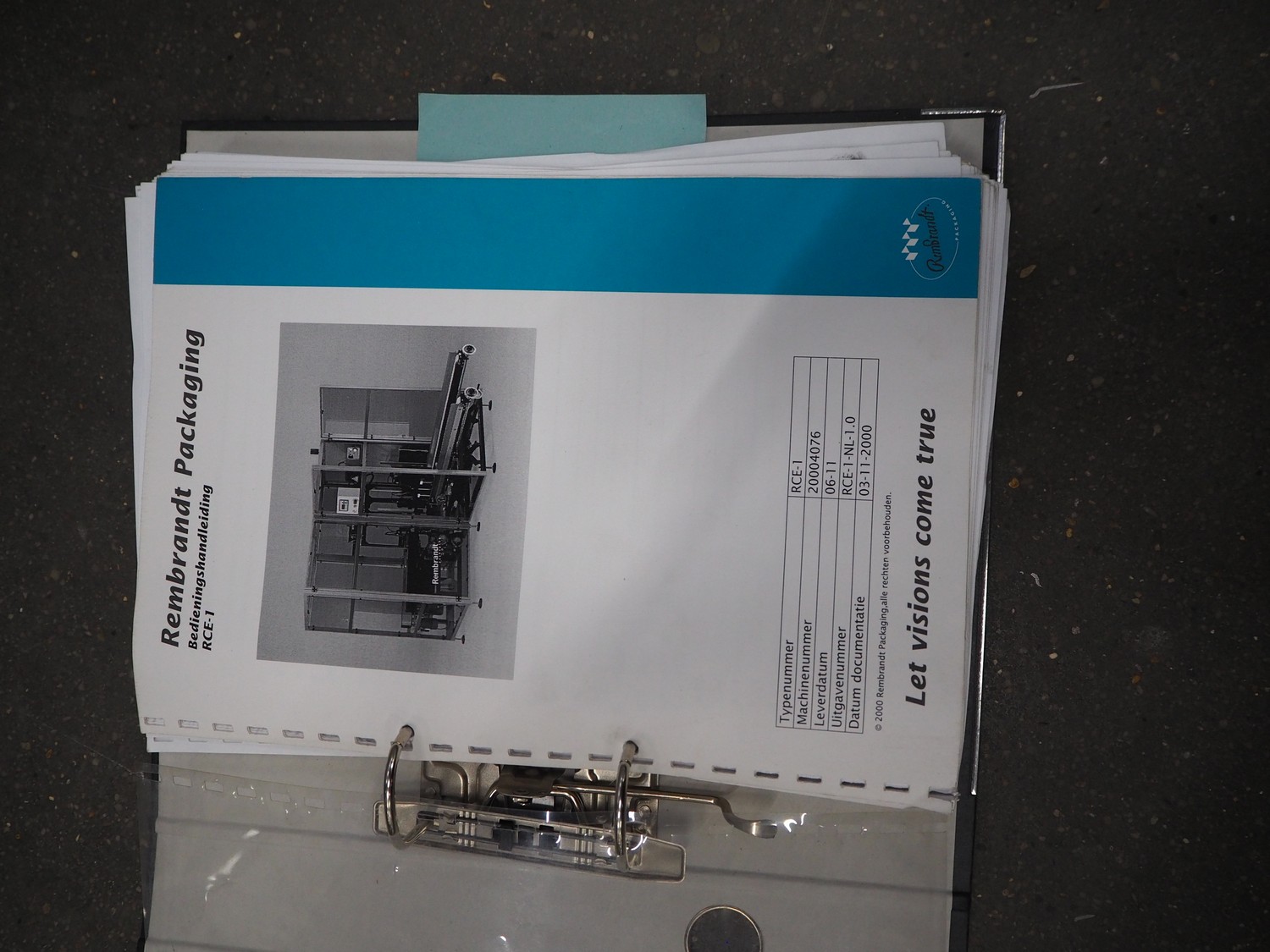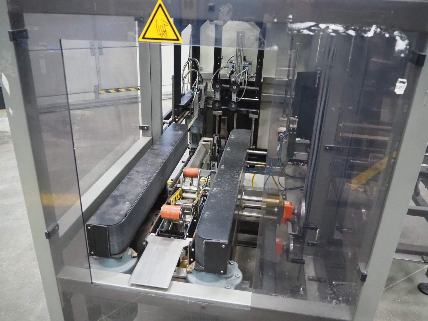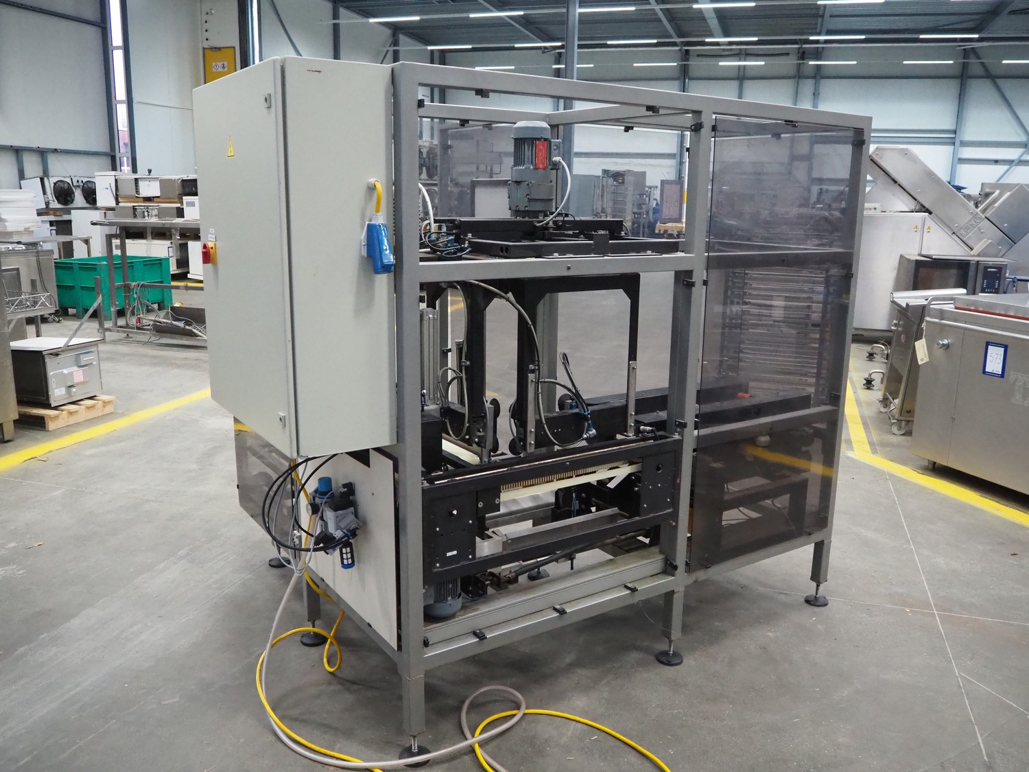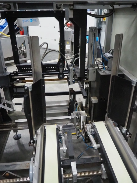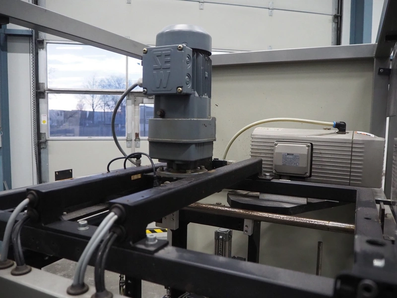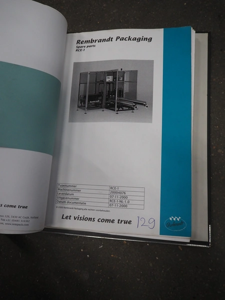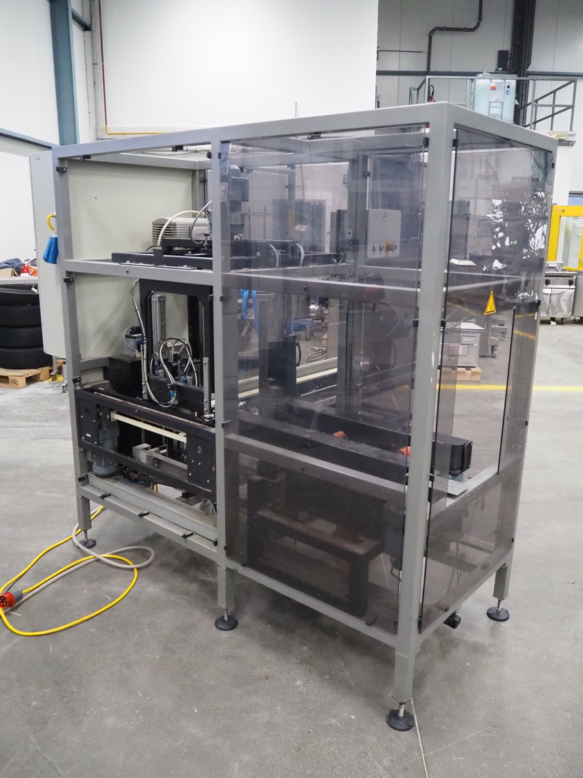 Rembrandt Packaging carton erector, type: RCE-1-T, serial number: 20004076, year of construction: 2000, 400 V, 3 Ph, 50 Hz, 1.6 kW, plastic belts, belt width: 70 mm and 100 mm, working width: 445 mm and 205 mm, clearance: 625 mm x 420 mm, Becker vacuum pump, type: VT 4.16, 16/19 m³ per hour, total dimensions: 2350 mm x 2420 mm x 2000 mm.