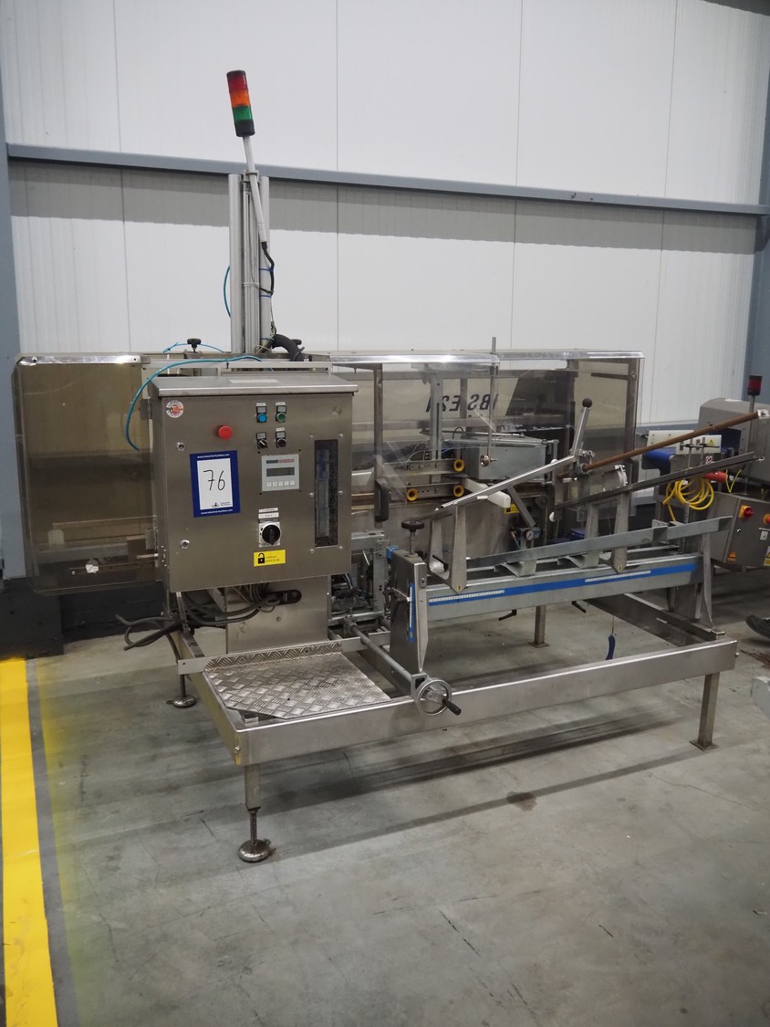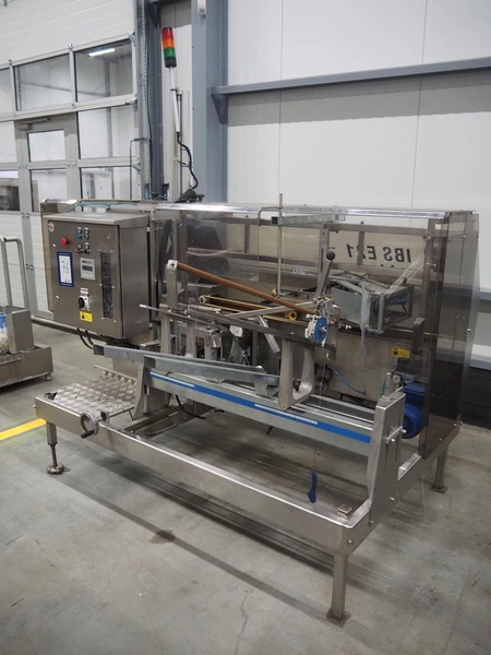 Lundgrens IBS carton erector, type: E21, serial number: 99-291, 230/400 V, 3 Ph, 50/60 Hz, 3.7 kW, air pressure: 600 kPa, infeed width: 630 mm, total dimensions: 2500 mm x 1900 mm x 2250 mm.