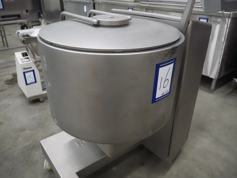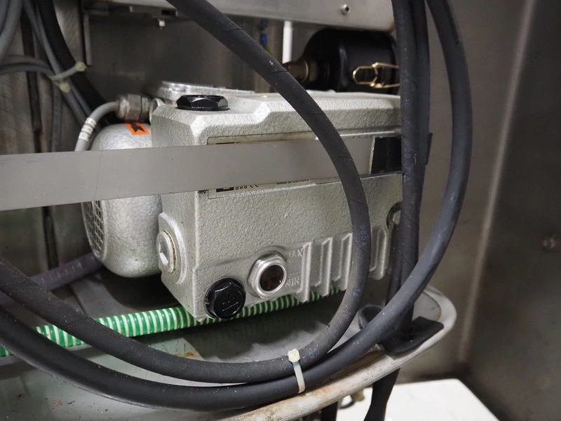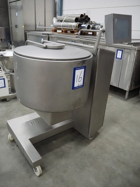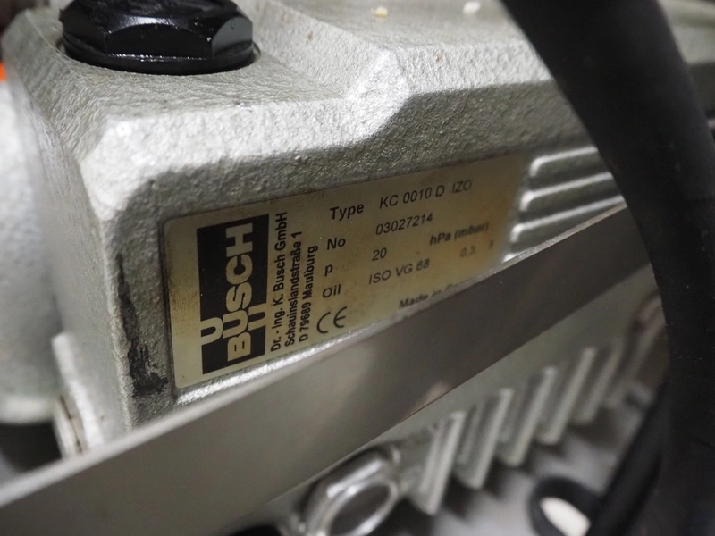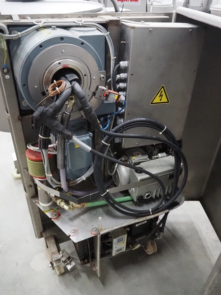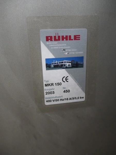 Rühle mobile cooled vacuum tumbler, type: MKR 150, number: 450, year of construction: 2003, 400 V, 50 Hz, 16 A, 3 kW, volume: 150 liter, Busch vacuum pump, type: KC 0010 D IZO, number: 03027214, capacity: 10 m³ per hour, total dimensions: 1250 mm x 980 mm x 1480 mm. Technical condition unknown, electric failure.