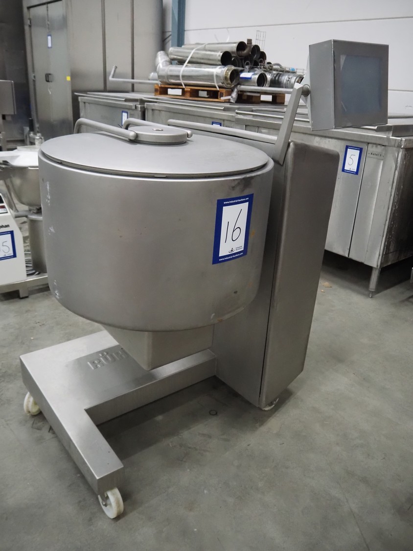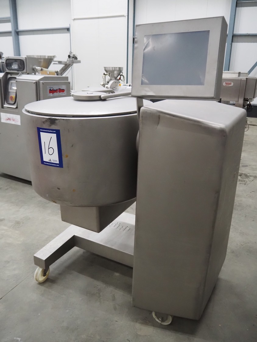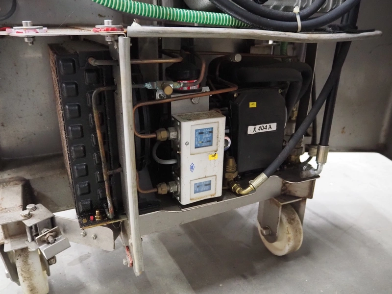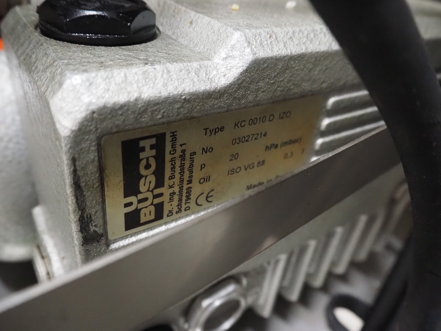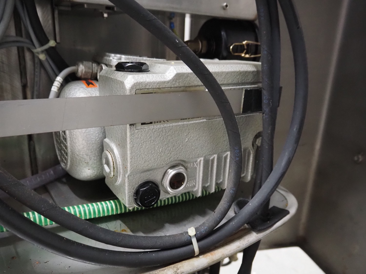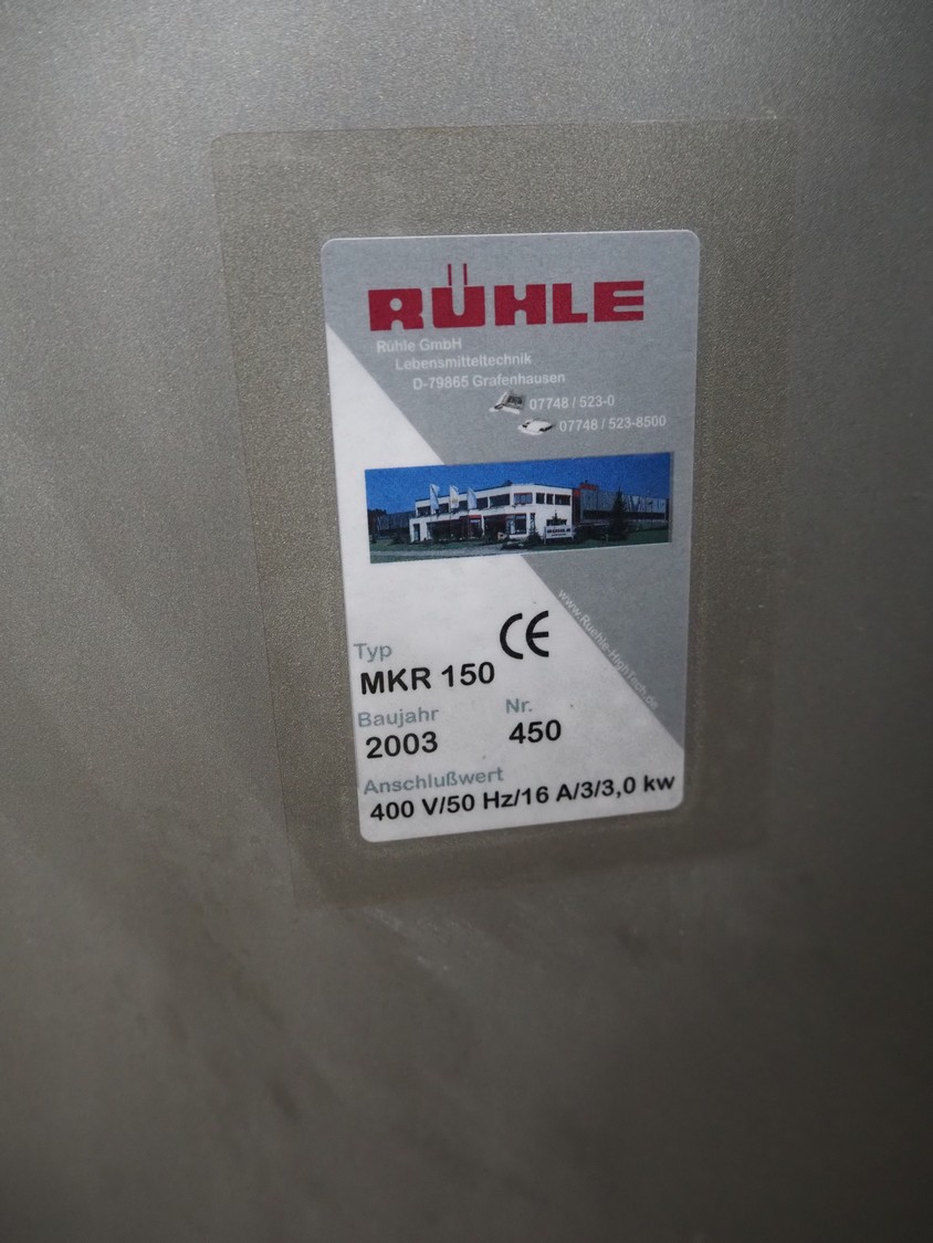 Rühle mobile cooled vacuum tumbler, type: MKR 150, number: 450, year of construction: 2003, 400 V, 50 Hz, 16 A, 3 kW, volume: 150 liter, Busch vacuum pump, type: KC 0010 D IZO, number: 03027214, capacity: 10 m³ per hour, total dimensions: 1250 mm x 980 mm x 1480 mm.