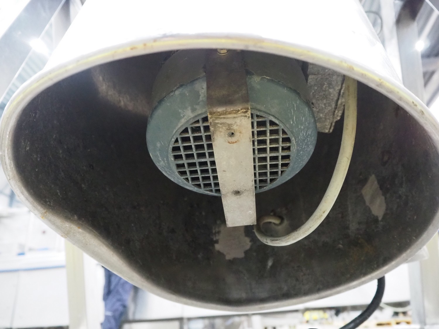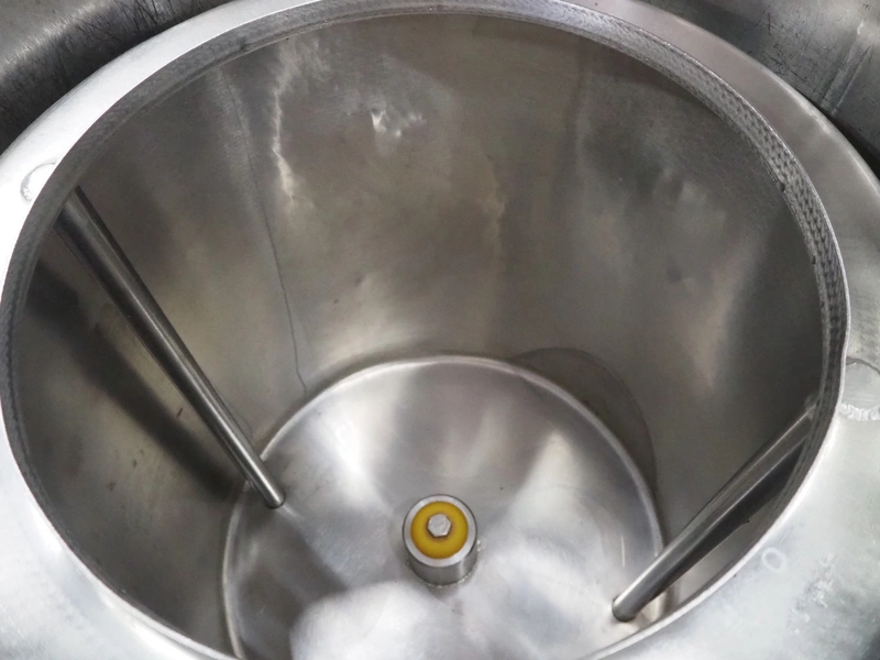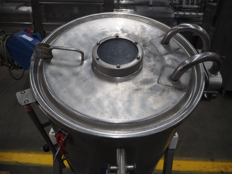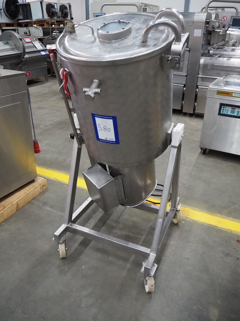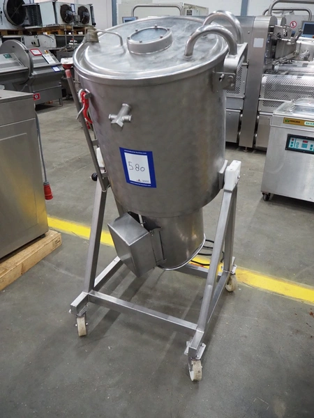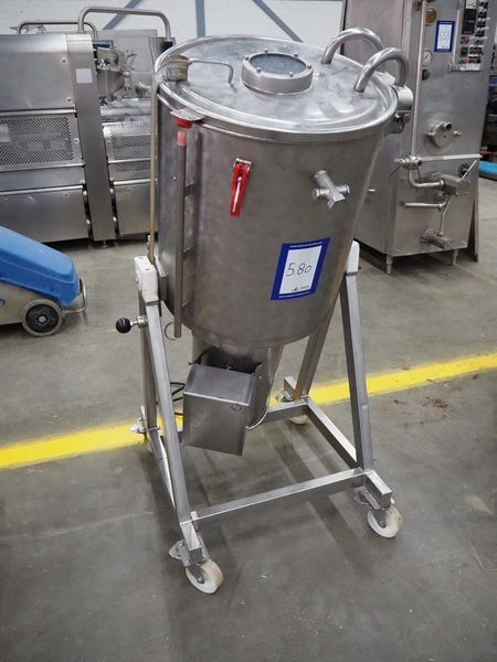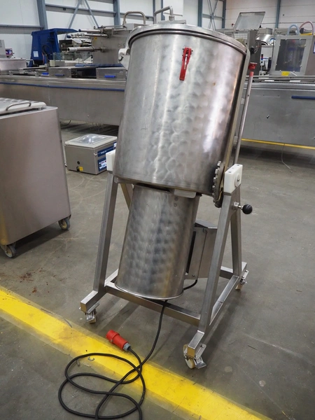 Mobile tiltable tumbler, dimensions inside: 600 mm x 600 mm x 550 mm, total dimensions: 860 mm x 860 mm x 1660 mm.