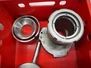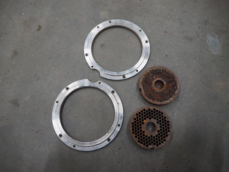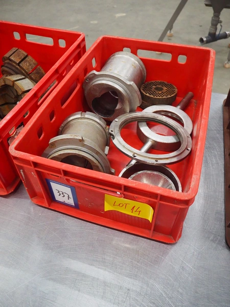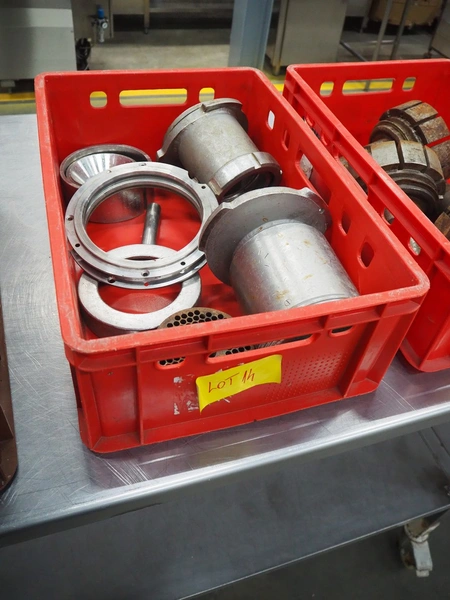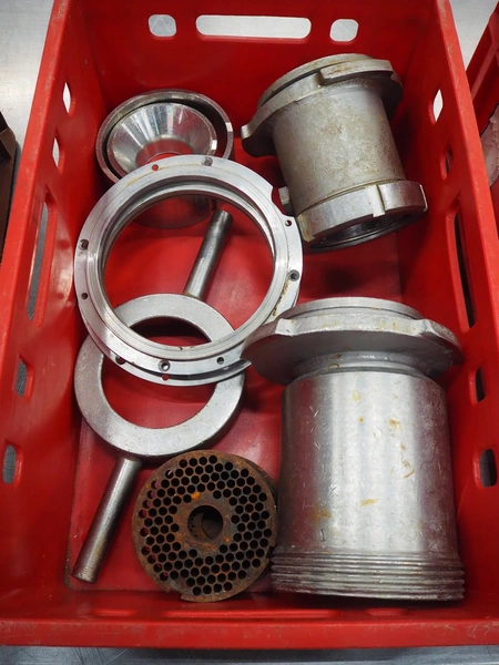Plastic crate with 2 Vemag grinder housings and plates for vacuum filling machine, diameter plate: 130 mm, total dimensions: 600 mm x 400 mm x 200 mm.