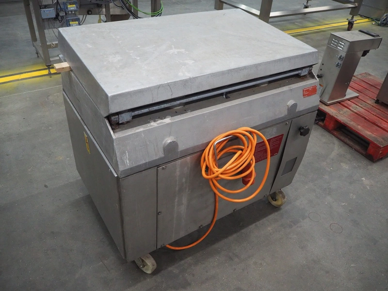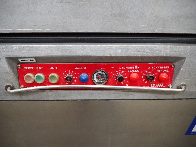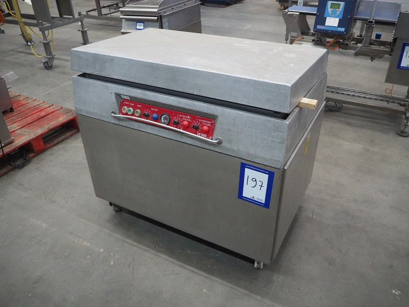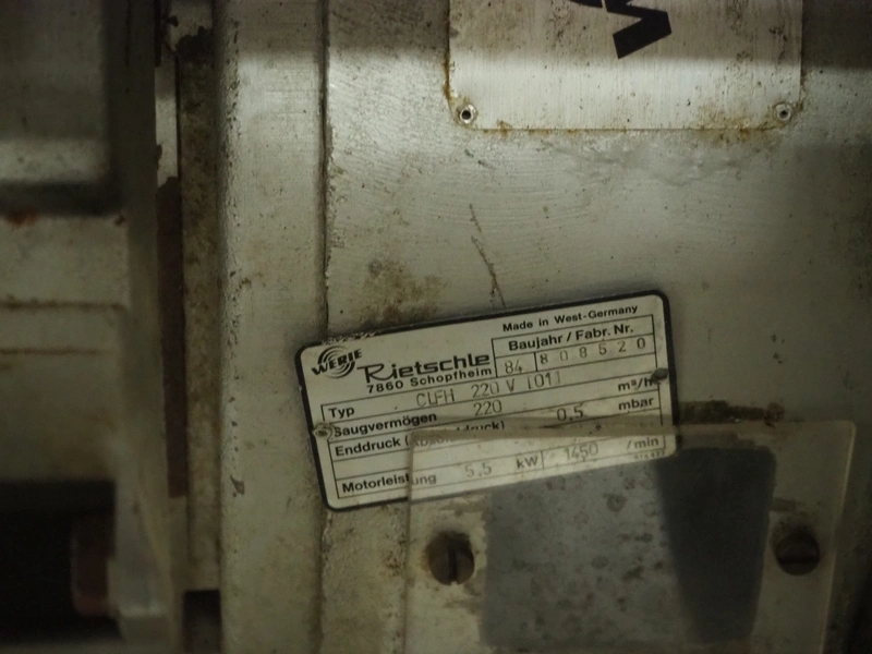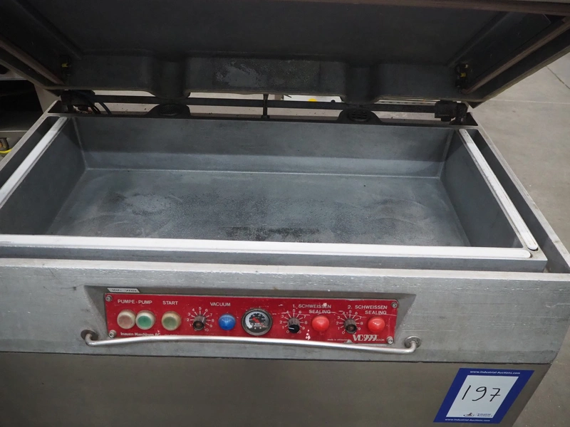 Inauen Maschinen AG mobile vacuum machine, type: VC999/03DK, machine number: 0384457, 380 V, 3 Ph, 50 Hz, 9 kW, dimensions chamber: 950 mm x 430 mm x 150 mm, seal length: 950 mm x (2x) 450 mm, Rietschle vacuum pump, type: CLFH 220 V 1011, capacity: 220 m³ per hour, total dimensions: 1150 mm x 800 mm x 1050 mm.