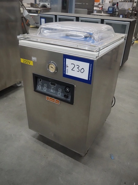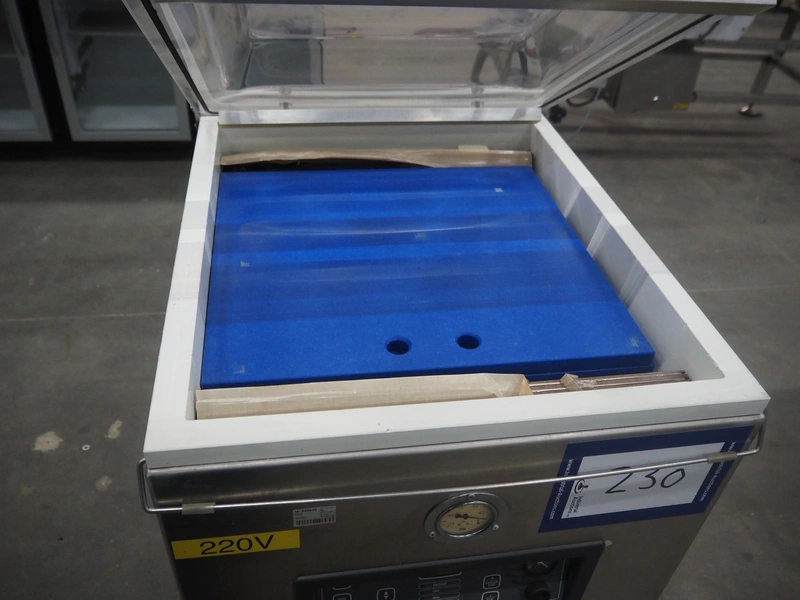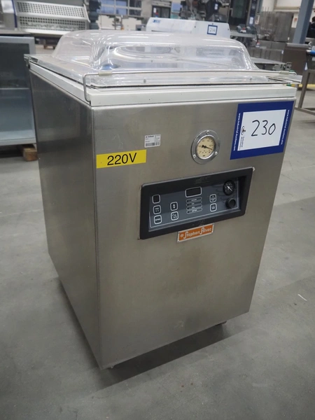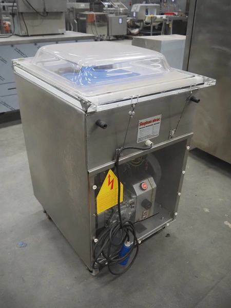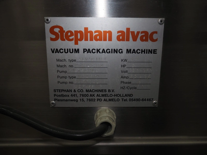 Stephan Alvac mobile vacuum machine, type: ALVAC II SM, machine number: 8069-2384, 220-380 V, 3 Ph, 50 Hz, 1.5 kW, seal length: 500 mm, Rietschle vacuum pump, type: VCA 60, total dimensions: 600 mm x 800 mm x 1000 mm.