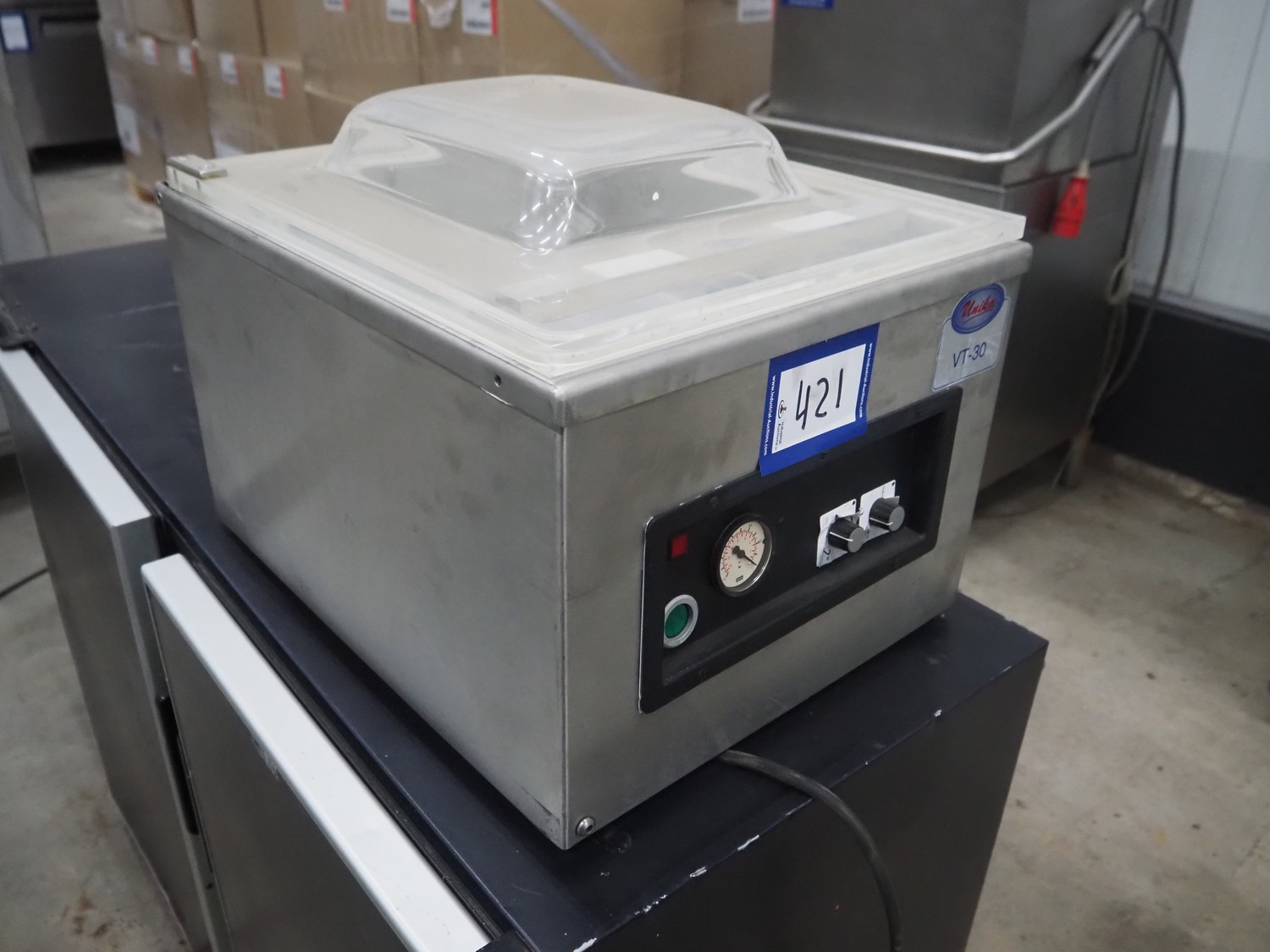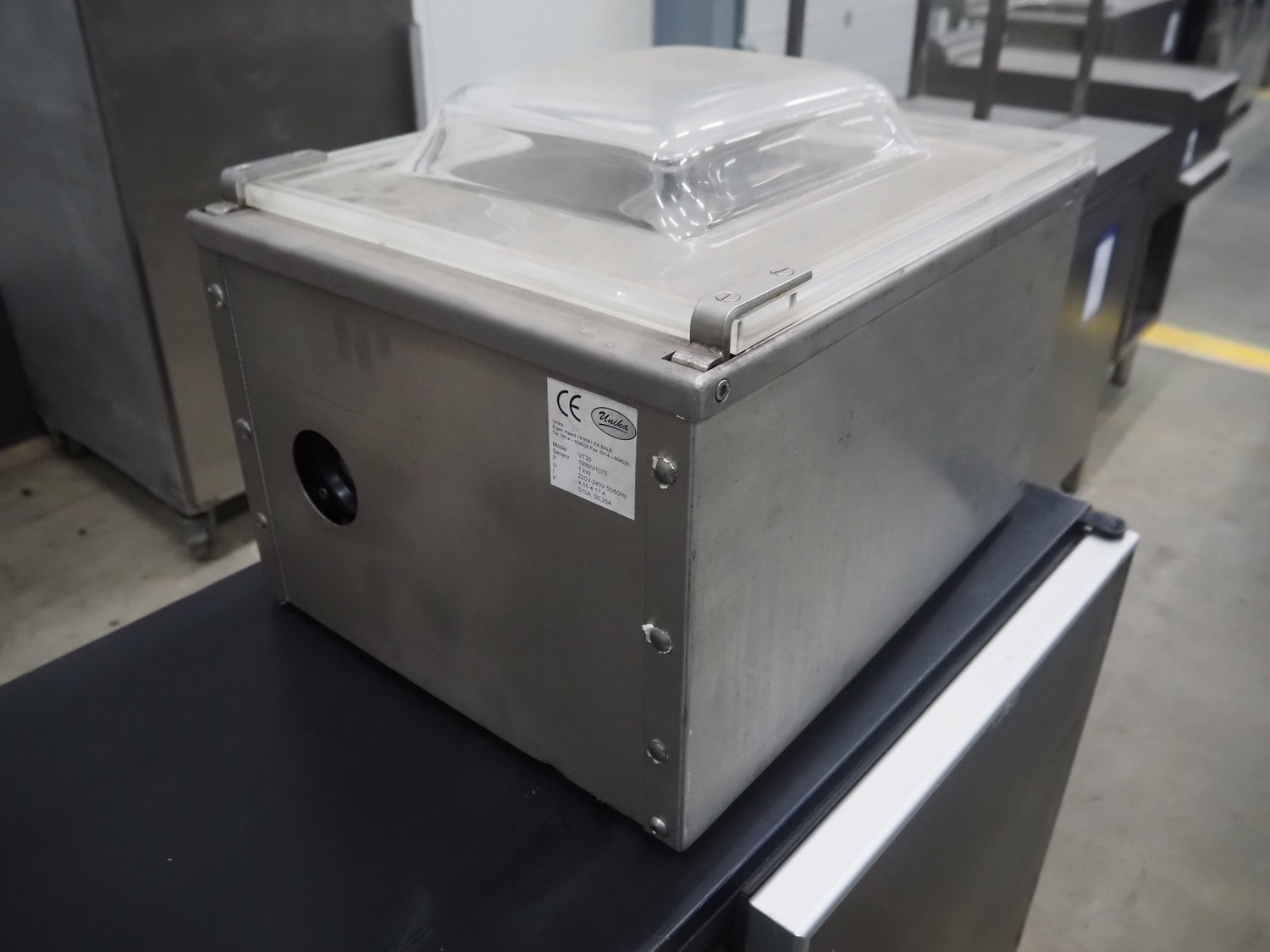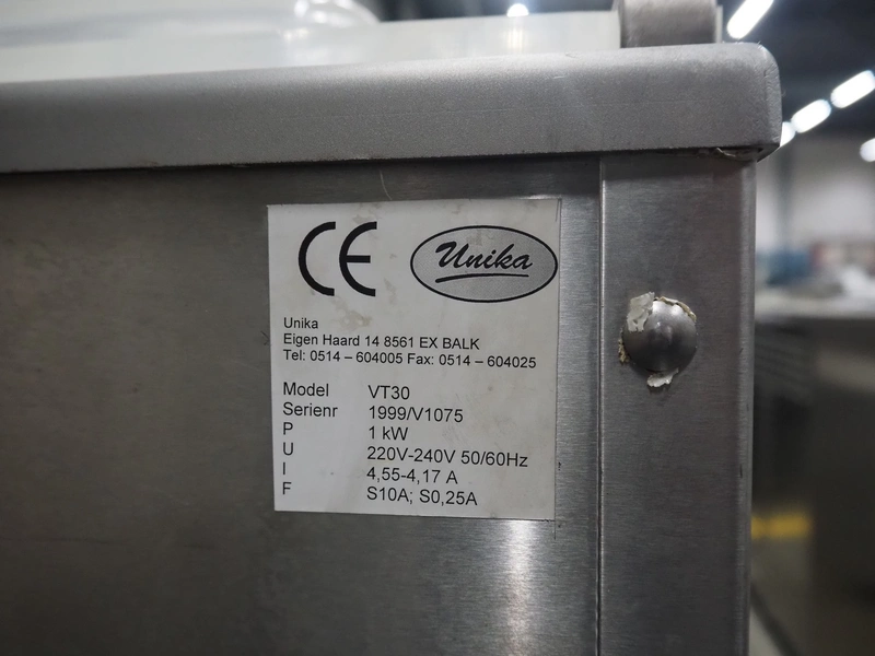 Unika table model vacuum machine, model: VT30, serial number: V1075, year of construction: 1999, 220/240 V, 50/60 Hz, 4.55/4.17 A, 1 kW, seal length: (1x) 340 mm, total dimensions: 540 mm x 420 mm x 400 mm. Incomplete.