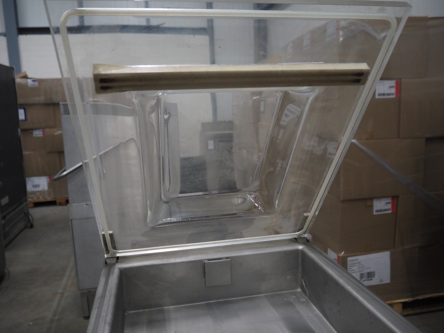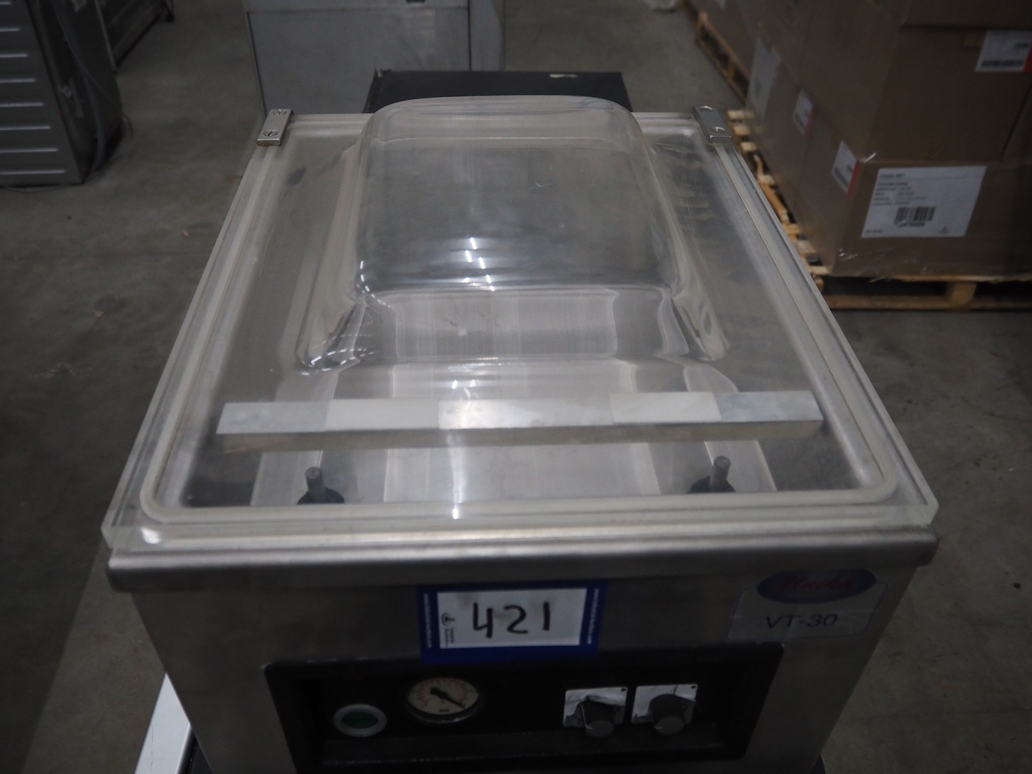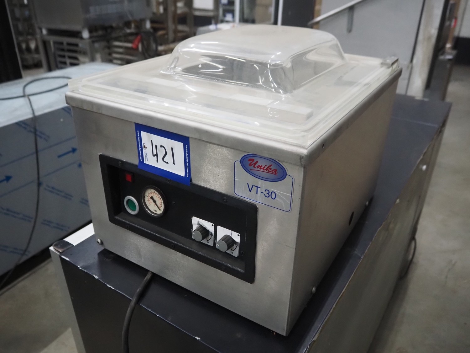 Unika table model vacuum machine, model: VT30, serial number: V1075, year of construction: 1999, 220/240 V, 50/60 Hz, 4.55/4.17 A, 1 kW, seal length: (1x) 340 mm, total dimensions: 540 mm x 420 mm x 400 mm. Incomplete.
