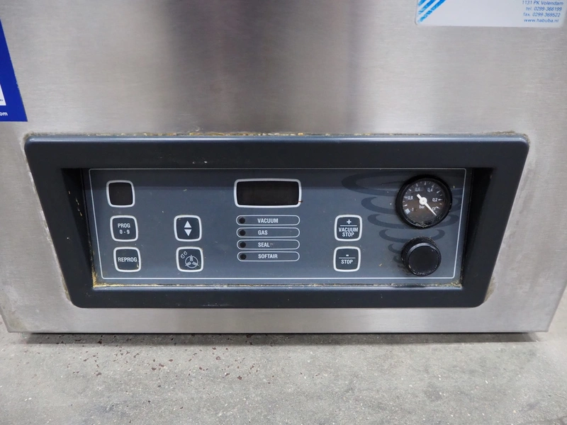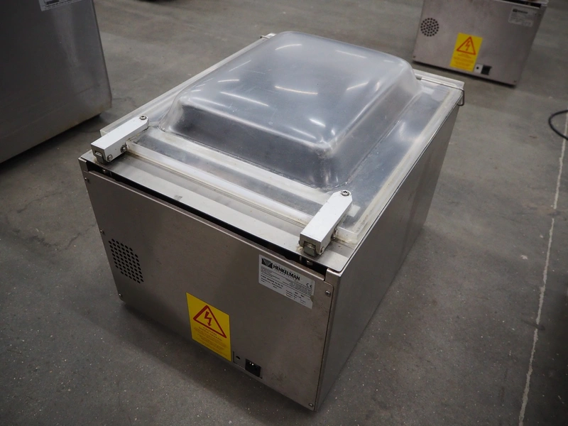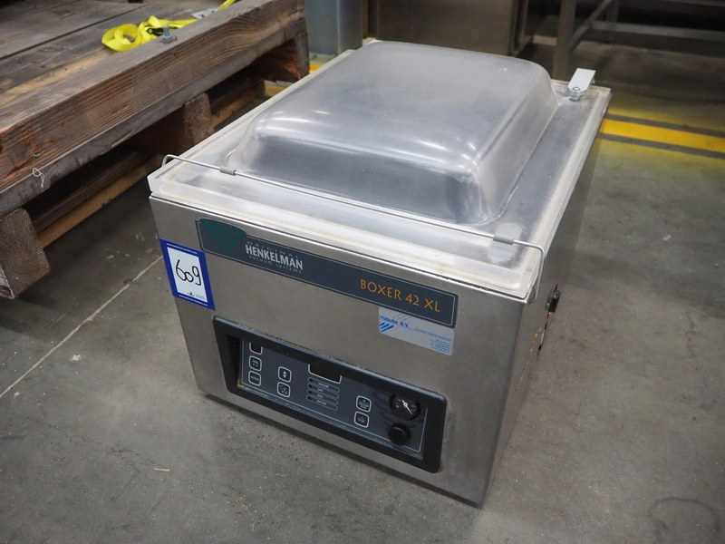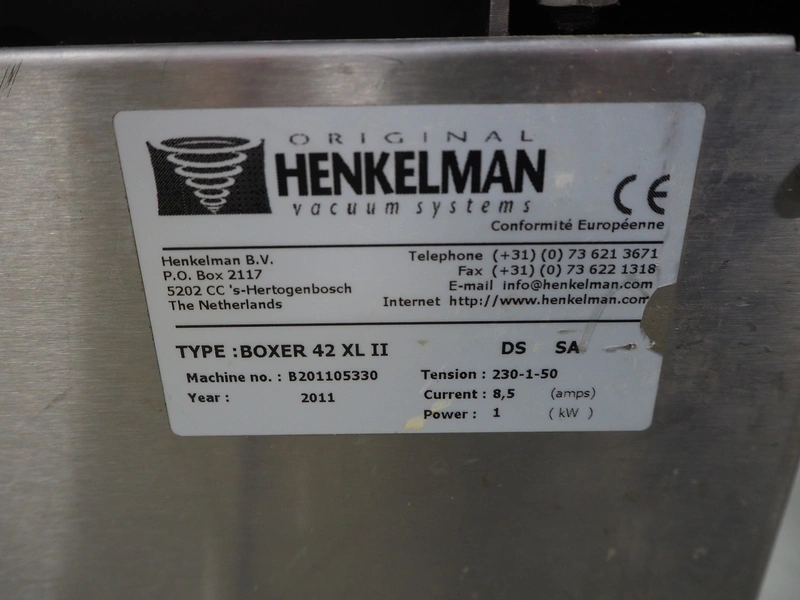 Henkelman vacuum machine, type: BOXER 42 XL II, machine number: B201105330, year of construction: 2011, 230 V, 1 Ph, 50 Hz, 8.5 A, 1 kW, seal length: 425 mm, dimensions chamber: 425 mm x 425 mm x 70 mm, total dimensions: 620 mm x 500 mm x 480 mm.