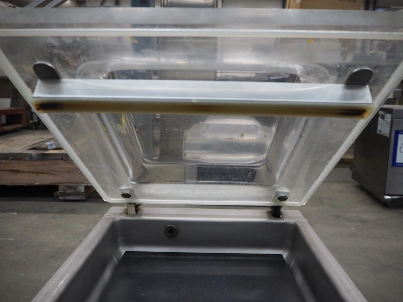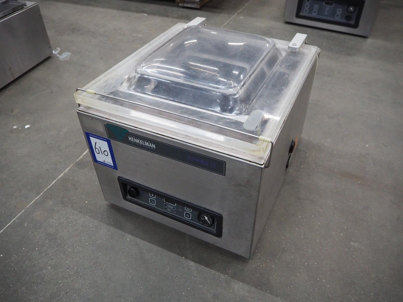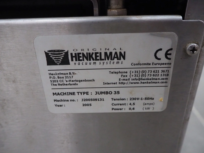 Henkelman vacuum machine, type: JUMBO 35, machine number: J200509131, year of construction: 2005, 230 V, 1 Ph, 50 Hz, 4.5 A, 0.6 kW, seal length: 360 mm, dimensions chamber: 360 mm x 365 mm x 45 mm, total dimensions: 550 mm x 450 mm x 430 mm.