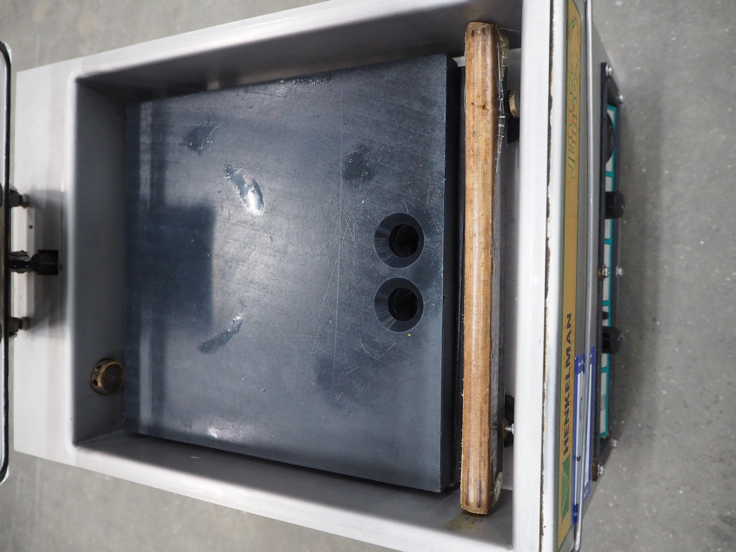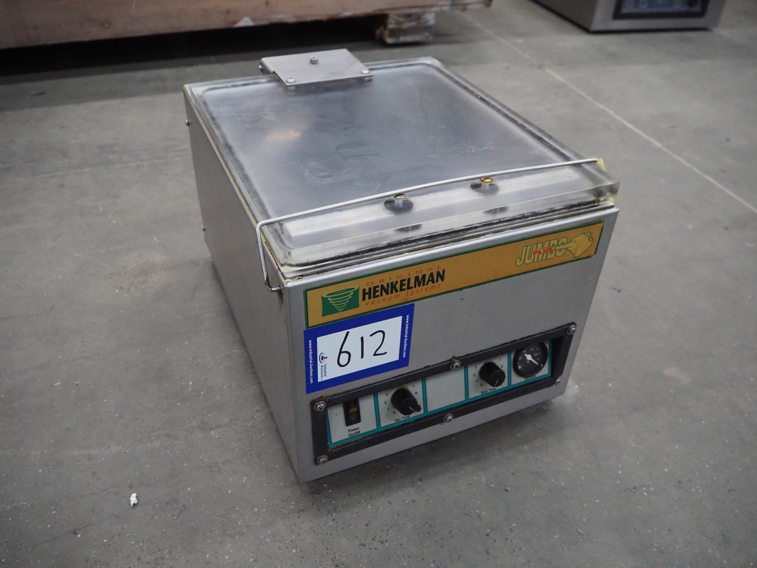 Henkelman vacuum machine, type: JUMBO PLUS, number: 10302039, year of construction: 2003, 230 V, 1 Ph, 50 Hz, 1 kW, seal length: 280 mm, dimensions chamber: 305 mm x 285 mm x 50 mm, total dimensions: 450 mm x 340 mm x 300 mm.