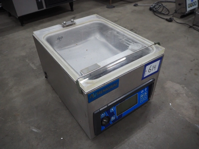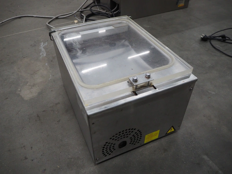 Henkovac vacuum machine, model: T2, serial number: 20160199, year of construction: 2016, 220-240 V, 1 Ph, 50/60 Hz, 2.5 A, seal length: 275 mm, dimensions chamber: 315 mm x 295 mm x 40 mm, pump capacity: 4 m³ per hour, total dimensions: 500 mm x 380 mm x 300 mm.