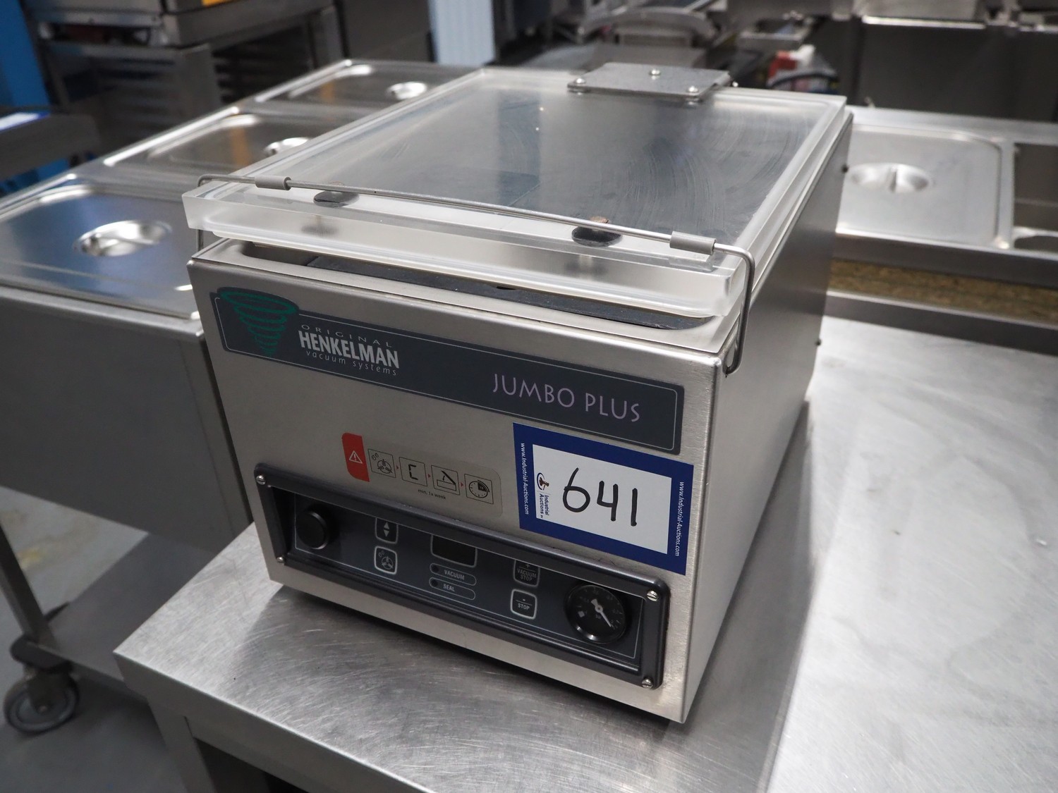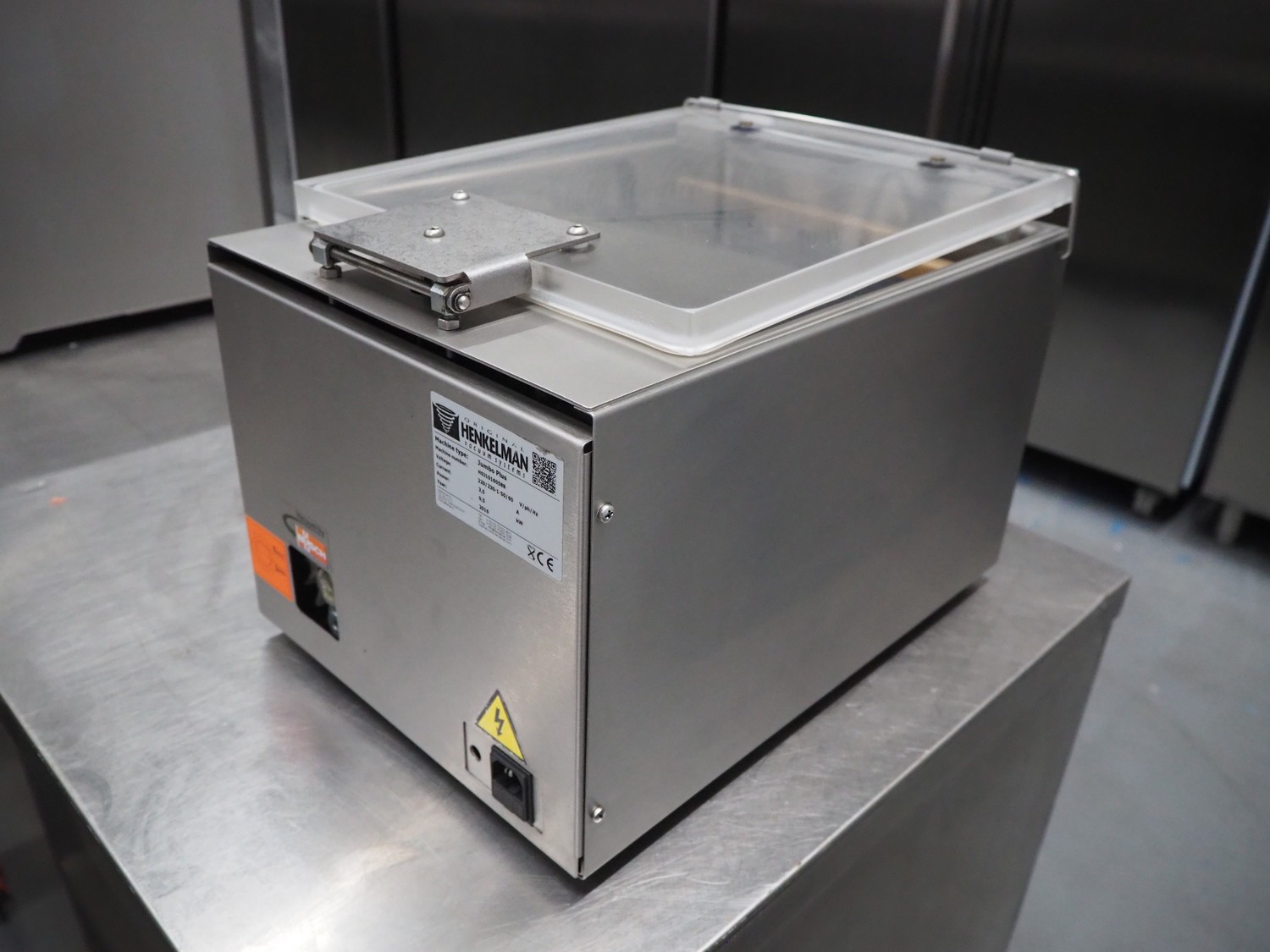 Henkelman vacuum machine, type: Jumbo Plus, machine number: H0J10160588, year of construction: 2016, 220/230 V, 1 Ph, 50/60 Hz, 3.5 A, 0.5 kW, seal length: 280 mm, chamber dimensions: 280 mm x 310 mm, total dimensions: 460 mm x 330 mm x 350 mm.