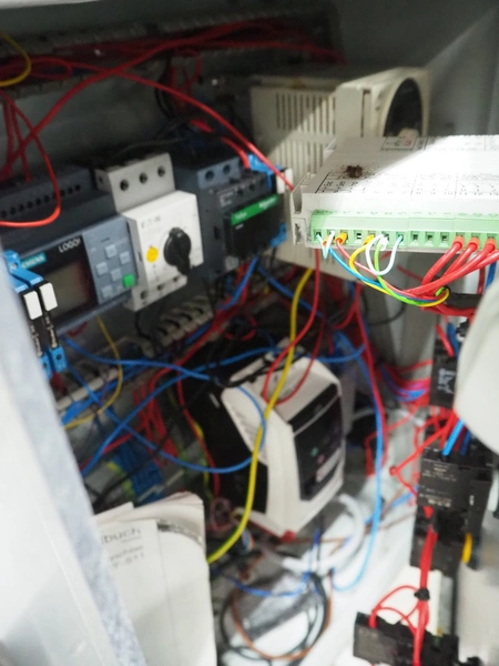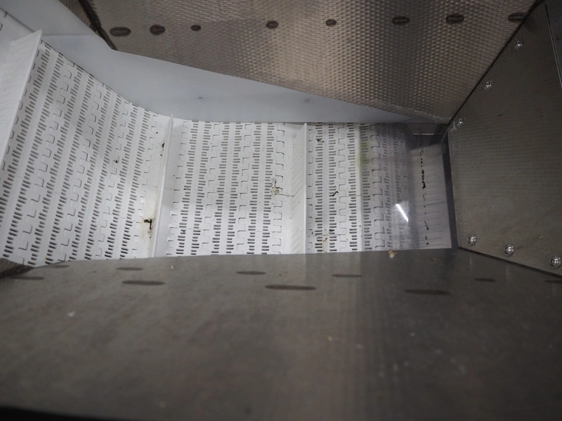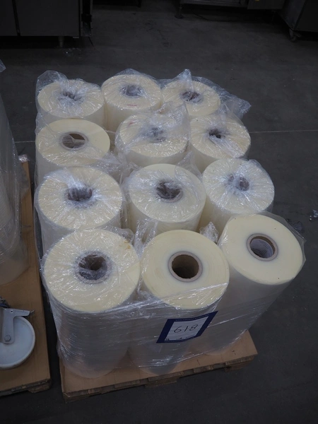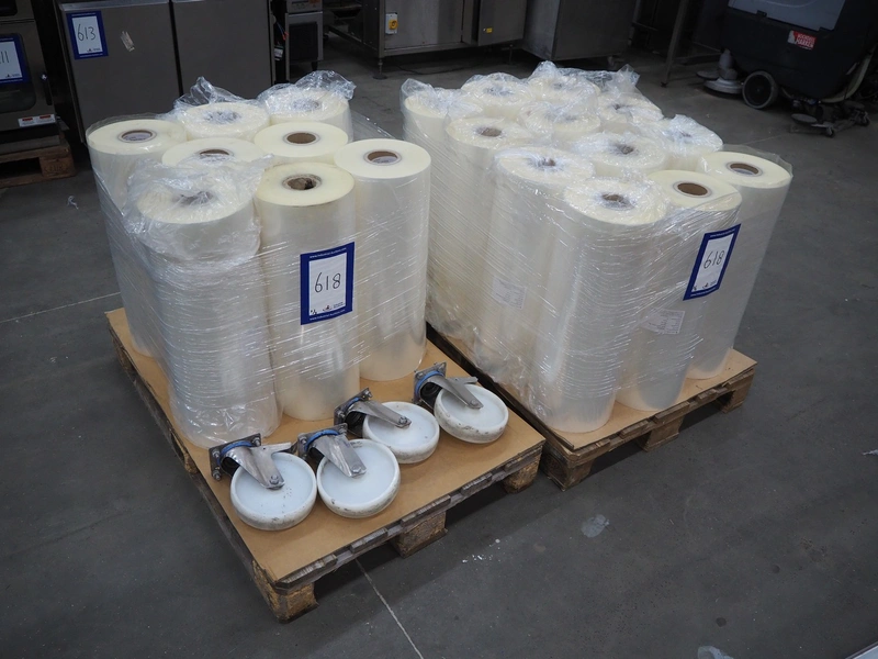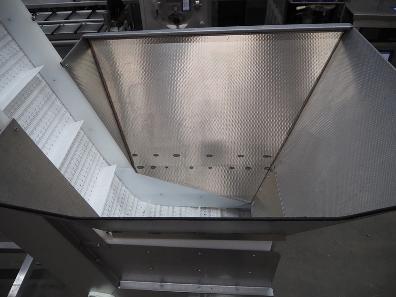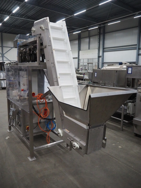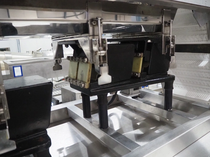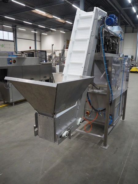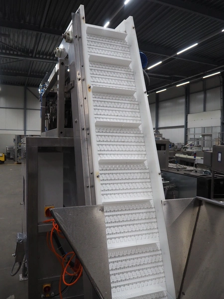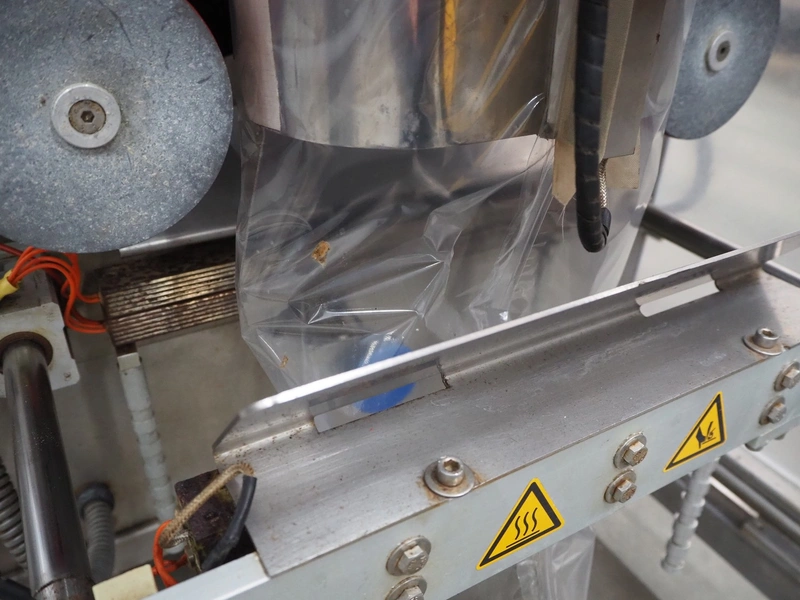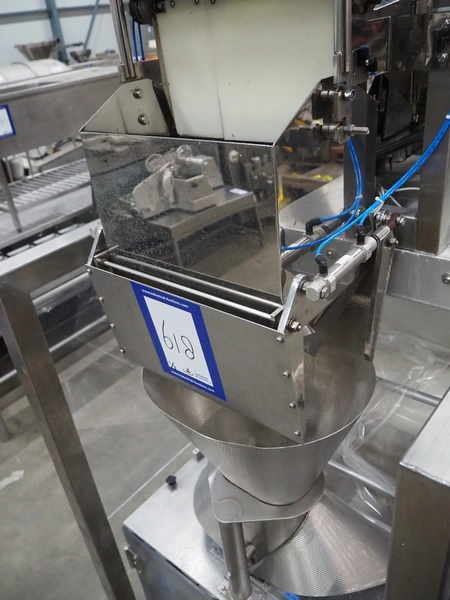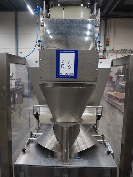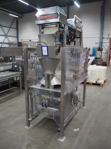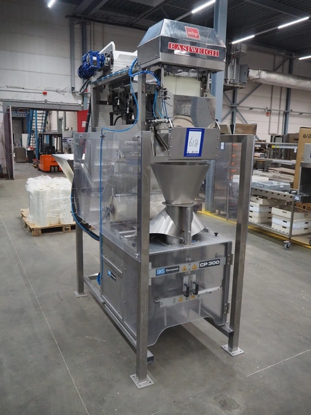 GKS Packaging vertical bag form-, fill- and seal machine with elevating belt, type: CP300HS-T, serial number: 04421, year of construction: 2012-01, plastic belt with dividers, belt width: 340 mm, distance between dividers: 195 mm, divider height: 50 mm, gutter width: 210 mm, film width: 640 mm, seal width: (2x) 350 mm, seal length: 240 mm, total dimensions: 3150 mm x 1000 mm x 2550 mm. Including 2 pallets with 20 film rolls .