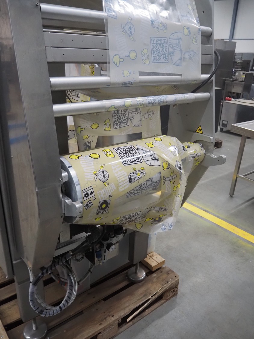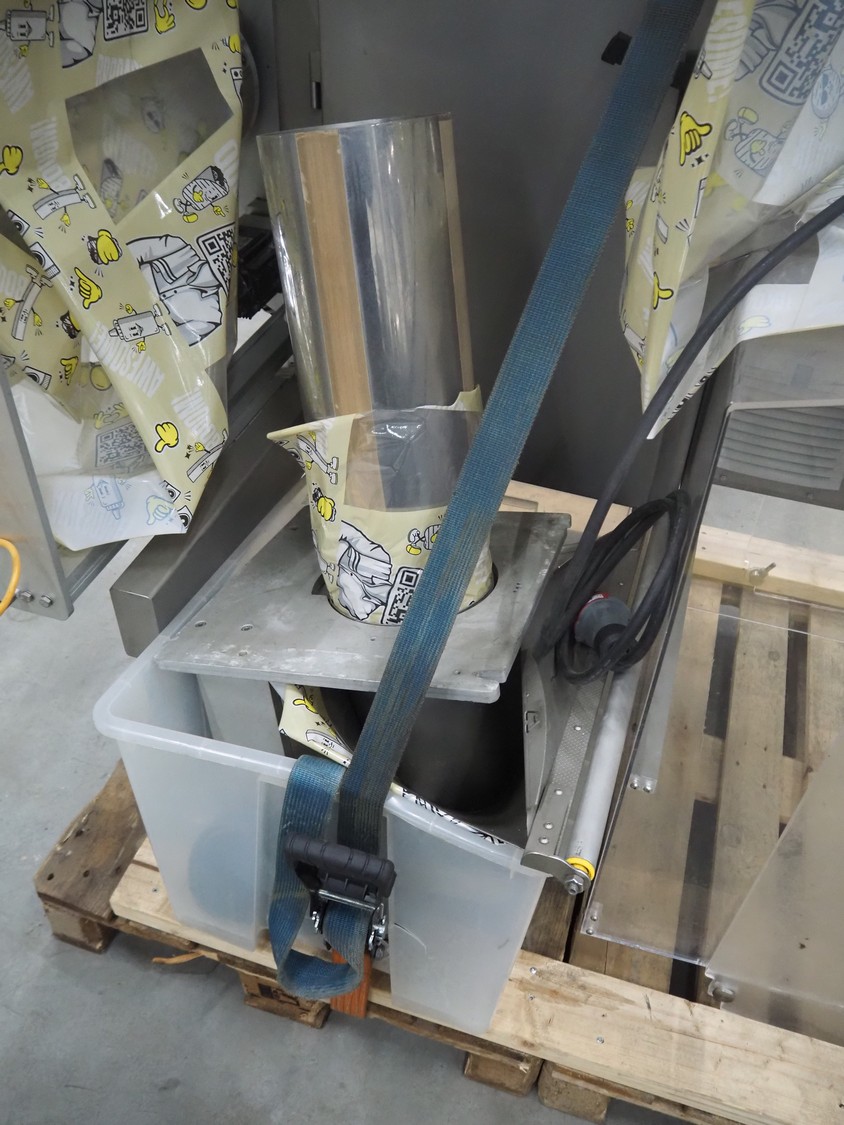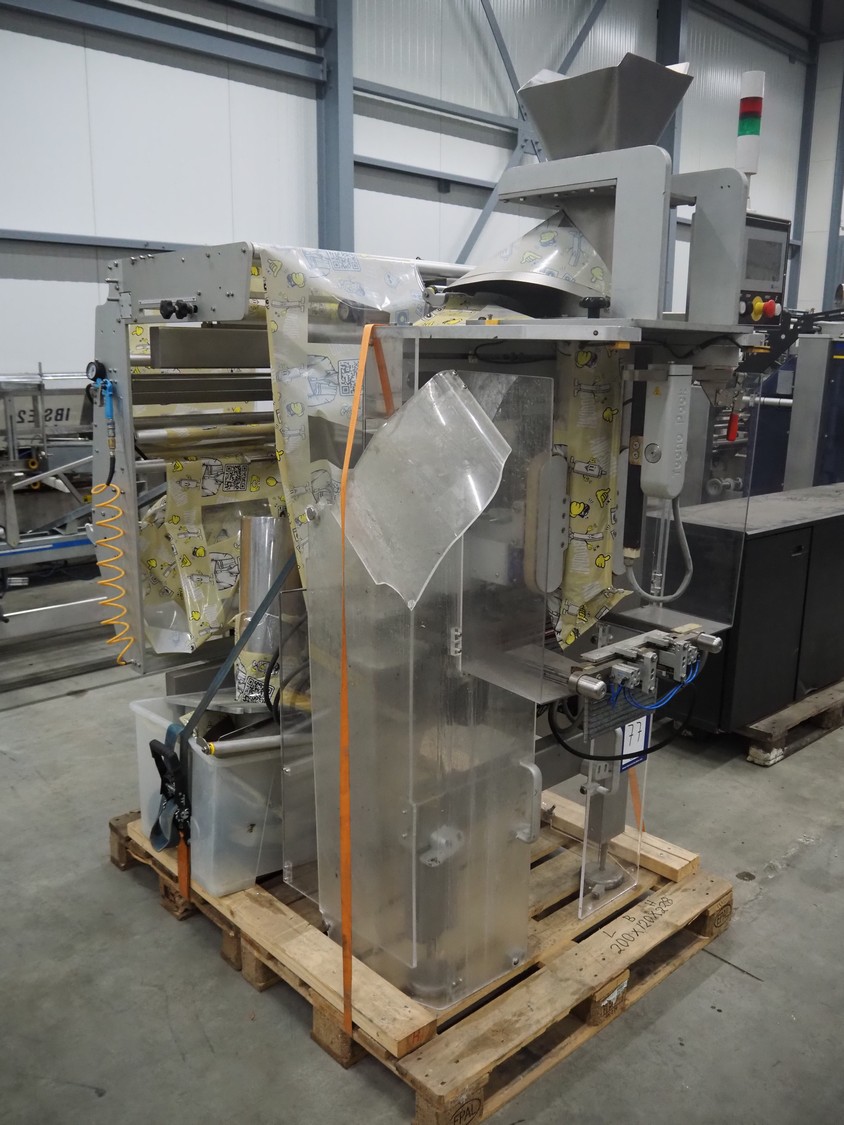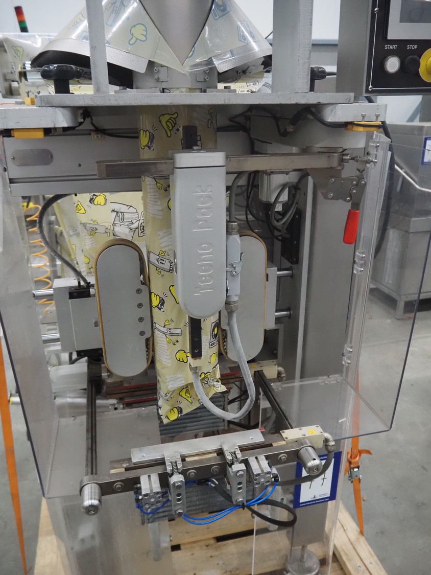 Tecno Pack vertical bag form-, fill-, and seal machine, model: FV-210, serial number: T2607, year of construction: 2015, 400 V, 50 Hz, 9 A, 6 kW, weight: 650 kg, film width: 505 mm, diameter filling pipe: 140 mm, vertical seal length: 420 mm, horizontal seal width: 280 mm, total dimensions: 1050 mm x 2000 mm x 2180 mm.