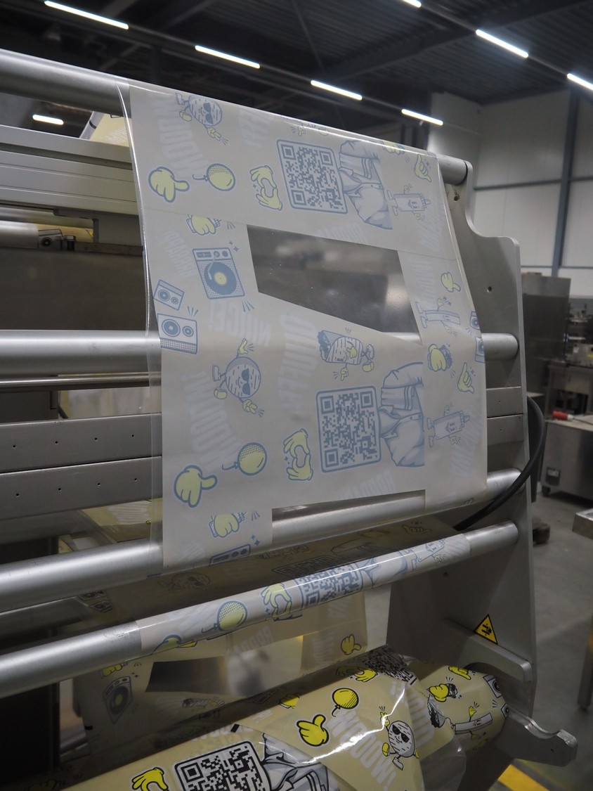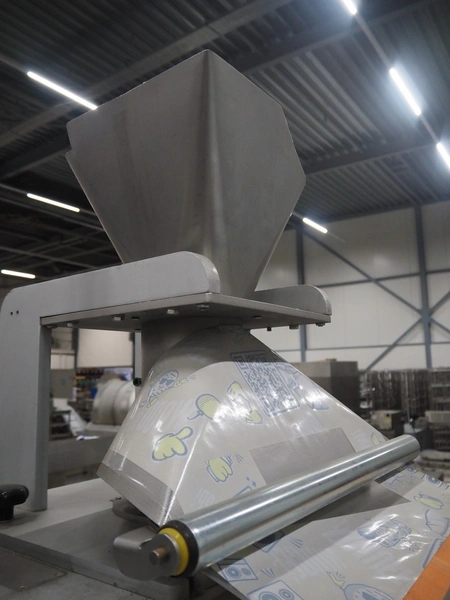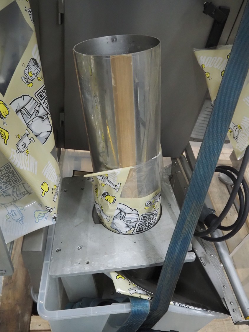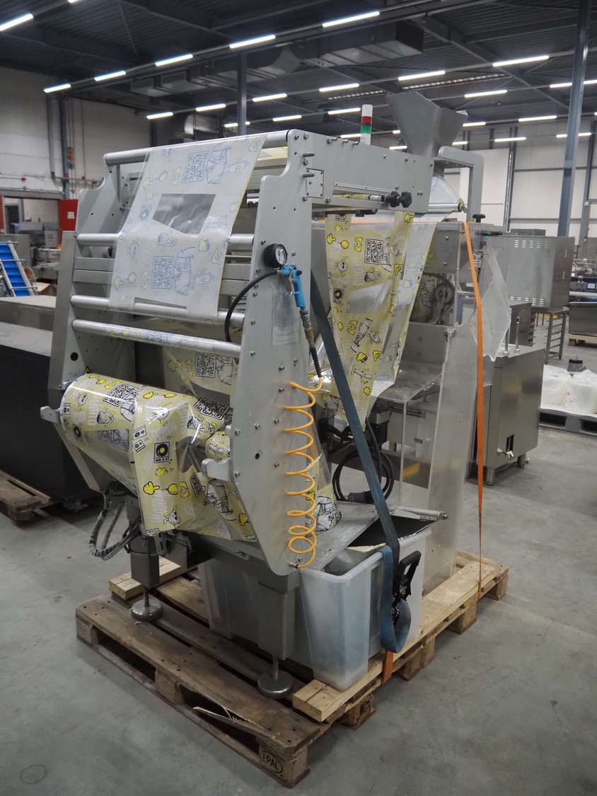 Tecno Pack vertical bag form-, fill-, and seal machine, model: FV-210, serial number: T2607, year of construction: 2015, 400 V, 50 Hz, 9 A, 6 kW, weight: 650 kg, film width: 505 mm, diameter filling pipe: 140 mm, vertical seal length: 420 mm, horizontal seal width: 280 mm, total dimensions: 1050 mm x 2000 mm x 2180 mm.