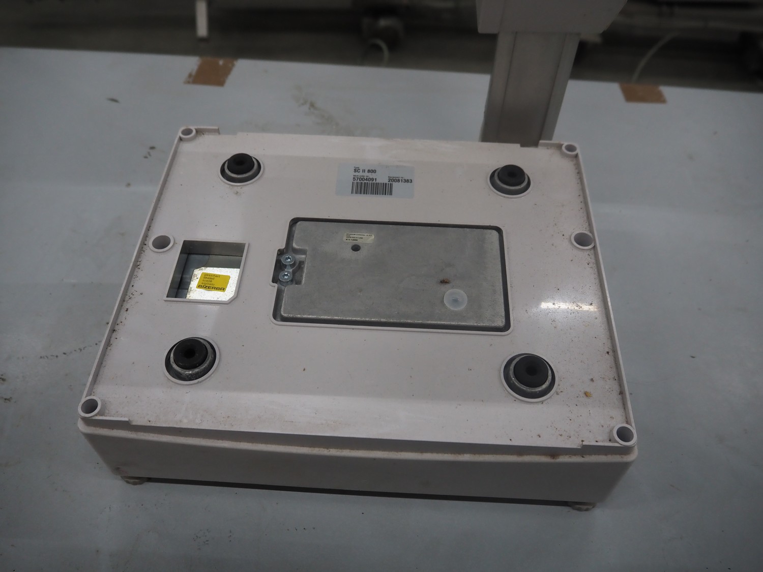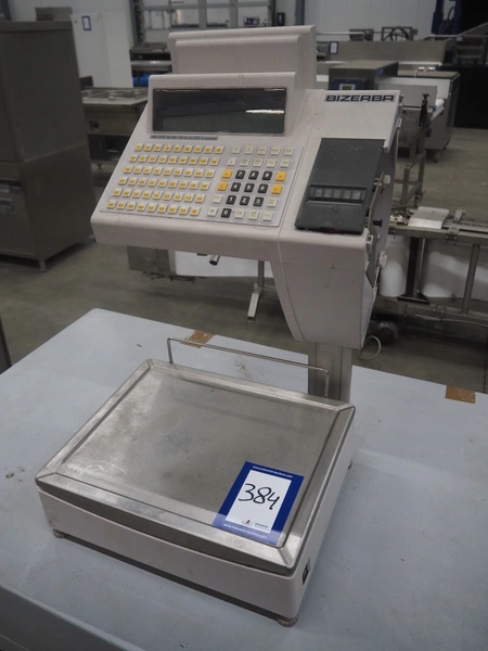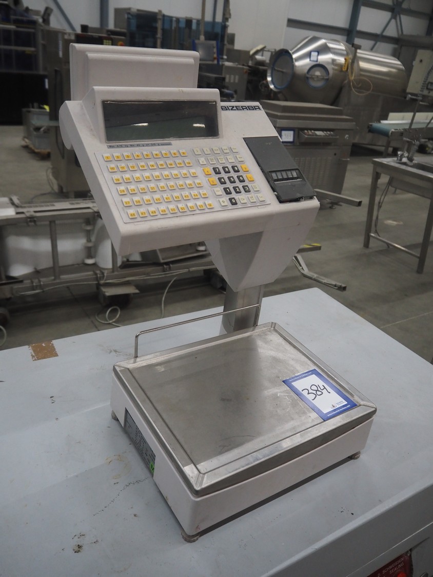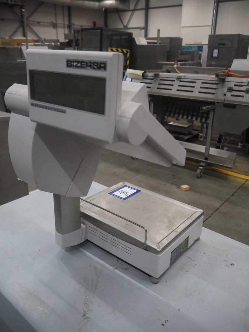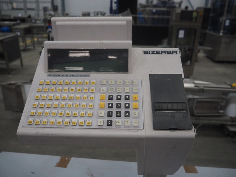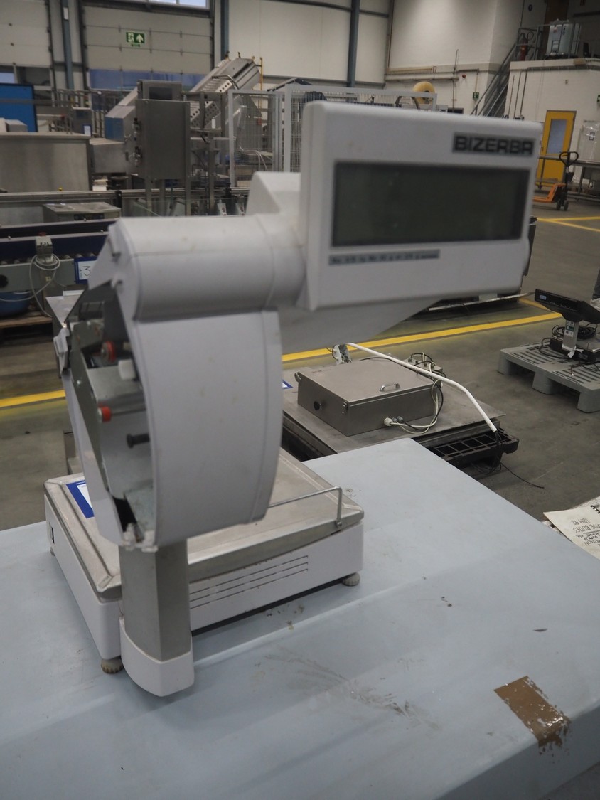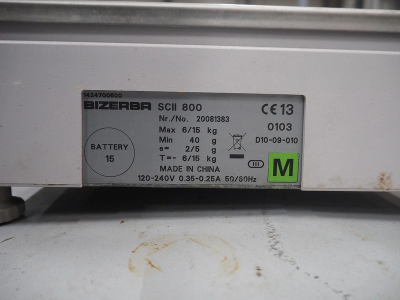 Bizerba weighing scale with indicator, model: SCII 800, number: 20081383, 120-240 V, 50/60 Hz, 0.35/0.25 A, maximum weight: 6/15 kg, minimum weight: 40 gram, e= 2/5 gram, dimensions: 500 mm x 360 mm x 560 mm.