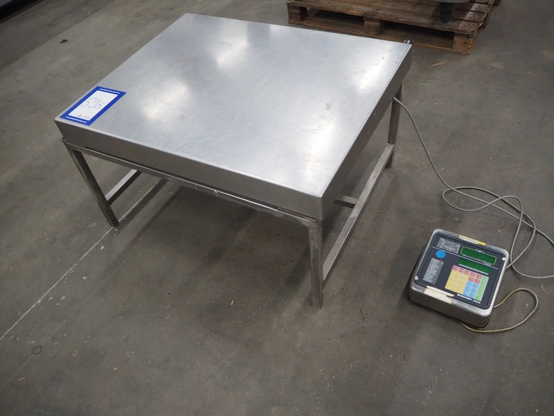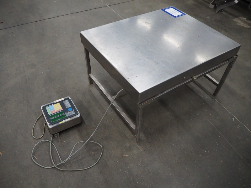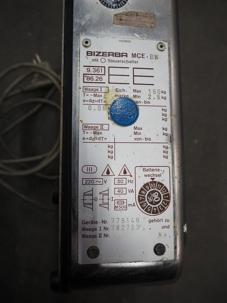 Weighing scale with Bizerba indicator, model: MCE-BW, maximum weight: 150 kg, minimum weight: 2.5 kg, dimensions: 1000 mm x 800 mm x 580 mm.