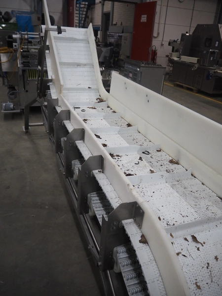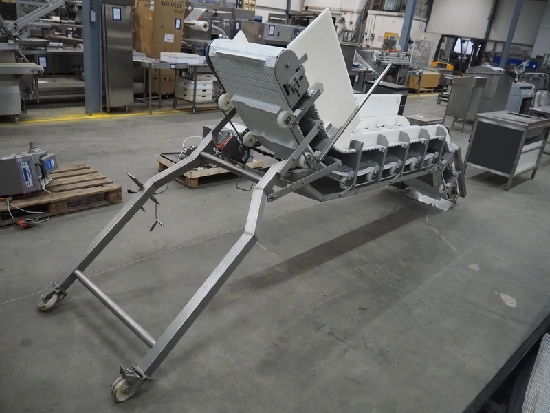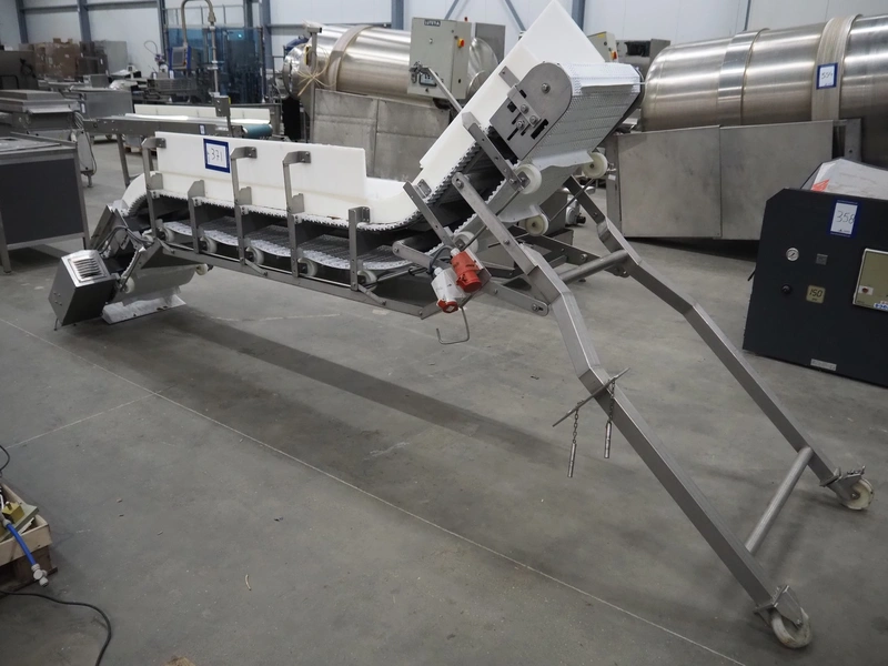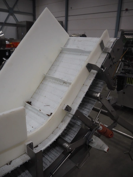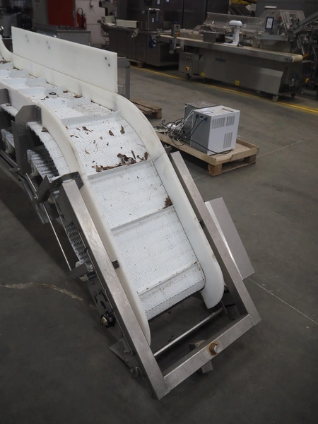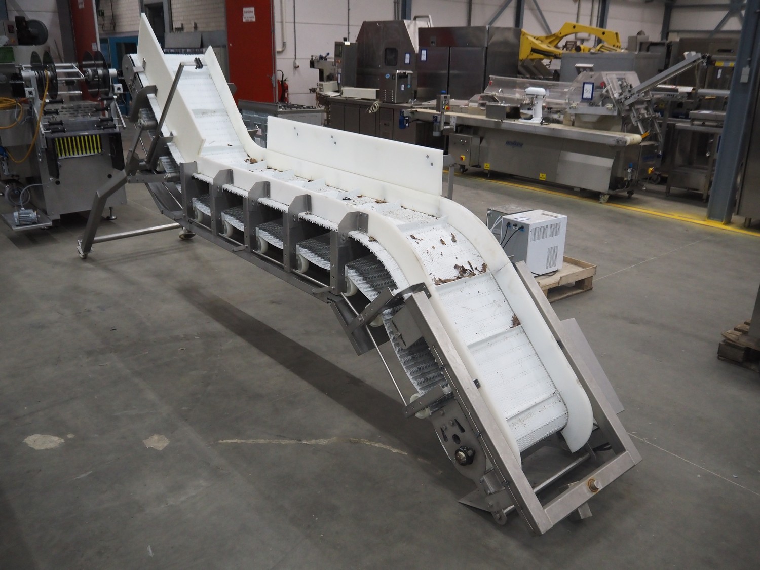 Mobile elevating belt with dividers, s/s frame, plastic belt, belt width: 550 mm, divider height: 50 mm, distance between dividers: 300 mm, total dimensions: 4500 mm x 950 mm x 1800 mm. Missing frame.