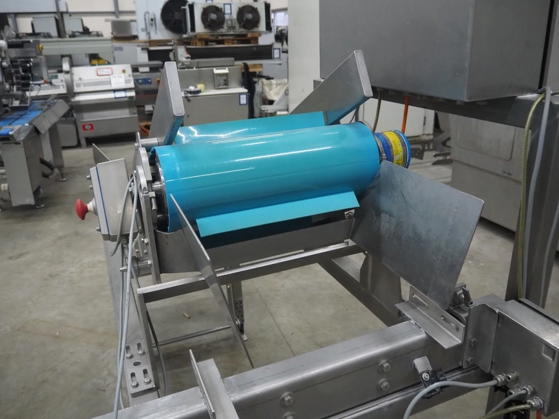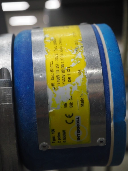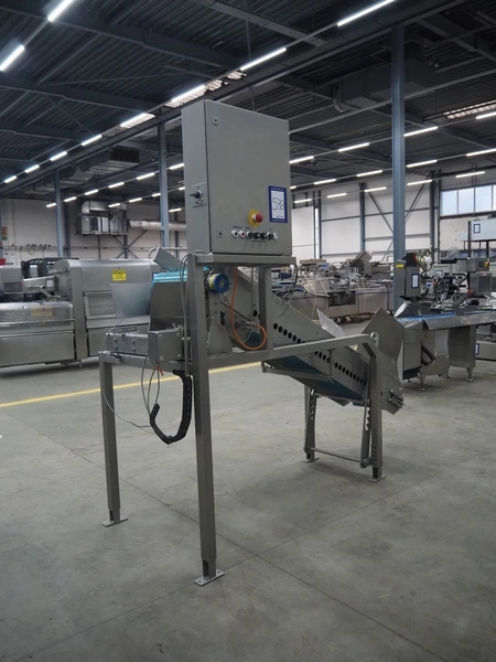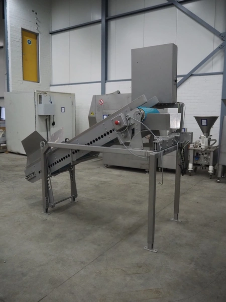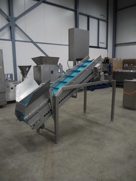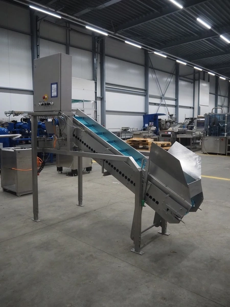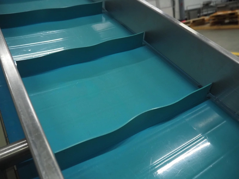 Elevating belt, plastic belt with dividers, belt width: 350 mm, dividers height: 40 mm, distance between dividers: 250 mm, elevating height: 1600 mm, total dimensions: 2600 mm x 1150 mm x 2470 mm.