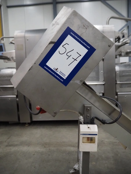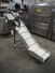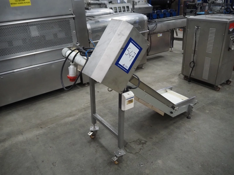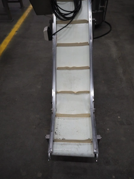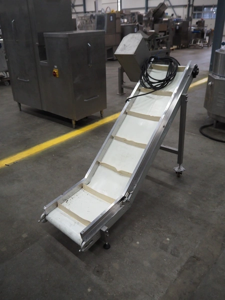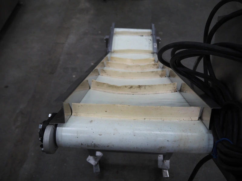 Mobile elevating belt, plastic belt with dividers, belt width: 360 mm, divider height: 40 mm, distance between dividers: 270 mm, elevating height: 1100 mm, total dimensions: 1600 mm x 750 mm x 1400 mm.